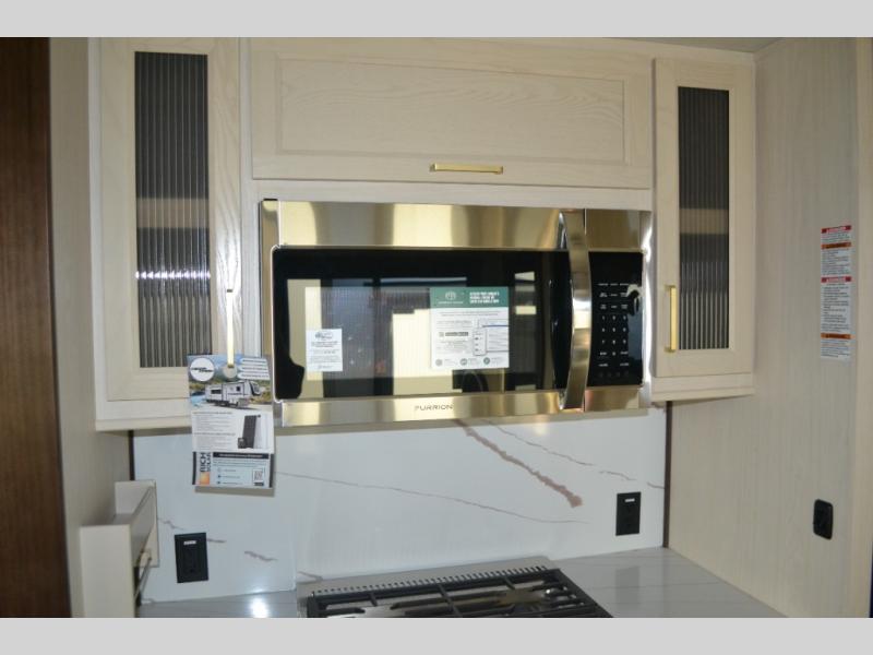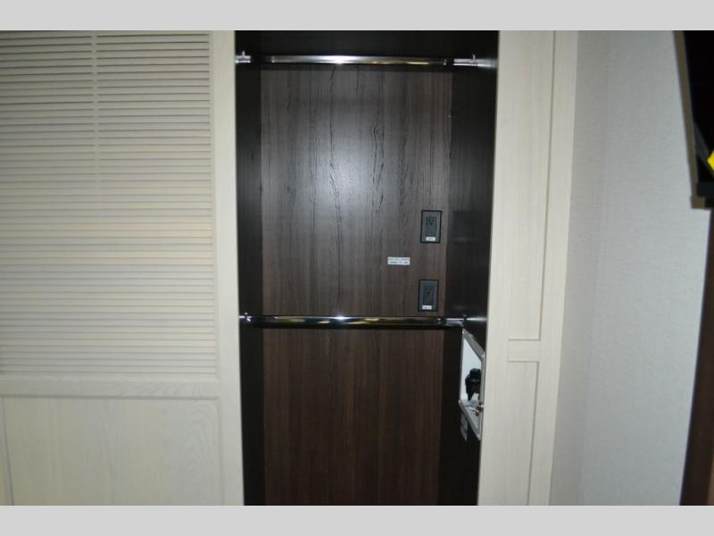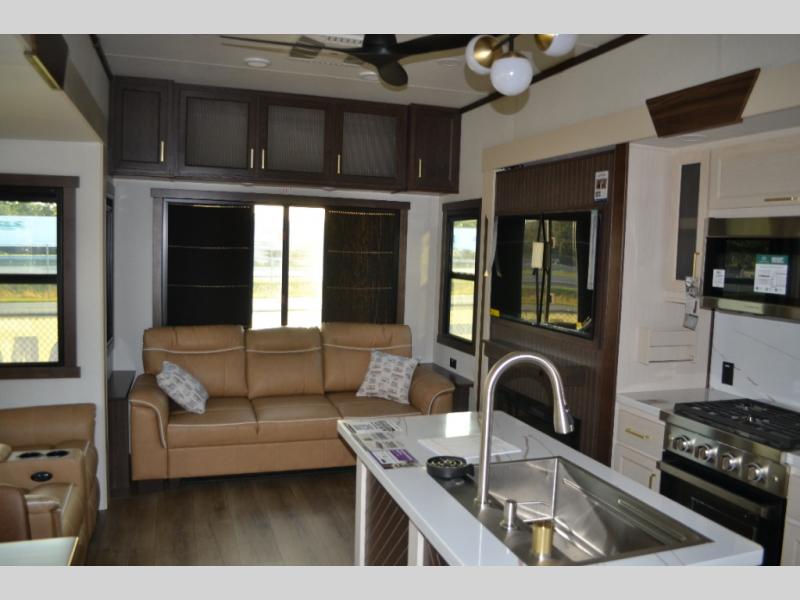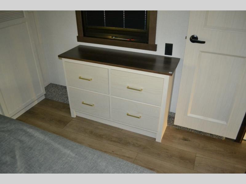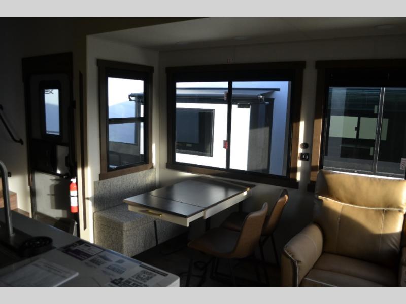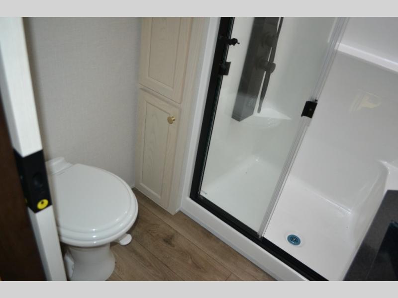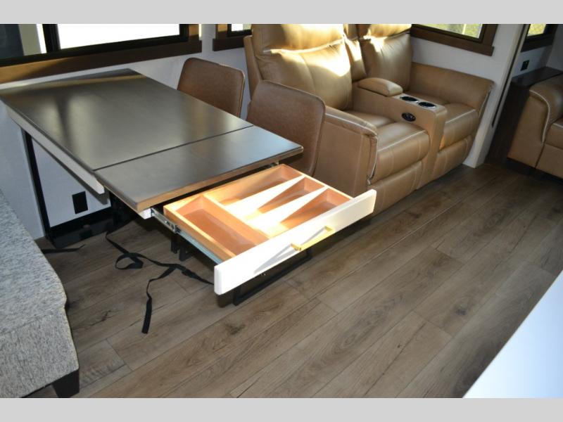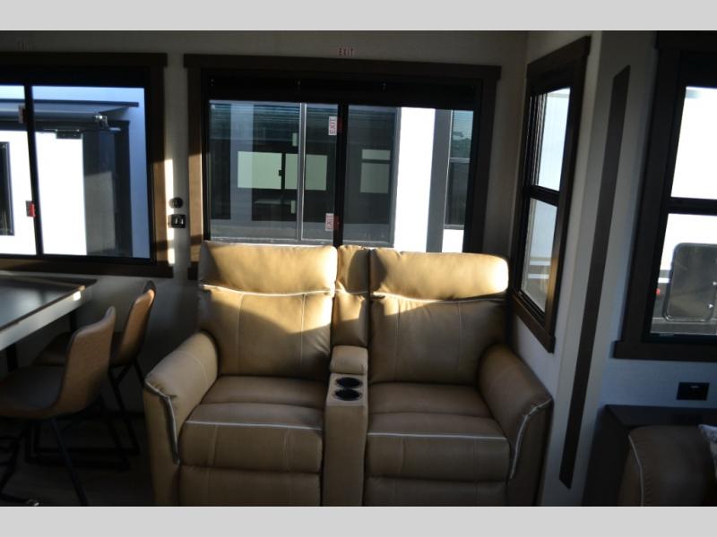 You will love this Cedar Creek Experience fifth wheel! The front bedroom is spacious with a king bed and a wardrobe that keeps on going, with room for hanging garments, shelves, and washer/dryer prep. There's also a standalone dresser with a TV above so you can watch some shows before bed. The bathroom also offers space efficiency with a sliding glass door, and the roomy shower even has a seat for your convenience while bathing. The rear of this unit feels wide open with a lovely living area and kitchen. The kitchen rivals the one at home, with a three-burner cooktop, microwave, and 18 cu. ft. 12V refrigerator with an ice maker. And check out the Murphy pantry that is hidden behind the entertainment center! You'll have tons of storage space with overhead cabinets and a pantry. The kitchen island with a spacious sink is the perfect final touch. After you eat you can relax and watch TV on the power theater seats or the hide-a-bed sofa. There is also a wall mounted dining table and extension with an ottoman for more seating space!