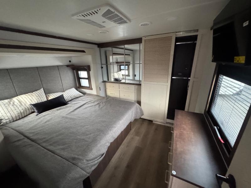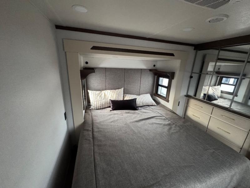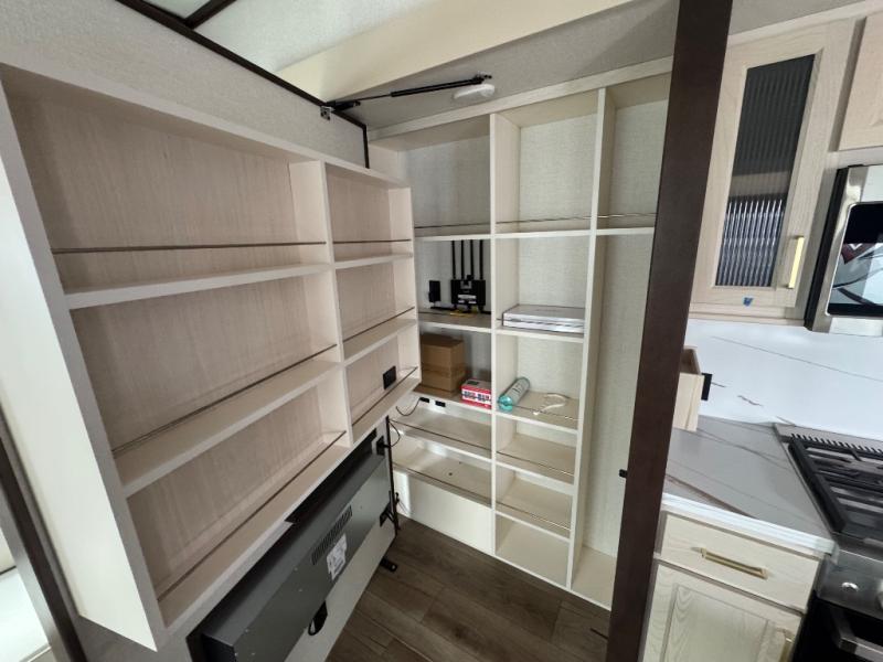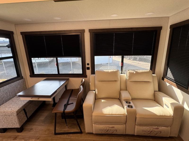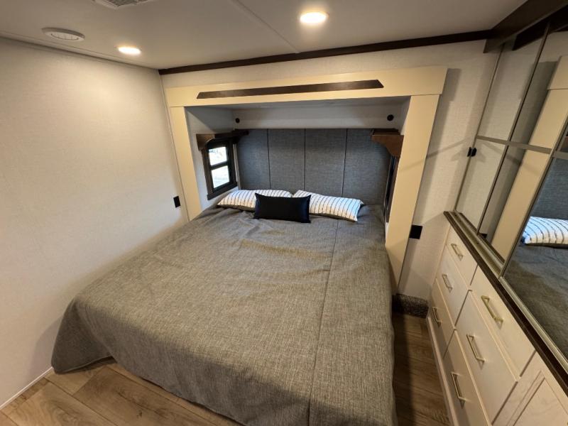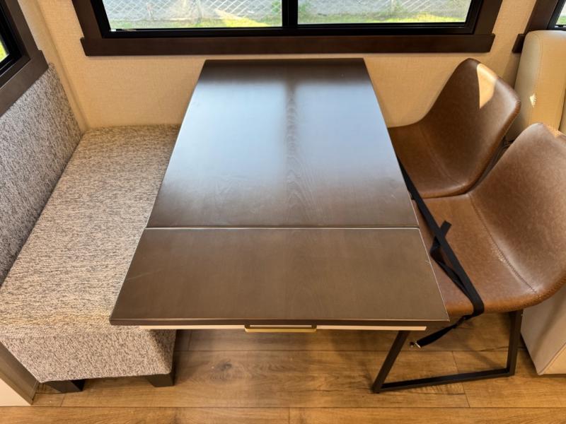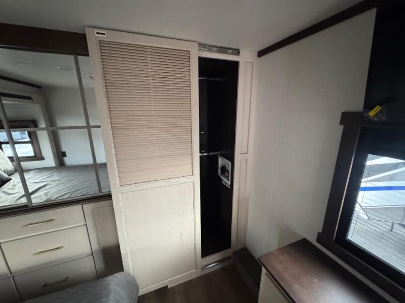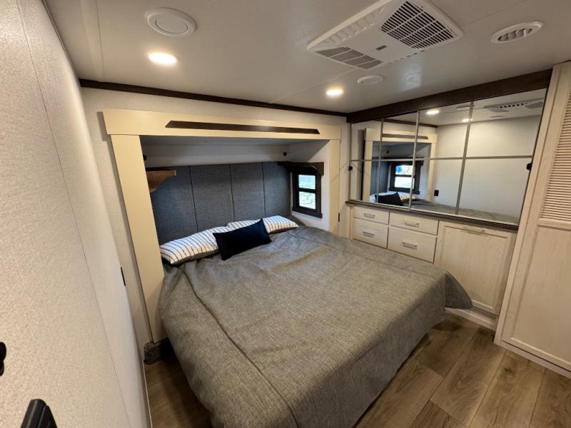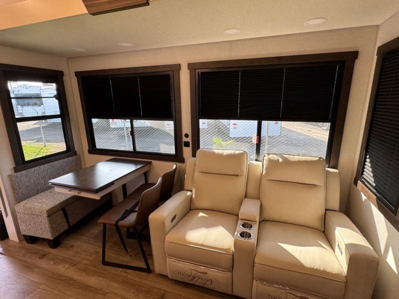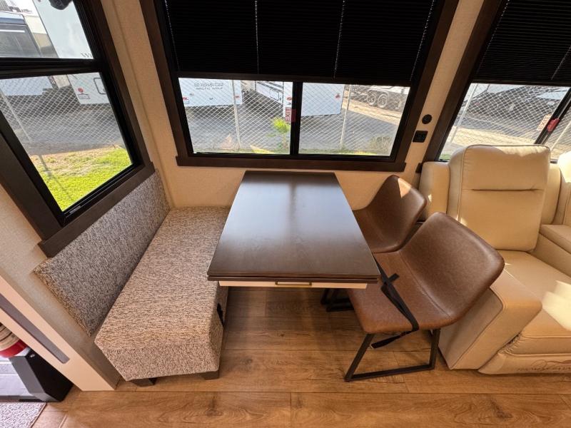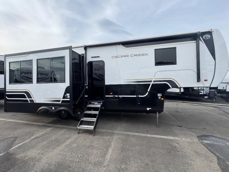 You will love this Cedar Creek Experience fifth wheel! The front bedroom is spacious with a king bed and a wardrobe that keeps on going, with room for hanging garments, shelves, and washer/dryer prep. There's also a standalone dresser with a TV above so you can watch some shows before bed. The bathroom also offers space efficiency with a sliding glass door, and the roomy shower even has a seat for your convenience while bathing. The rear of this unit feels wide open with a lovely living area and kitchen. The kitchen rivals the one at home, with a three-burner cooktop, microwave, and 18 cu. ft. 12V refrigerator with an ice maker. And check out the Murphy pantry that is hidden behind the entertainment center! You'll have tons of storage space with overhead cabinets and a pantry. The kitchen island with a spacious sink is the perfect final touch. After you eat you can relax and watch TV on the power theater seats or the hide-a-bed sofa. There is also a wall mounted dining table and extension with an ottoman for more seating space!