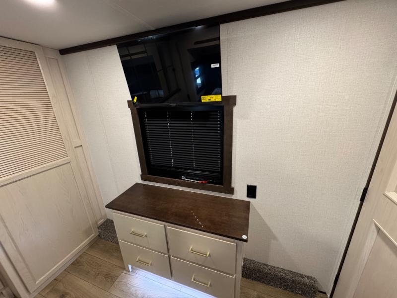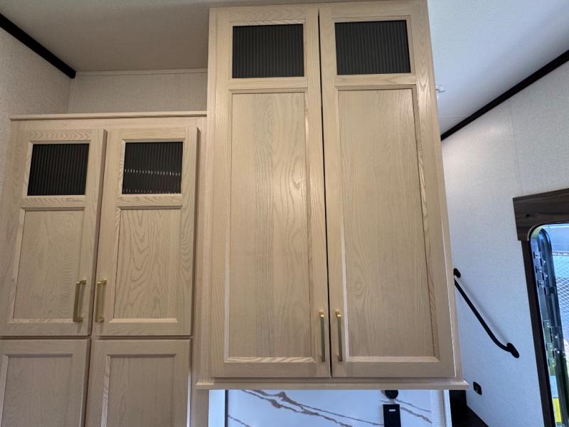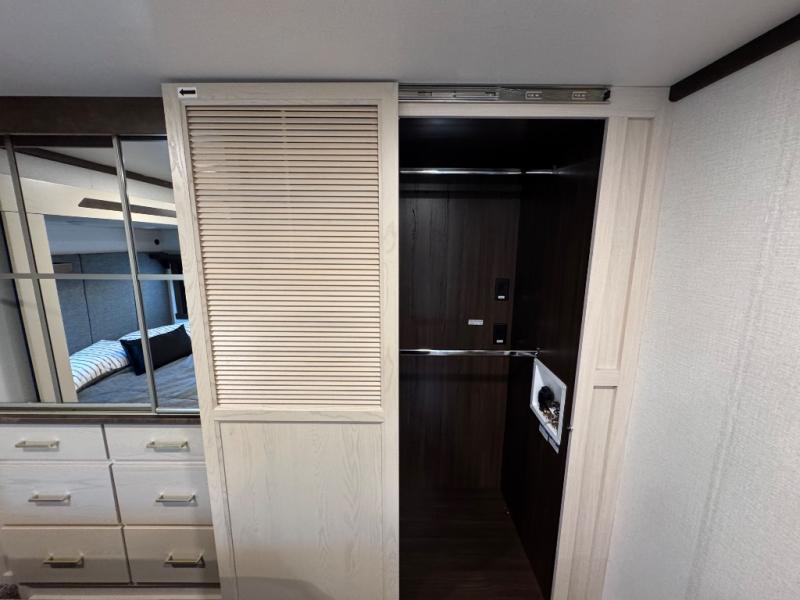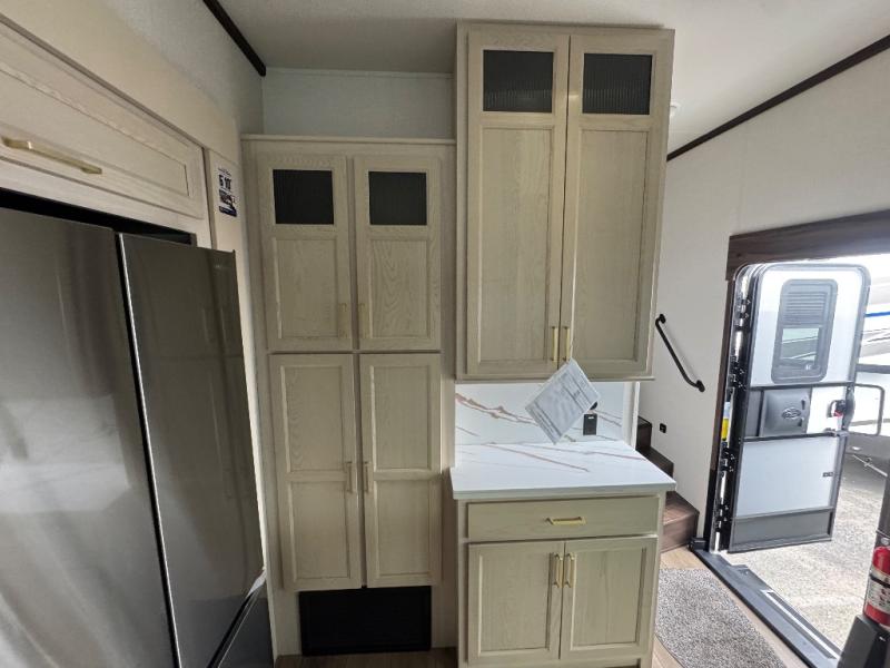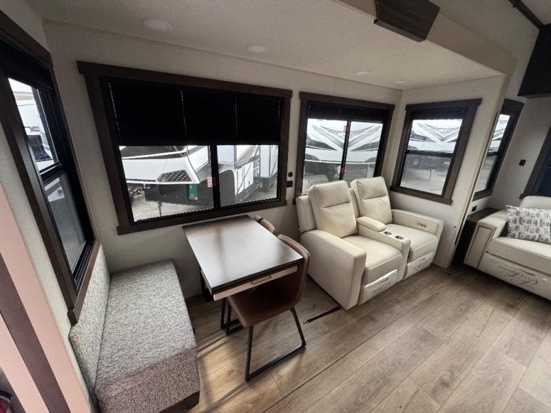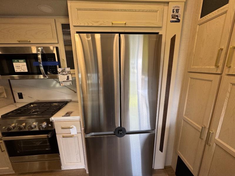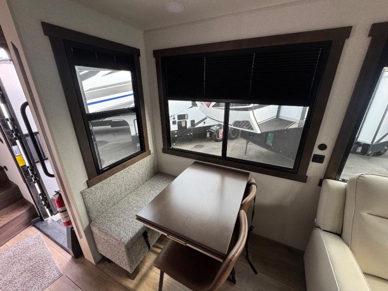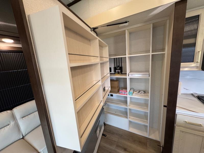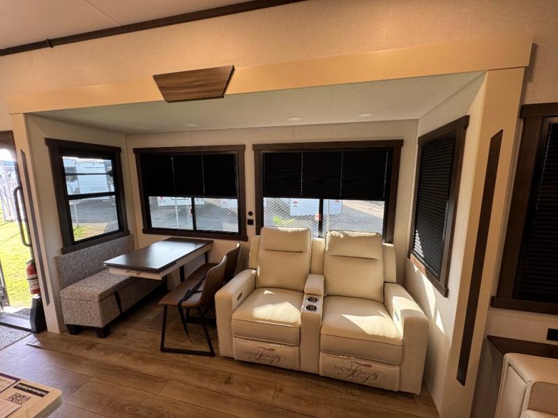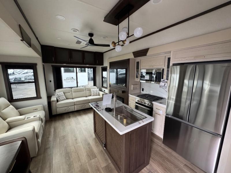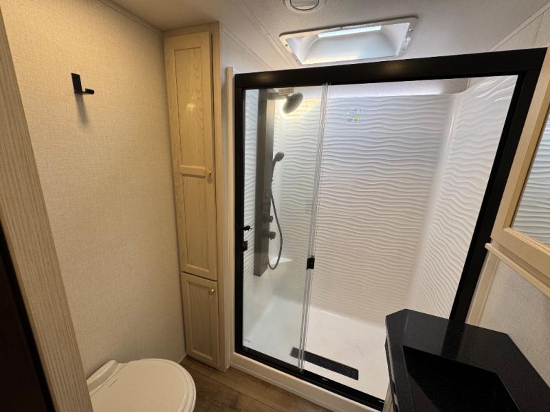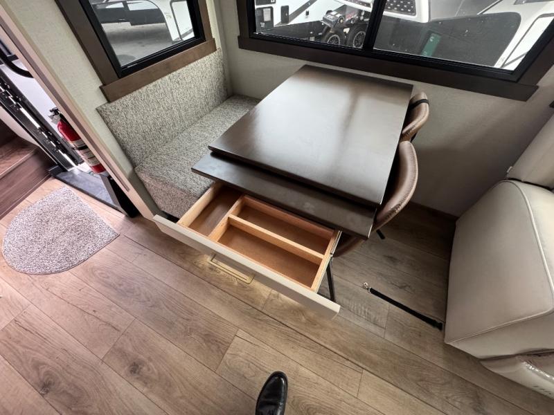 You will love this Cedar Creek Experience fifth wheel! The front bedroom is spacious with a king bed and a wardrobe that keeps on going, with room for hanging garments, shelves, and washer/dryer prep. There's also a standalone dresser with a TV above so you can watch some shows before bed. The bathroom also offers space efficiency with a sliding glass door, and the roomy shower even has a seat for your convenience while bathing. The rear of this unit feels wide open with a lovely living area and kitchen. The kitchen rivals the one at home, with a three-burner cooktop, microwave, and 18 cu. ft. 12V refrigerator with an ice maker. And check out the Murphy pantry that is hidden behind the entertainment center! You'll have tons of storage space with overhead cabinets and a pantry. The kitchen island with a spacious sink is the perfect final touch. After you eat you can relax and watch TV on the power theater seats or the hide-a-bed sofa. There is also a wall mounted dining table and extension with an ottoman for more seating space!