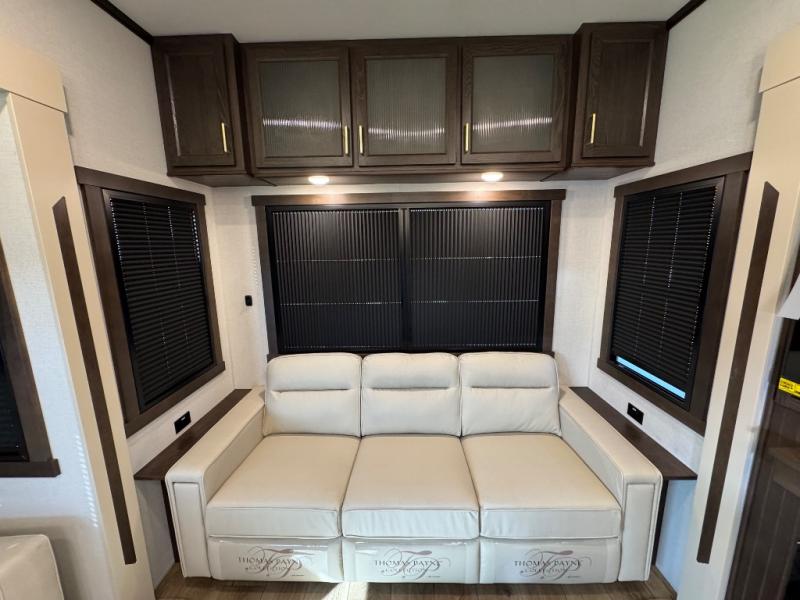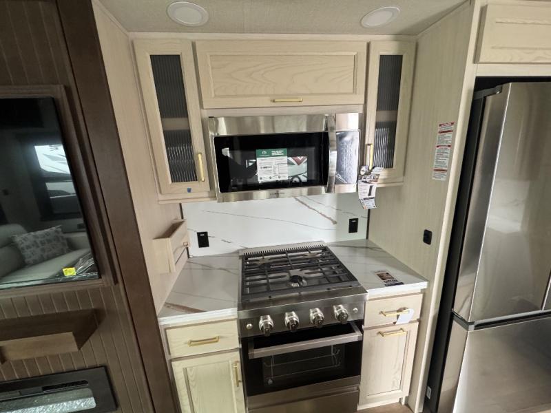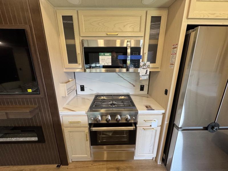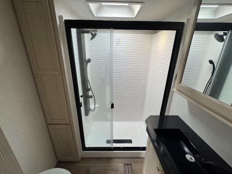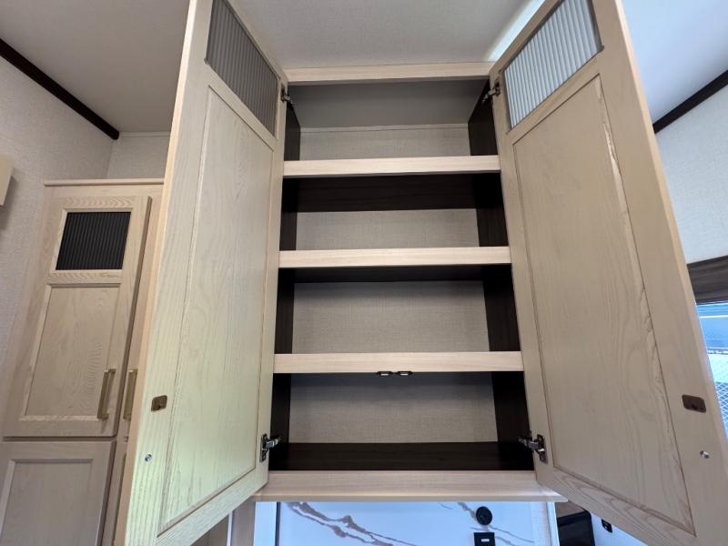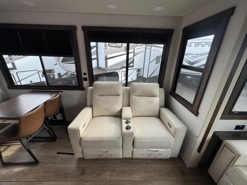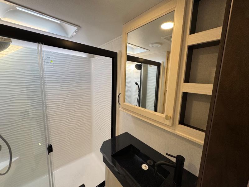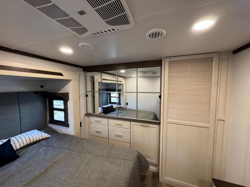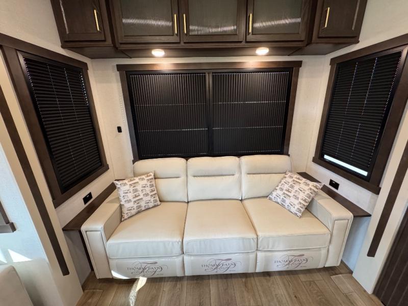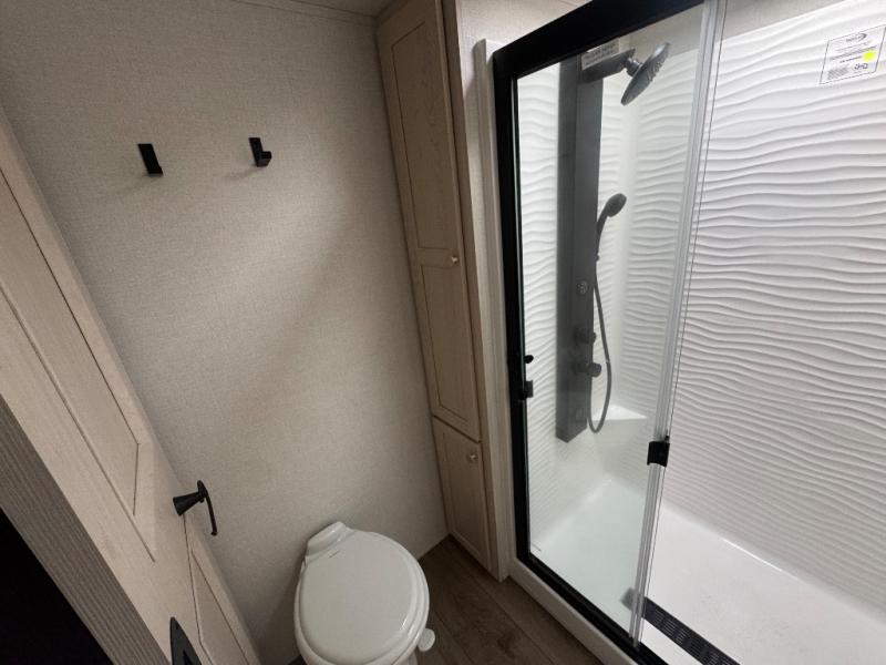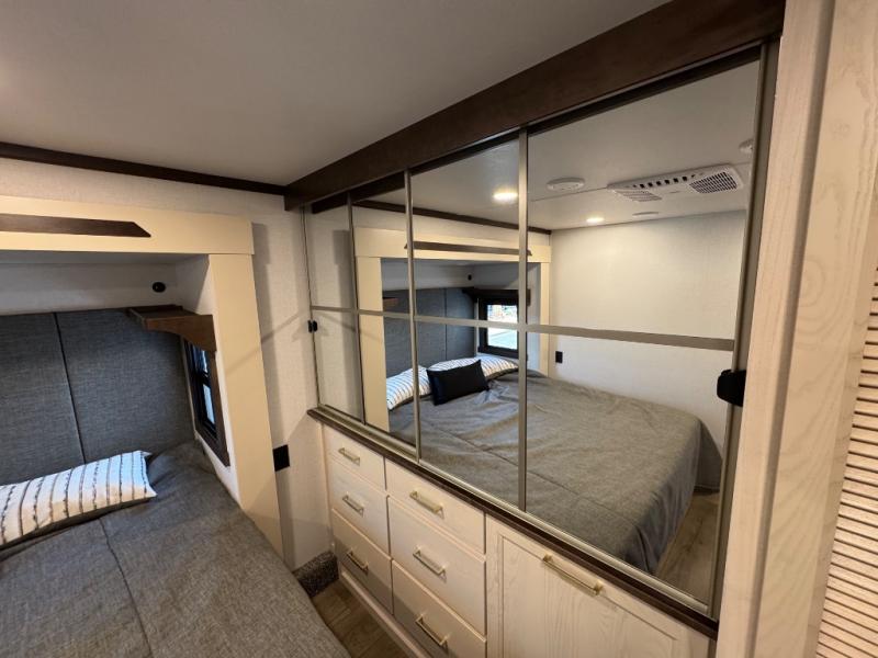 You will love this Cedar Creek Experience fifth wheel! The front bedroom is spacious with a king bed and a wardrobe that keeps on going, with room for hanging garments, shelves, and washer/dryer prep. There's also a standalone dresser with a TV above so you can watch some shows before bed. The bathroom also offers space efficiency with a sliding glass door, and the roomy shower even has a seat for your convenience while bathing. The rear of this unit feels wide open with a lovely living area and kitchen. The kitchen rivals the one at home, with a three-burner cooktop, microwave, and 18 cu. ft. 12V refrigerator with an ice maker. And check out the Murphy pantry that is hidden behind the entertainment center! You'll have tons of storage space with overhead cabinets and a pantry. The kitchen island with a spacious sink is the perfect final touch. After you eat you can relax and watch TV on the power theater seats or the hide-a-bed sofa. There is also a wall mounted dining table and extension with an ottoman for more seating space!