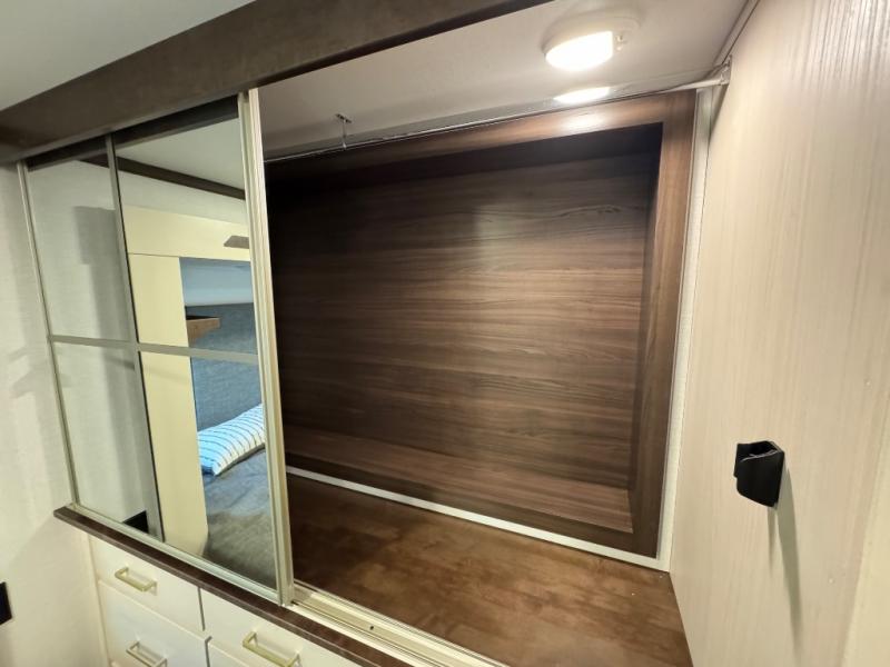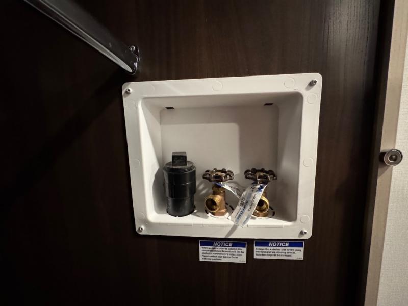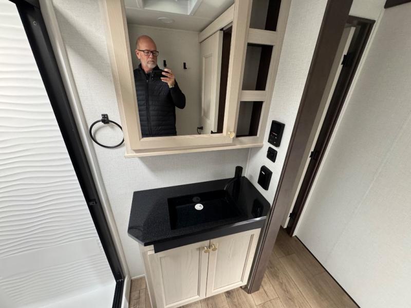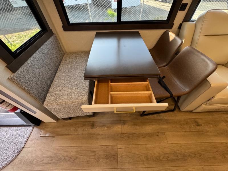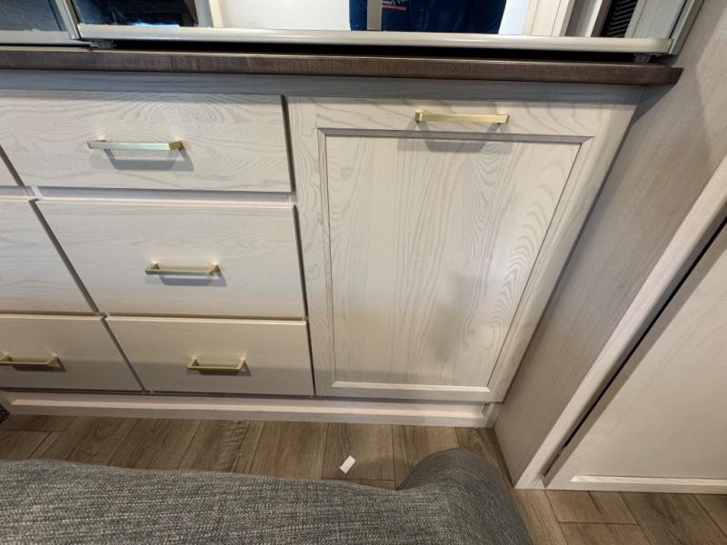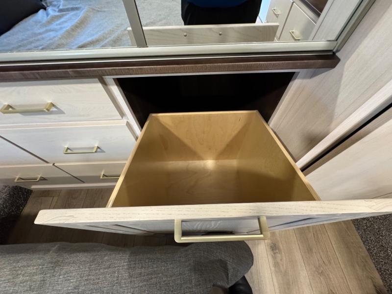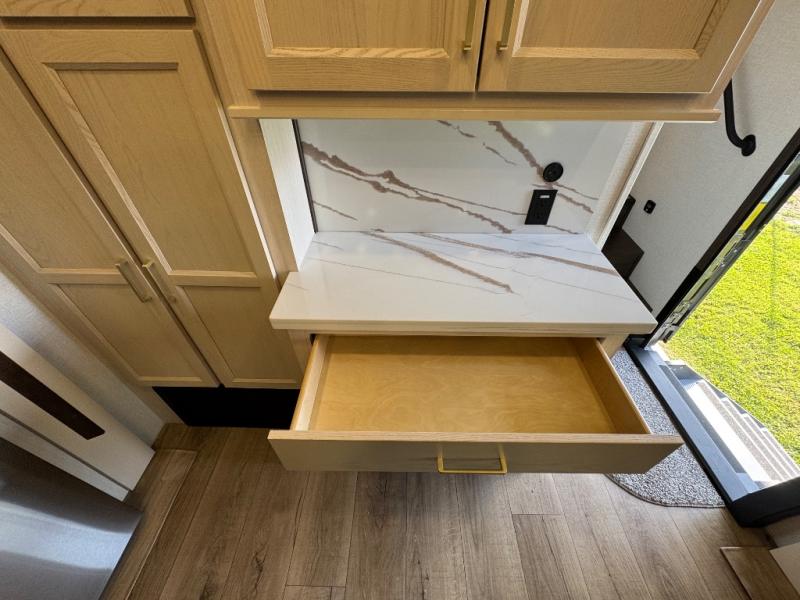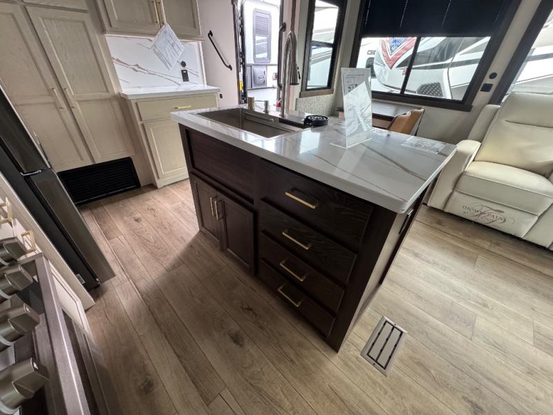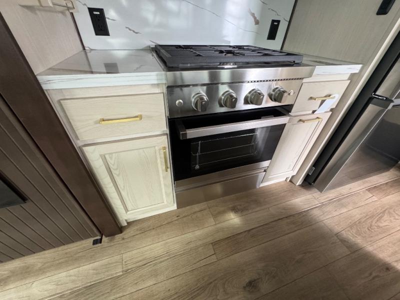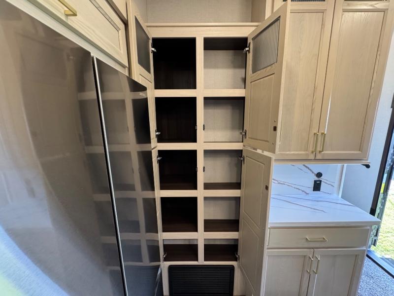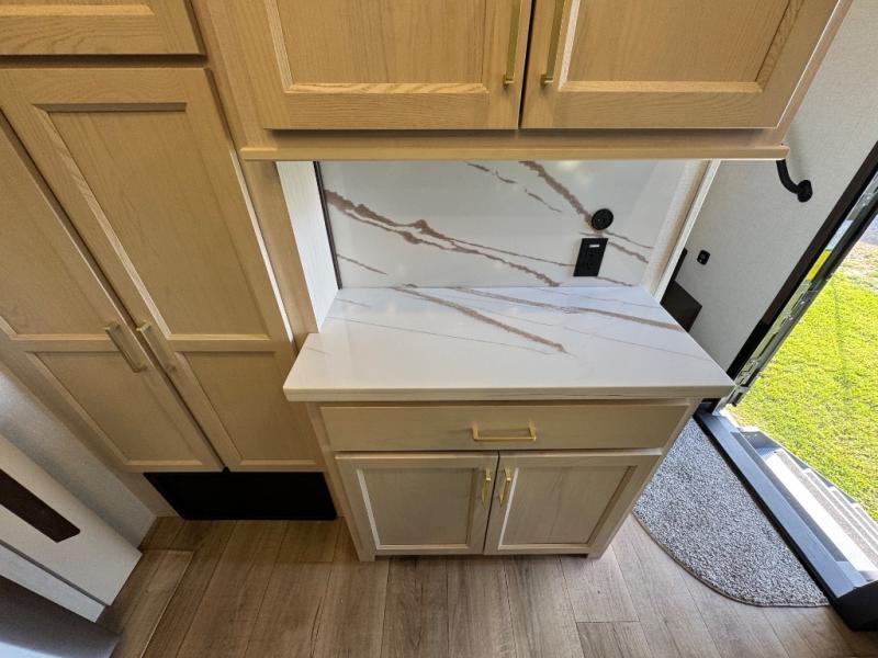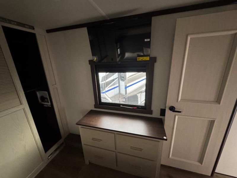 You will love this Cedar Creek Experience fifth wheel! The front bedroom is spacious with a king bed and a wardrobe that keeps on going, with room for hanging garments, shelves, and washer/dryer prep. There's also a standalone dresser with a TV above so you can watch some shows before bed. The bathroom also offers space efficiency with a sliding glass door, and the roomy shower even has a seat for your convenience while bathing. The rear of this unit feels wide open with a lovely living area and kitchen. The kitchen rivals the one at home, with a three-burner cooktop, microwave, and 18 cu. ft. 12V refrigerator with an ice maker. And check out the Murphy pantry that is hidden behind the entertainment center! You'll have tons of storage space with overhead cabinets and a pantry. The kitchen island with a spacious sink is the perfect final touch. After you eat you can relax and watch TV on the power theater seats or the hide-a-bed sofa. There is also a wall mounted dining table and extension with an ottoman for more seating space!