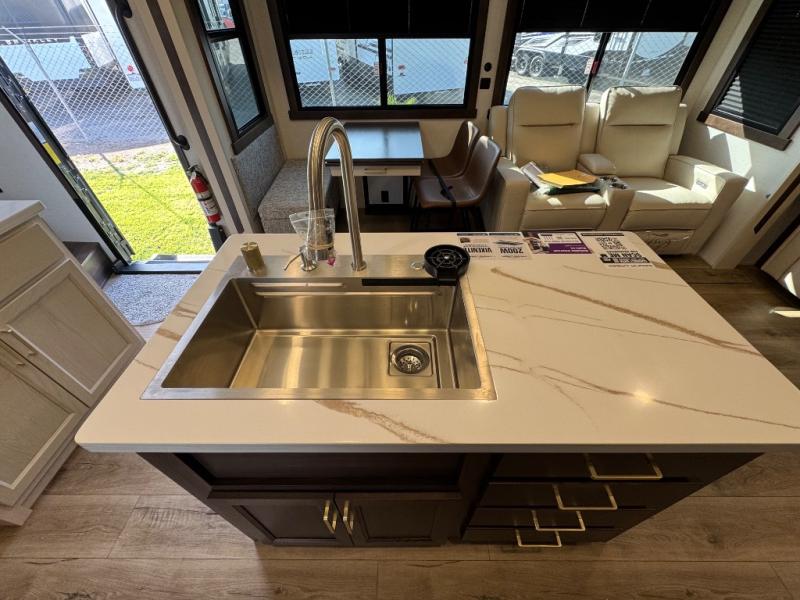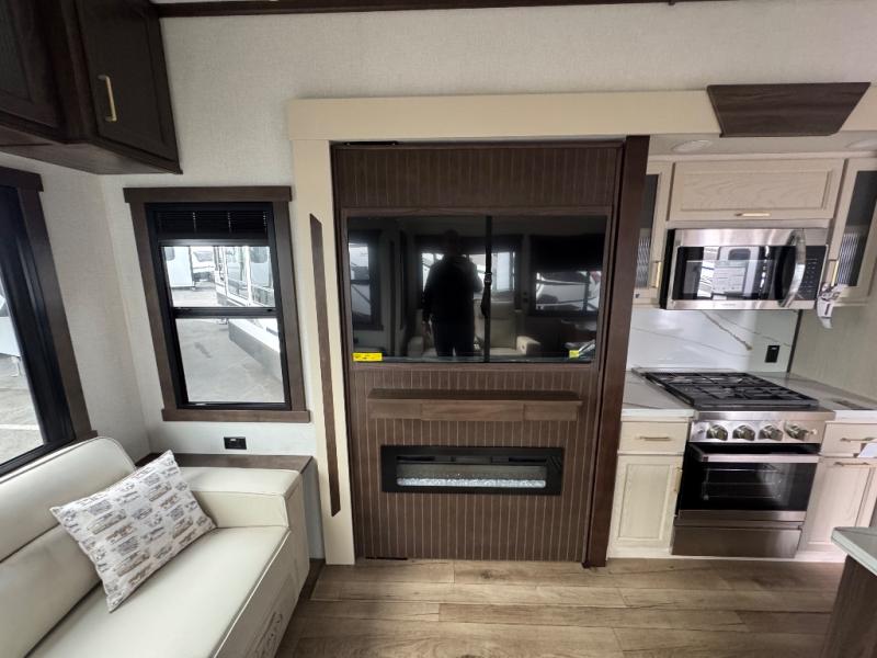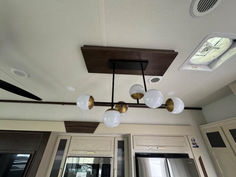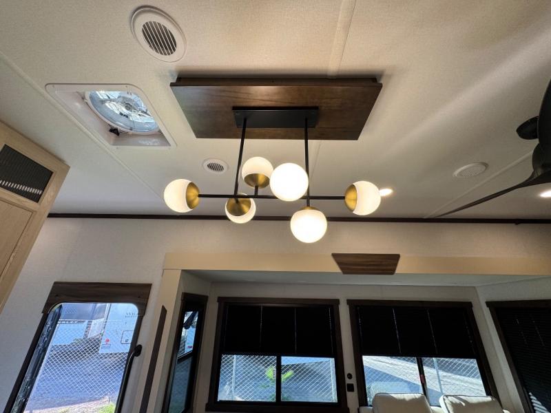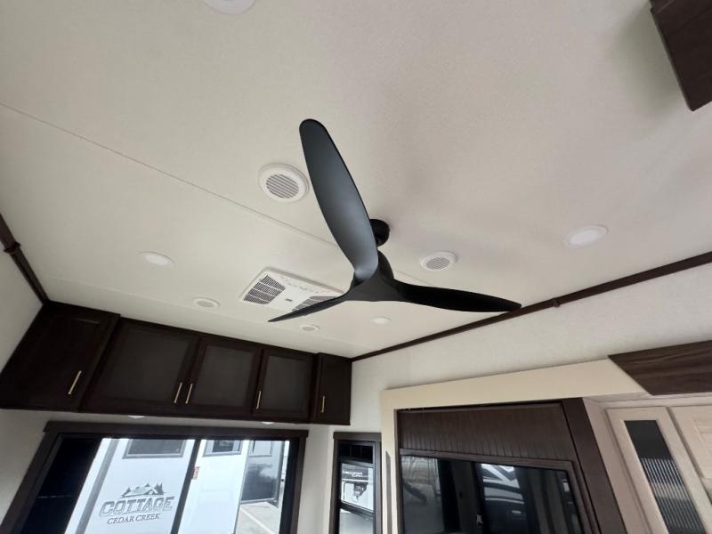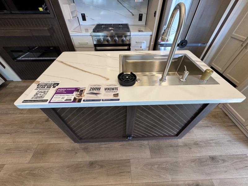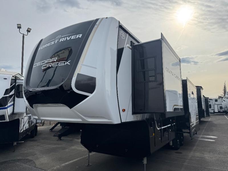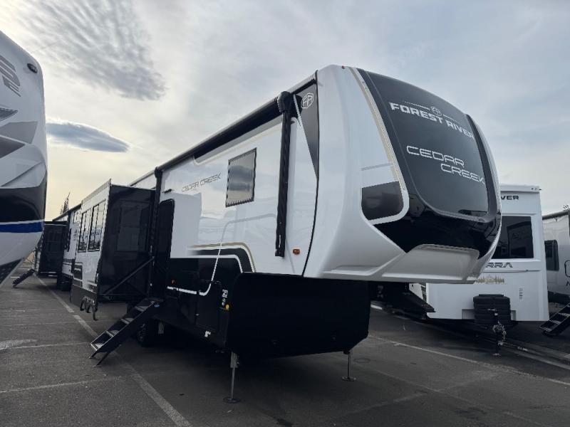 With any Cedar Creek Experience fifth wheel by Forest River, you will bet met with luxury features both inside and out! The True Gelcoat exterior is the best of the best in exteriors and the 3M bonded sidewalls will hold up over years of use. There is also a new 101'' wide-body frame, a Road Warrior suspension, plus a TST tire pressure monitoring system to make towing that much easier. You will find a hidden front storage compartment, along with a 4' x 6' ABS, ribbed, removable underbelly panels, and 6-point hydraulic leveling system, plus many more exterior conveniences. The interior will have you feeling like you haven't left home with vinyl floor coverings, power theater seating with USB ports, a cozy fireplace, vinyl floor covering and the list of comforts goes on! Each model is also pre-wired for satellite to the roof, and you're sure to never go bored with a Smart TV in the bedroom!