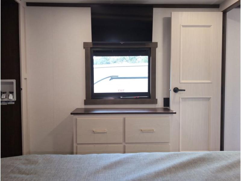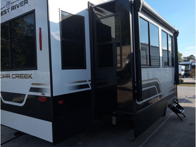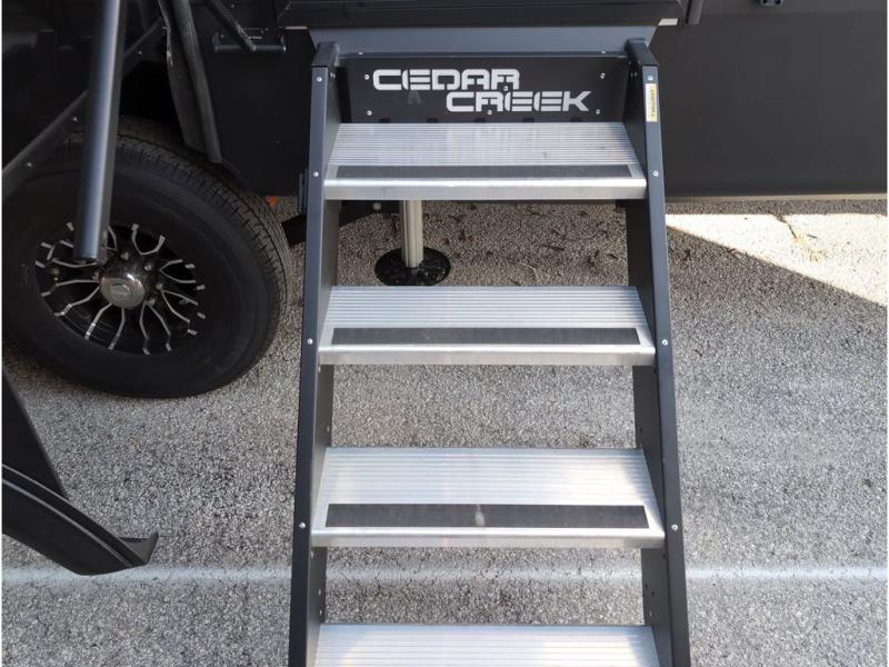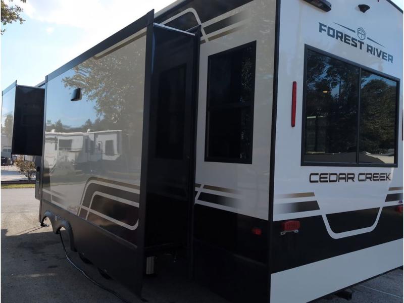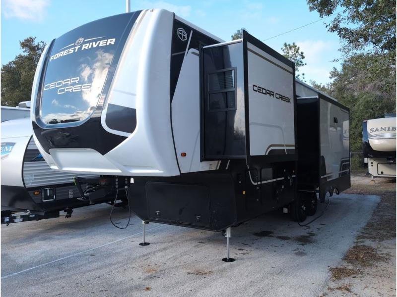 With any Cedar Creek Experience fifth wheel by Forest River, you will bet met with luxury features both inside and out! The True Gelcoat exterior is the best of the best in exteriors and the 3M bonded sidewalls will hold up over years of use. There is also a new 101'' wide-body frame, a Road Warrior suspension, plus a TST tire pressure monitoring system to make towing that much easier. You will find a hidden front storage compartment, along with a 4' x 6' ABS, ribbed, removable underbelly panels, and 6-point hydraulic leveling system, plus many more exterior conveniences. The interior will have you feeling like you haven't left home with vinyl floor coverings, power theater seating with USB ports, a cozy fireplace, vinyl floor covering and the list of comforts goes on! Each model is also pre-wired for satellite to the roof, and you're sure to never go bored with a Smart TV in the bedroom!
