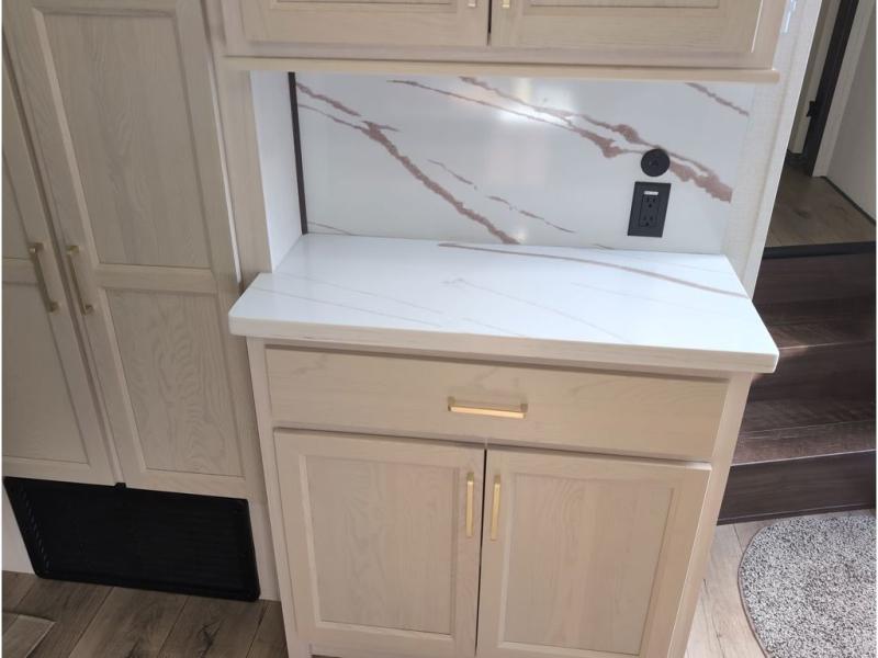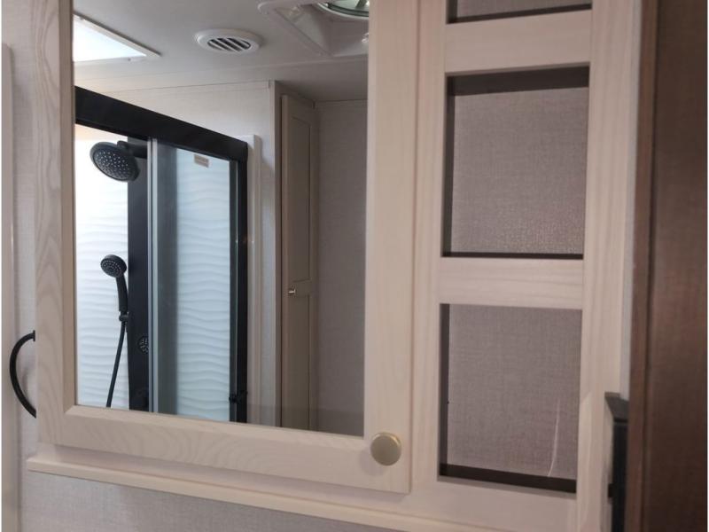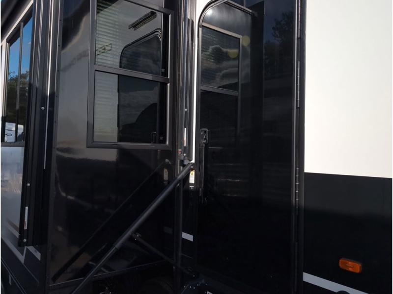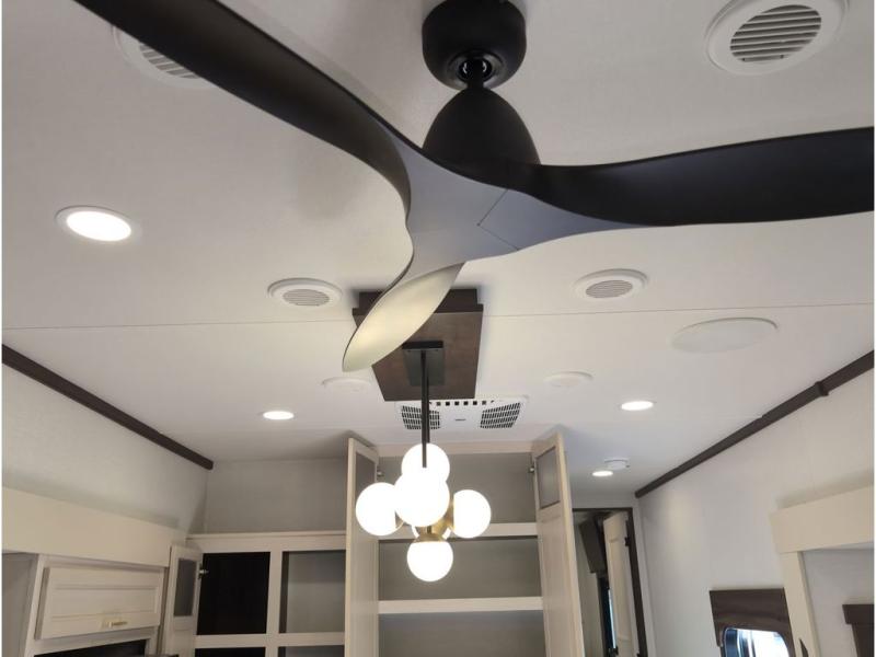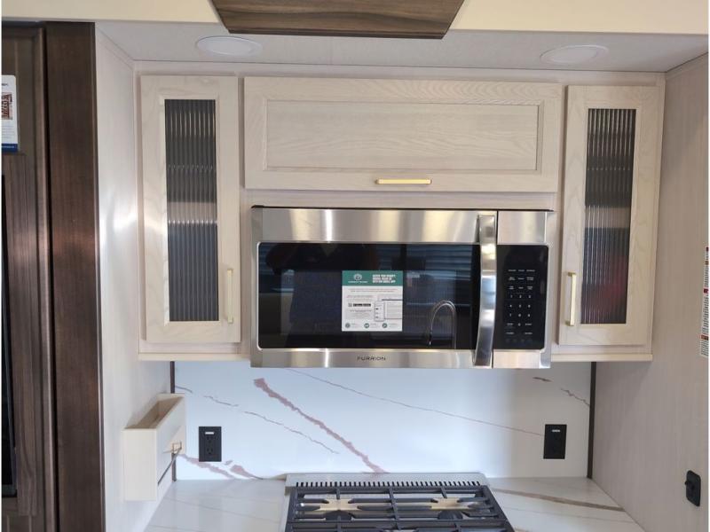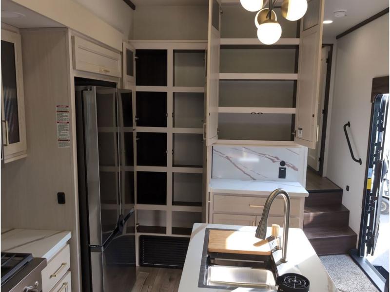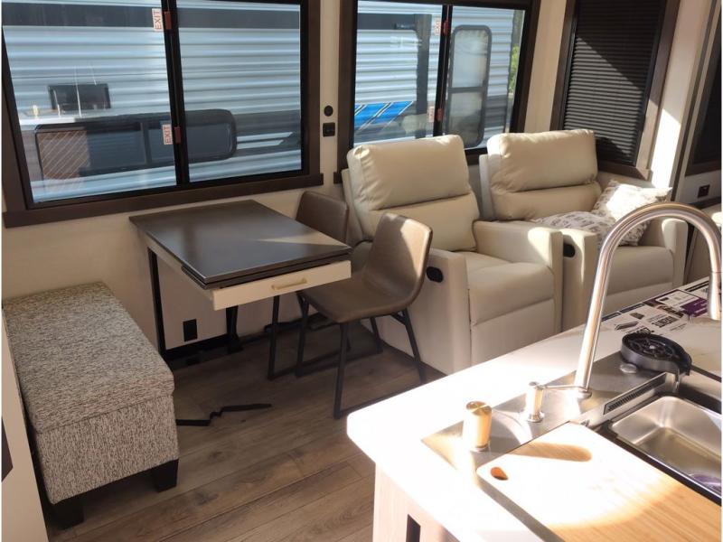 You will love this Cedar Creek Experience fifth wheel! The front bedroom is spacious with a king bed and a wardrobe that keeps on going, with room for hanging garments, shelves, and washer/dryer prep. There's also a standalone dresser with a TV above so you can watch some shows before bed. The bathroom also offers space efficiency with a sliding glass door, and the roomy shower even has a seat for your convenience while bathing. The rear of this unit feels wide open with a lovely living area and kitchen. The kitchen rivals the one at home, with a three-burner cooktop, microwave, and 18 cu. ft. 12V refrigerator with an ice maker. And check out the Murphy pantry that is hidden behind the entertainment center! You'll have tons of storage space with overhead cabinets and a pantry. The kitchen island with a spacious sink is the perfect final touch. After you eat you can relax and watch TV on the power theater seats or the hide-a-bed sofa. There is also a wall mounted dining table and extension with an ottoman for more seating space!