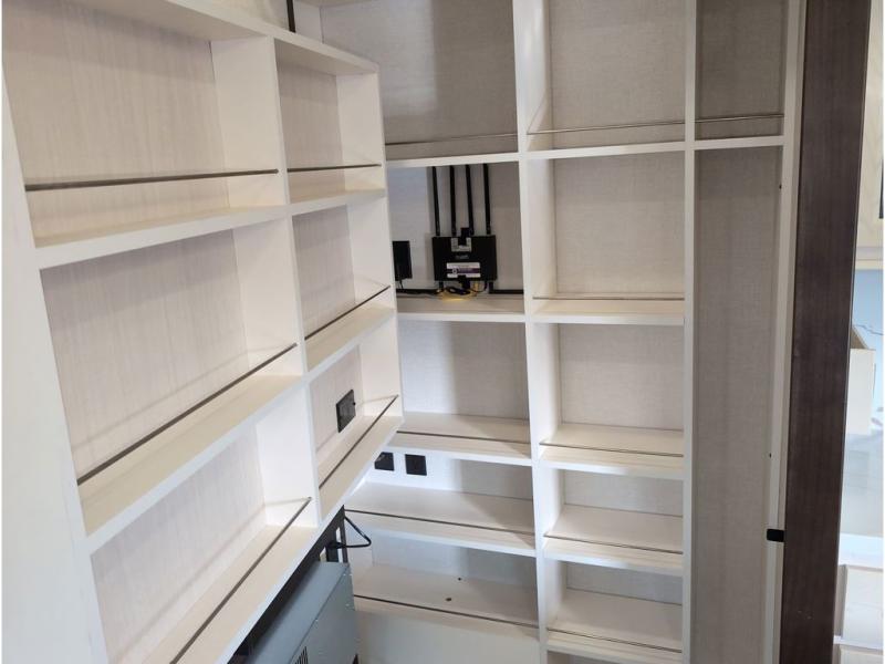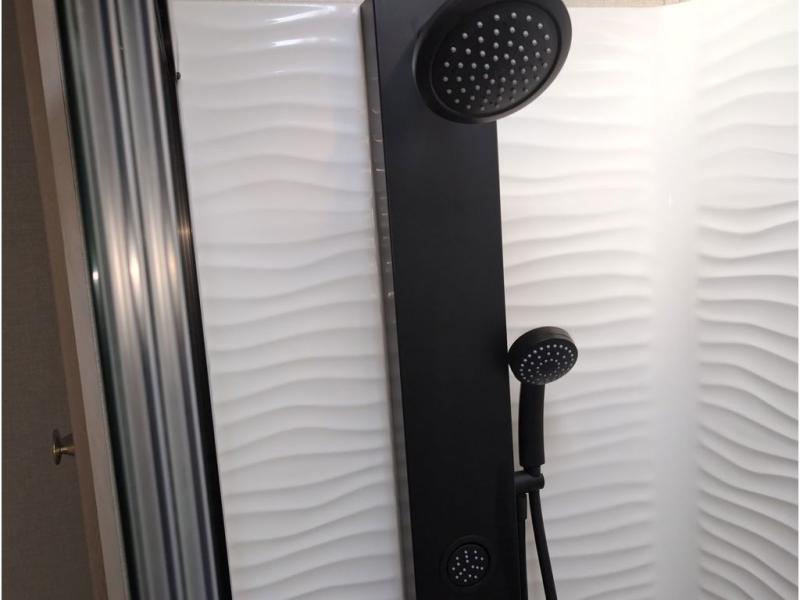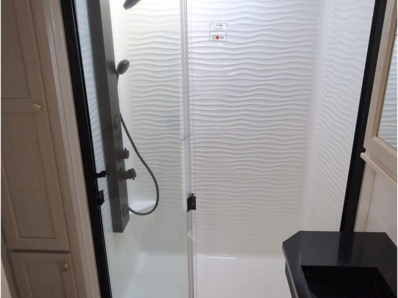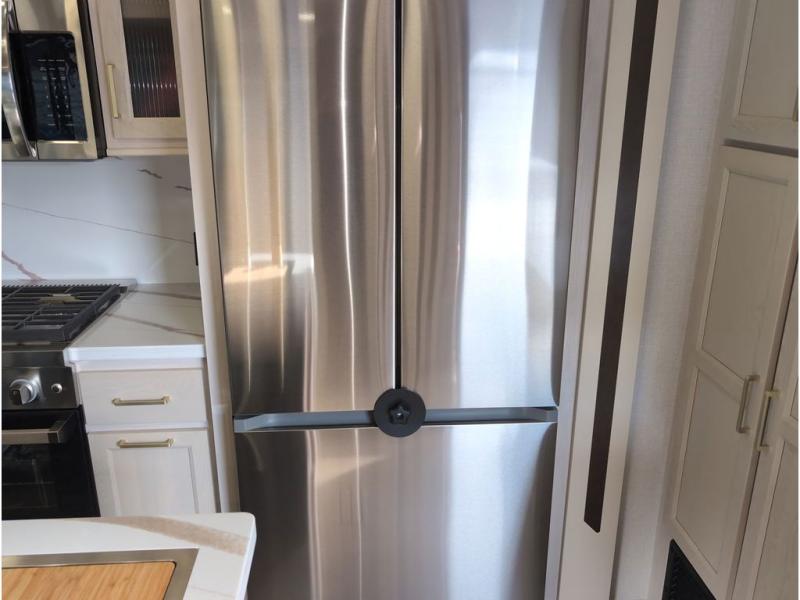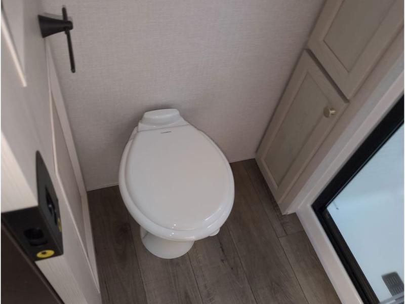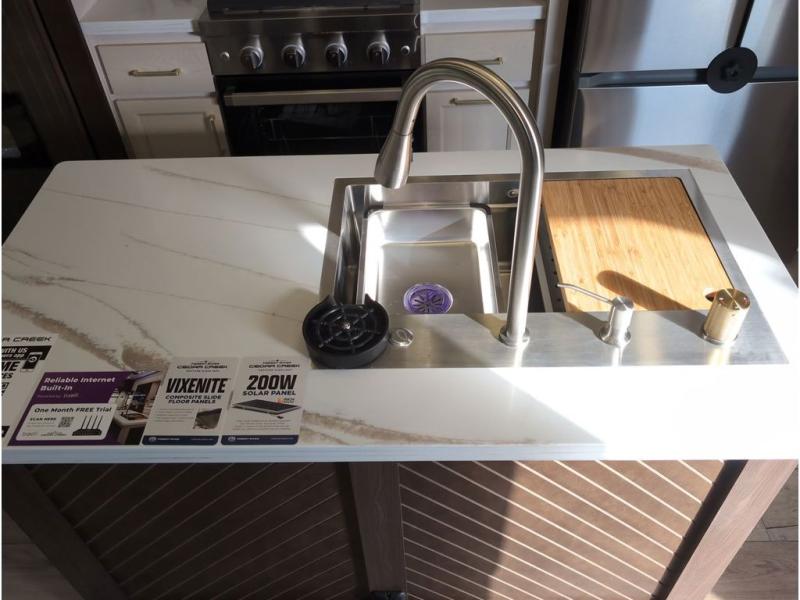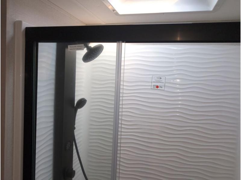 You will love this Cedar Creek Experience fifth wheel! The front bedroom is spacious with a king bed and a wardrobe that keeps on going, with room for hanging garments, shelves, and washer/dryer prep. There's also a standalone dresser with a TV above so you can watch some shows before bed. The bathroom also offers space efficiency with a sliding glass door, and the roomy shower even has a seat for your convenience while bathing. The rear of this unit feels wide open with a lovely living area and kitchen. The kitchen rivals the one at home, with a three-burner cooktop, microwave, and 18 cu. ft. 12V refrigerator with an ice maker. And check out the Murphy pantry that is hidden behind the entertainment center! You'll have tons of storage space with overhead cabinets and a pantry. The kitchen island with a spacious sink is the perfect final touch. After you eat you can relax and watch TV on the power theater seats or the hide-a-bed sofa. There is also a wall mounted dining table and extension with an ottoman for more seating space!
