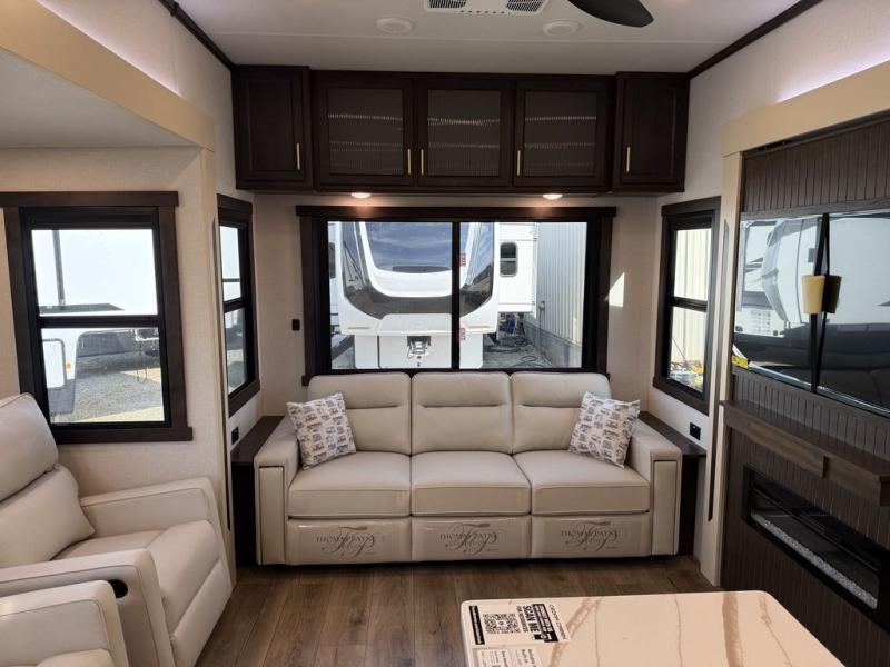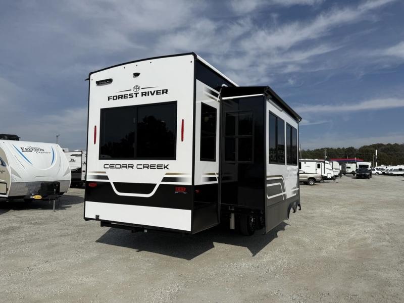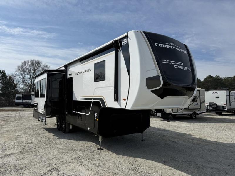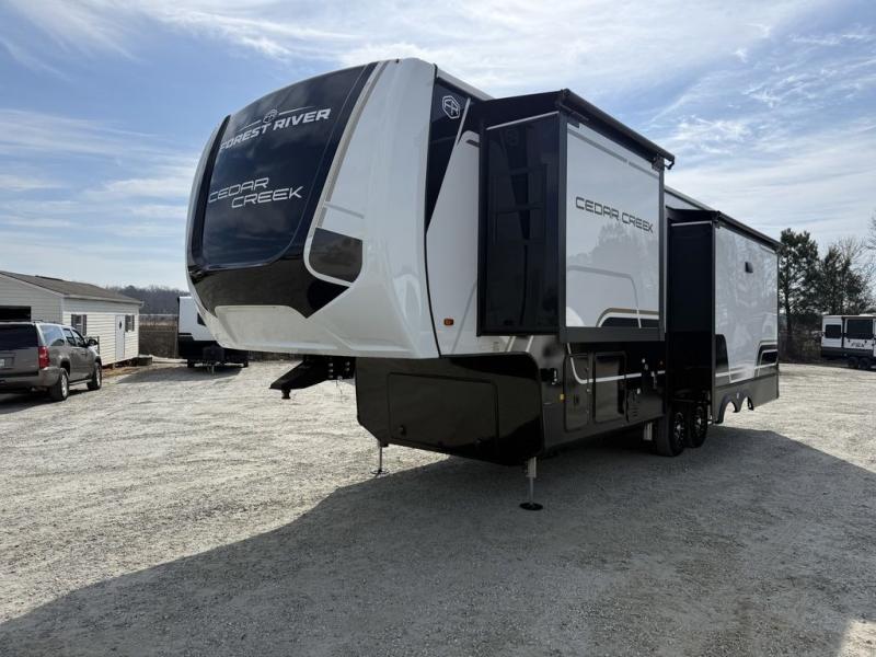 With any Cedar Creek Experience fifth wheel by Forest River, you will bet met with luxury features both inside and out! The True Gelcoat exterior is the best of the best in exteriors and the 3M bonded sidewalls will hold up over years of use. There is also a new 101'' wide-body frame, a Road Warrior suspension, plus a TST tire pressure monitoring system to make towing that much easier. You will find a hidden front storage compartment, along with a 4' x 6' ABS, ribbed, removable underbelly panels, and 6-point hydraulic leveling system, plus many more exterior conveniences. The interior will have you feeling like you haven't left home with vinyl floor coverings, power theater seating with USB ports, a cozy fireplace, vinyl floor covering and the list of comforts goes on! Each model is also pre-wired for satellite to the roof, and you're sure to never go bored with a Smart TV in the bedroom!