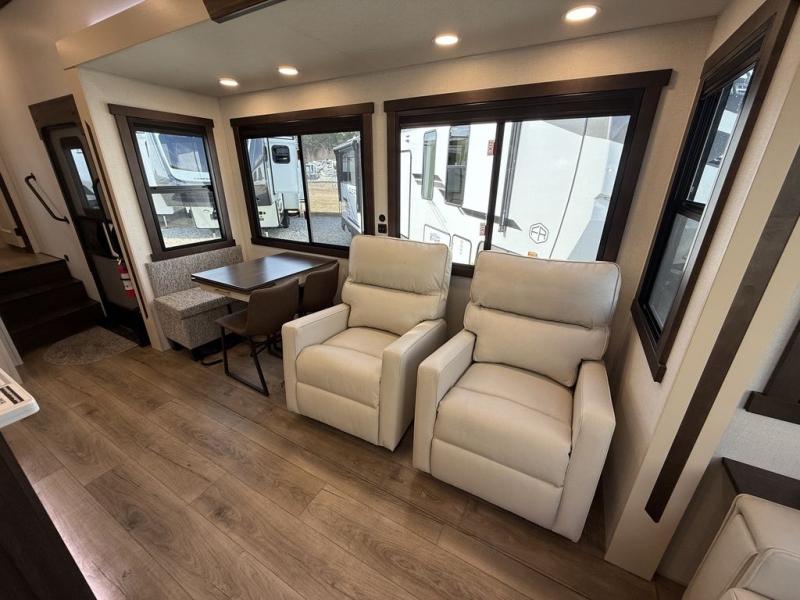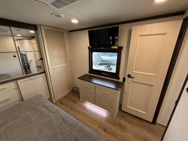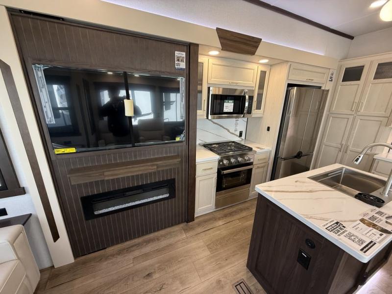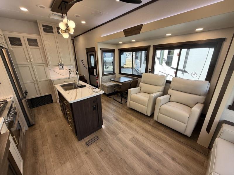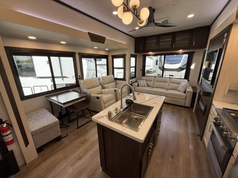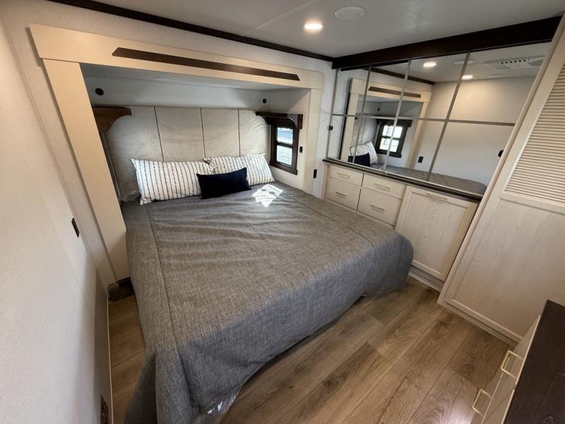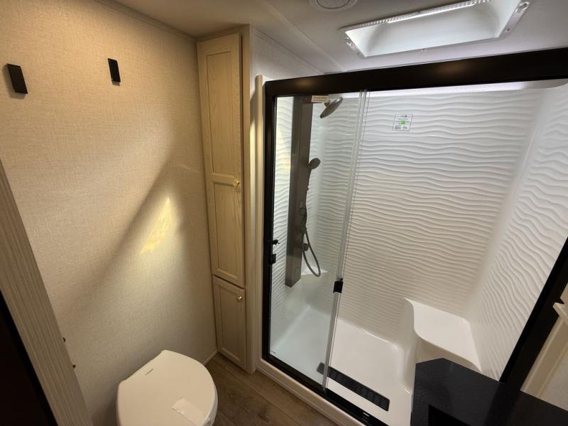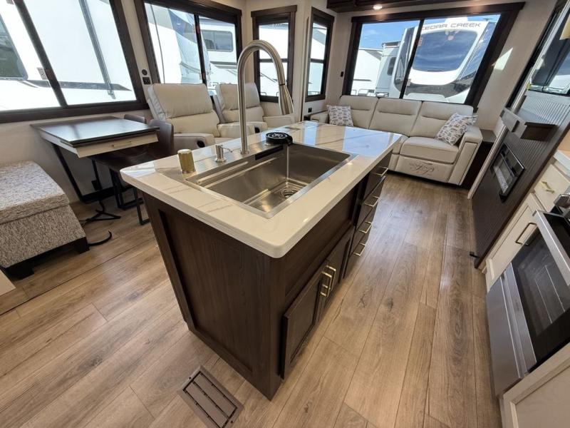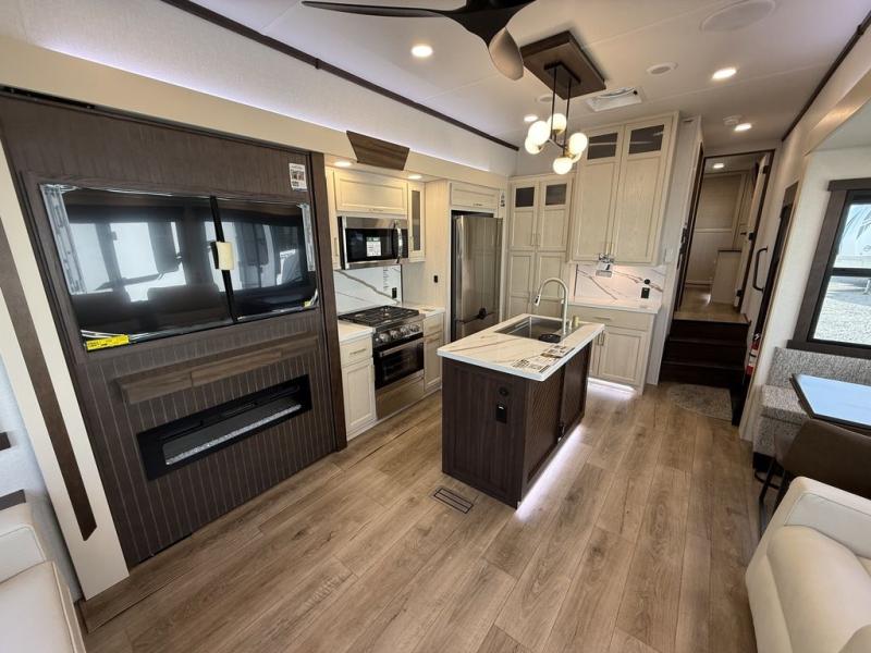 You will love this Cedar Creek Experience fifth wheel! The front bedroom is spacious with a king bed and a wardrobe that keeps on going, with room for hanging garments, shelves, and washer/dryer prep. There's also a standalone dresser with a TV above so you can watch some shows before bed. The bathroom also offers space efficiency with a sliding glass door, and the roomy shower even has a seat for your convenience while bathing. The rear of this unit feels wide open with a lovely living area and kitchen. The kitchen rivals the one at home, with a three-burner cooktop, microwave, and 18 cu. ft. 12V refrigerator with an ice maker. And check out the Murphy pantry that is hidden behind the entertainment center! You'll have tons of storage space with overhead cabinets and a pantry. The kitchen island with a spacious sink is the perfect final touch. After you eat you can relax and watch TV on the power theater seats or the hide-a-bed sofa. There is also a wall mounted dining table and extension with an ottoman for more seating space!
