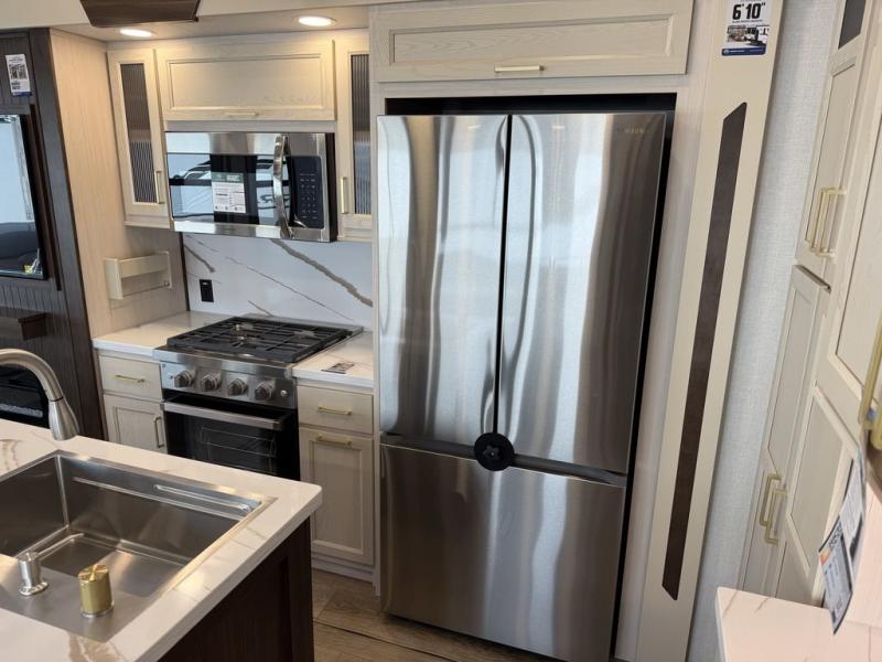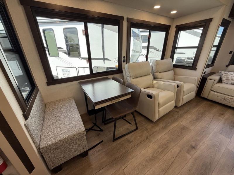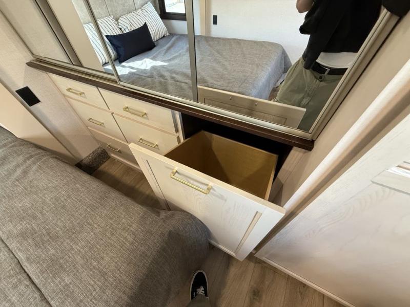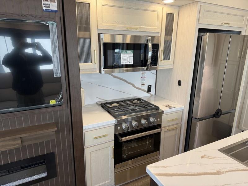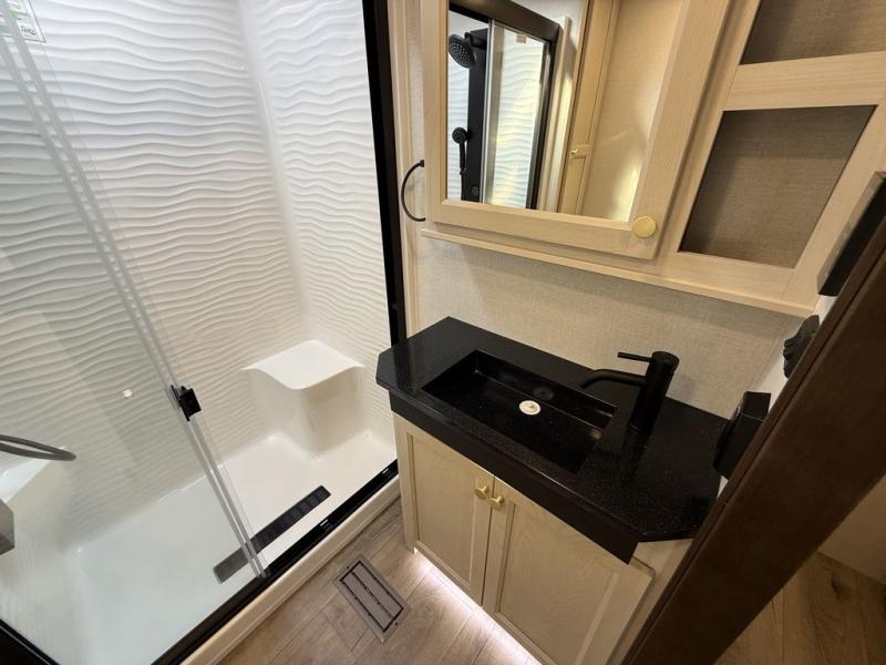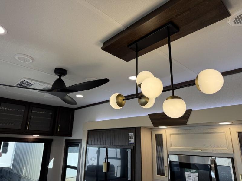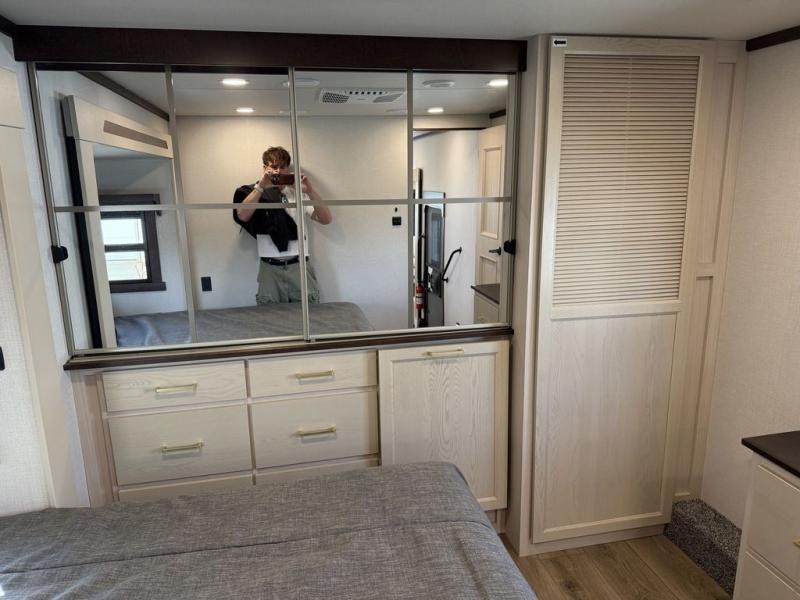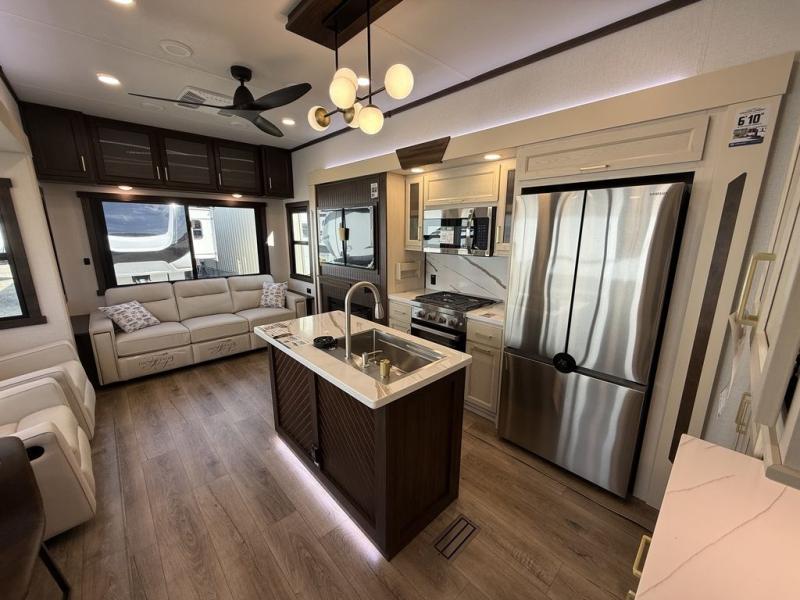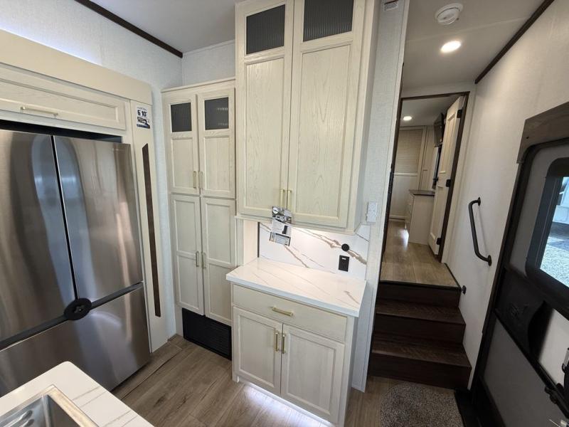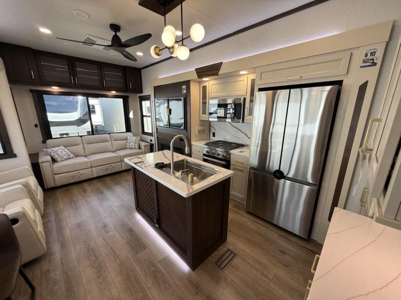 You will love this Cedar Creek Experience fifth wheel! The front bedroom is spacious with a king bed and a wardrobe that keeps on going, with room for hanging garments, shelves, and washer/dryer prep. There's also a standalone dresser with a TV above so you can watch some shows before bed. The bathroom also offers space efficiency with a sliding glass door, and the roomy shower even has a seat for your convenience while bathing. The rear of this unit feels wide open with a lovely living area and kitchen. The kitchen rivals the one at home, with a three-burner cooktop, microwave, and 18 cu. ft. 12V refrigerator with an ice maker. And check out the Murphy pantry that is hidden behind the entertainment center! You'll have tons of storage space with overhead cabinets and a pantry. The kitchen island with a spacious sink is the perfect final touch. After you eat you can relax and watch TV on the power theater seats or the hide-a-bed sofa. There is also a wall mounted dining table and extension with an ottoman for more seating space!