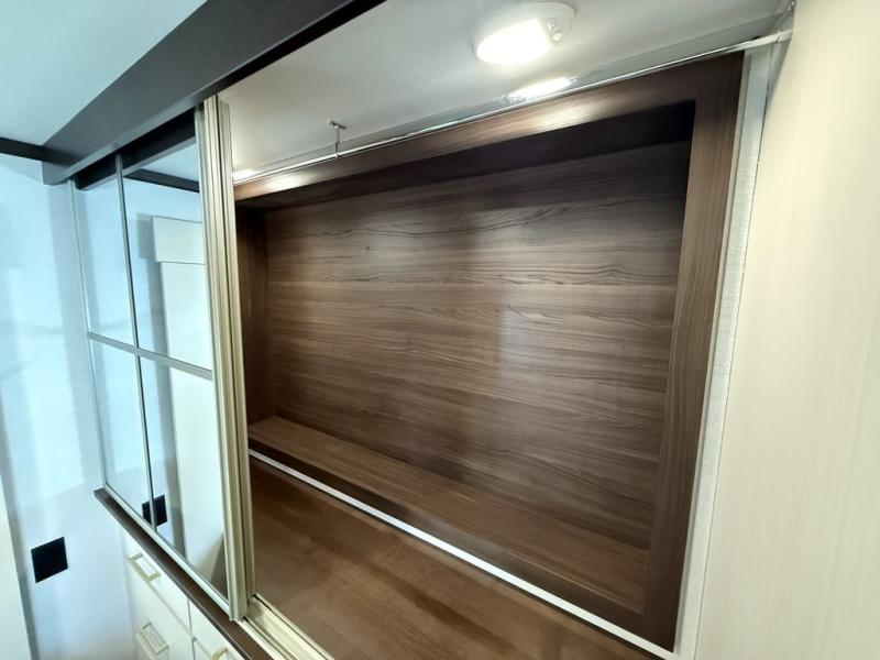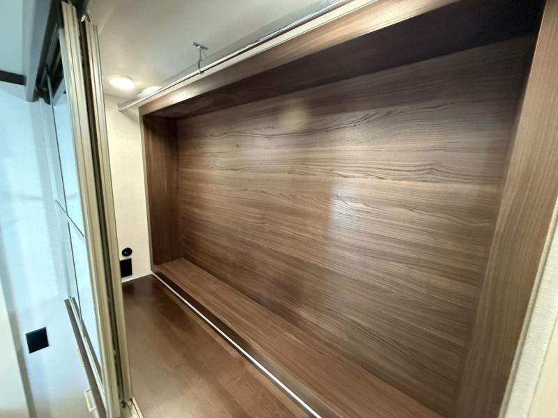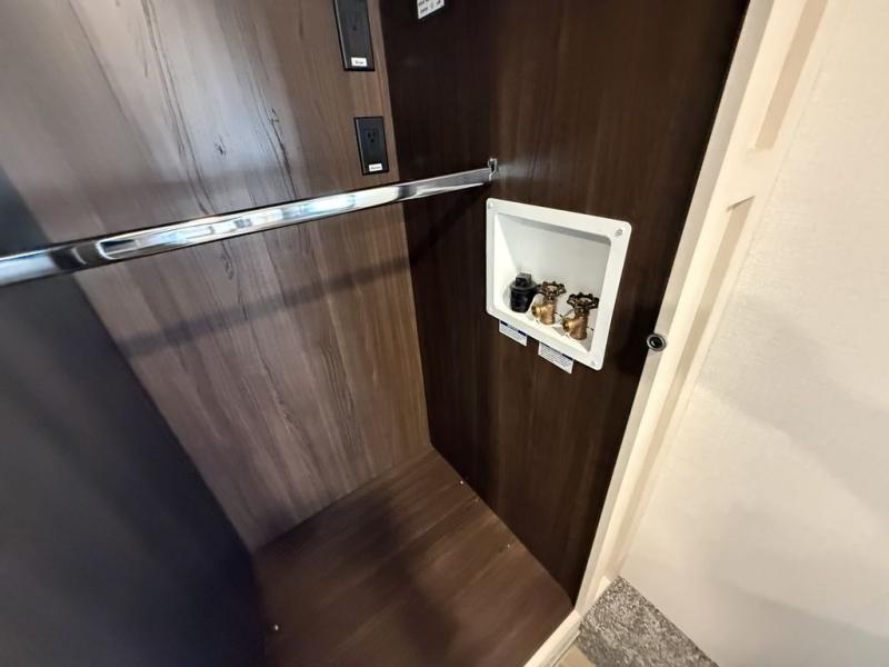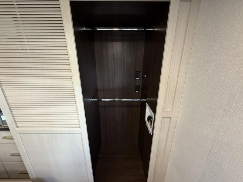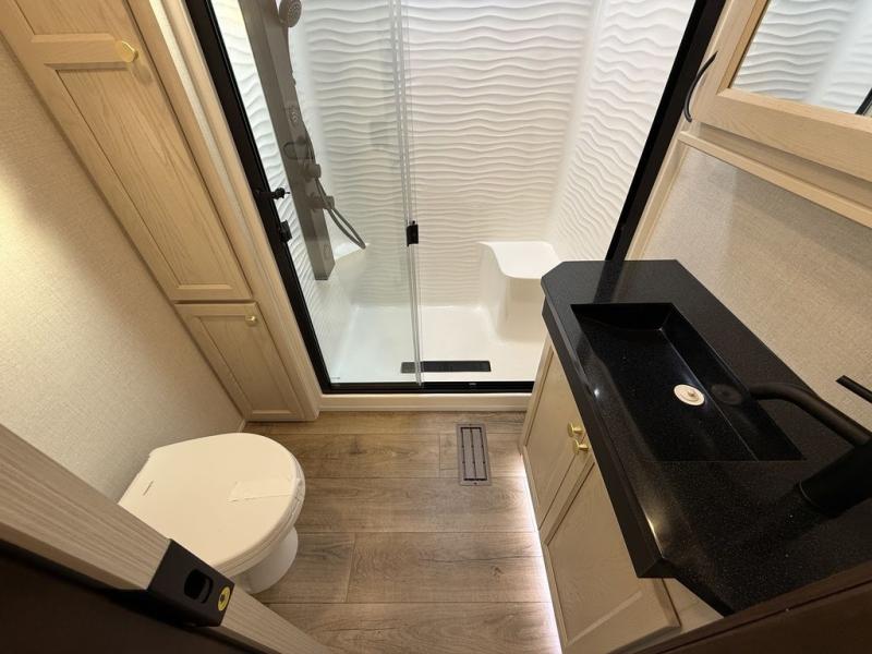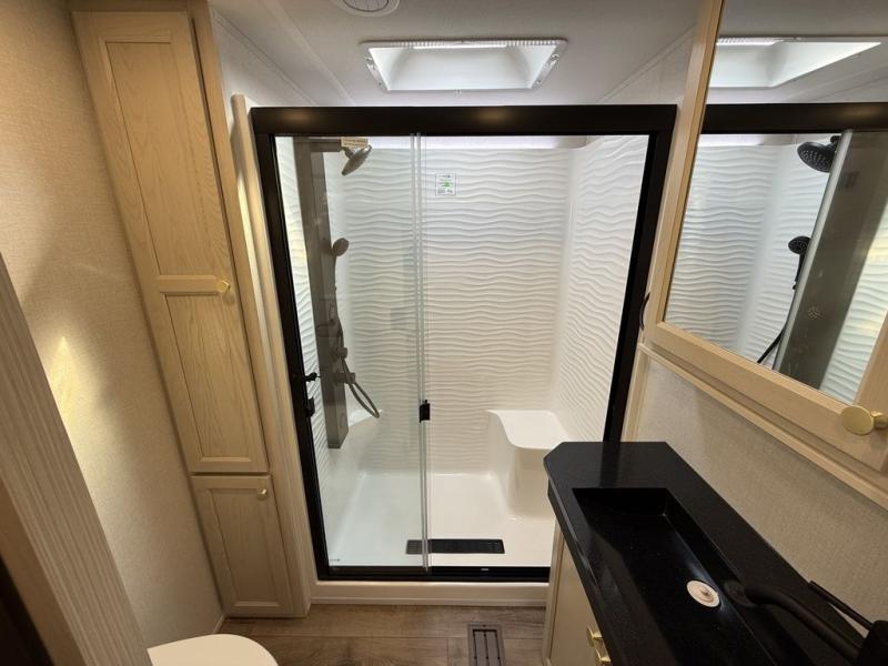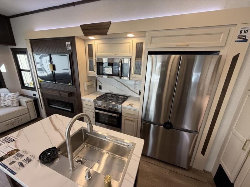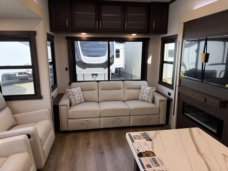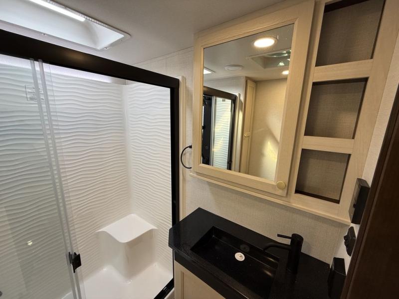 You will love this Cedar Creek Experience fifth wheel! The front bedroom is spacious with a king bed and a wardrobe that keeps on going, with room for hanging garments, shelves, and washer/dryer prep. There's also a standalone dresser with a TV above so you can watch some shows before bed. The bathroom also offers space efficiency with a sliding glass door, and the roomy shower even has a seat for your convenience while bathing. The rear of this unit feels wide open with a lovely living area and kitchen. The kitchen rivals the one at home, with a three-burner cooktop, microwave, and 18 cu. ft. 12V refrigerator with an ice maker. And check out the Murphy pantry that is hidden behind the entertainment center! You'll have tons of storage space with overhead cabinets and a pantry. The kitchen island with a spacious sink is the perfect final touch. After you eat you can relax and watch TV on the power theater seats or the hide-a-bed sofa. There is also a wall mounted dining table and extension with an ottoman for more seating space!