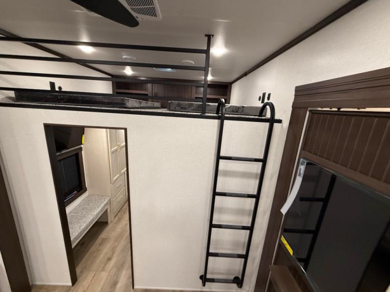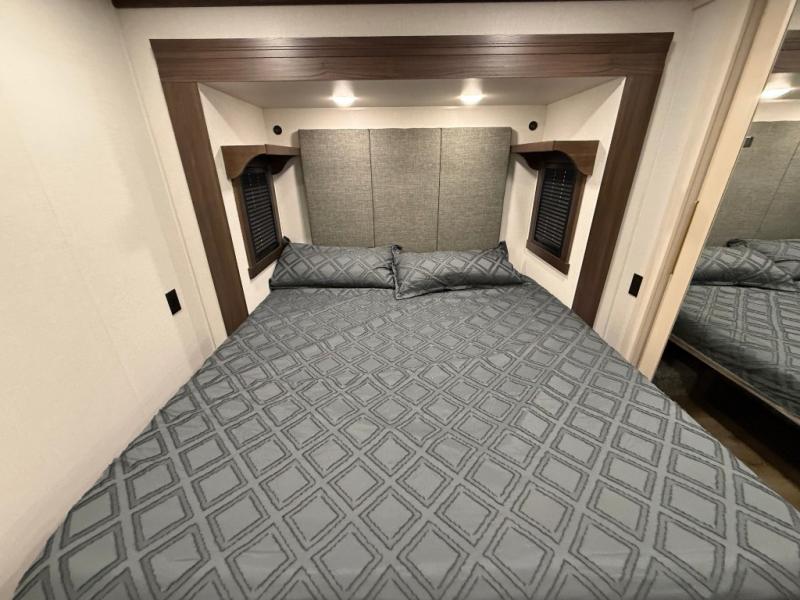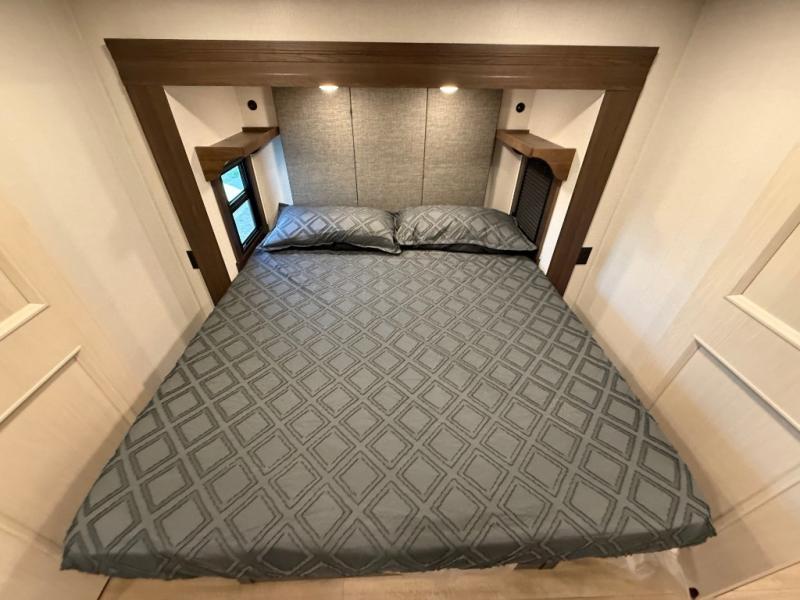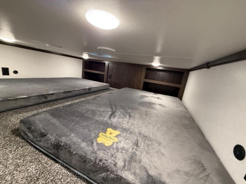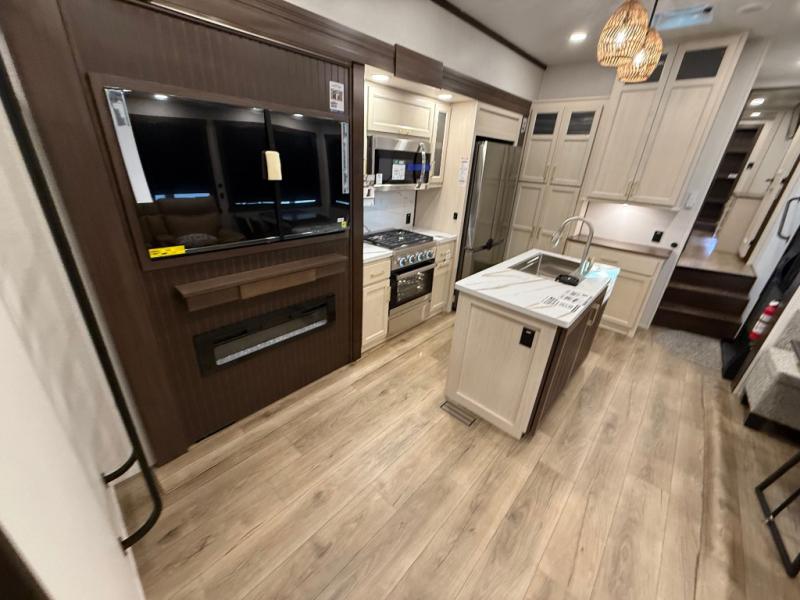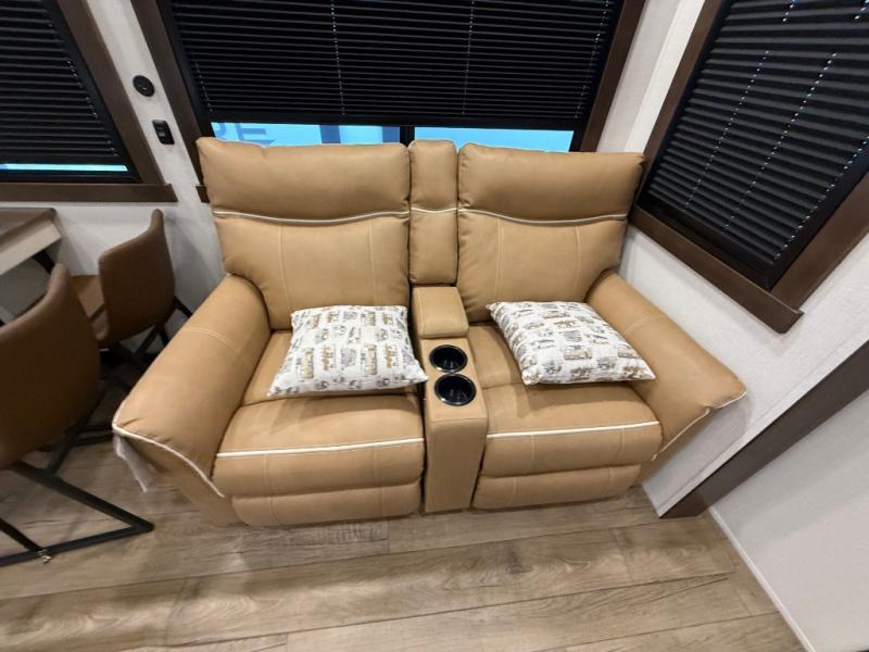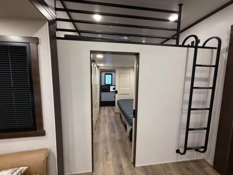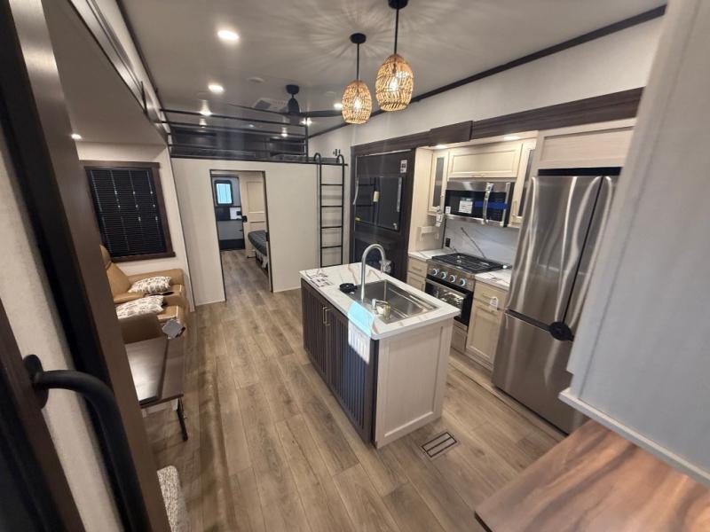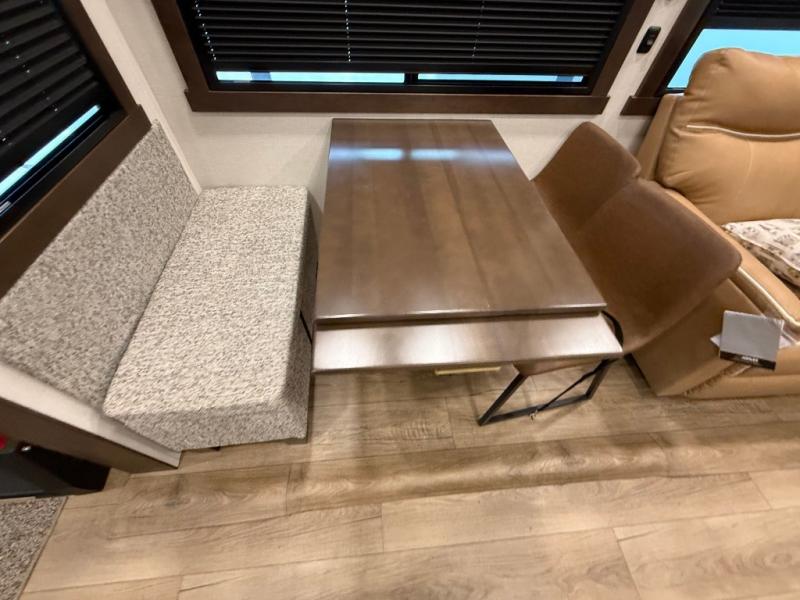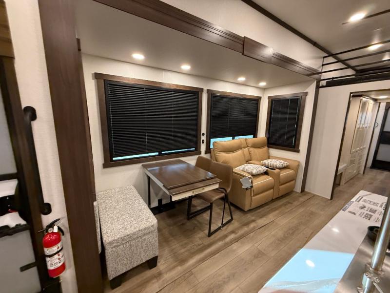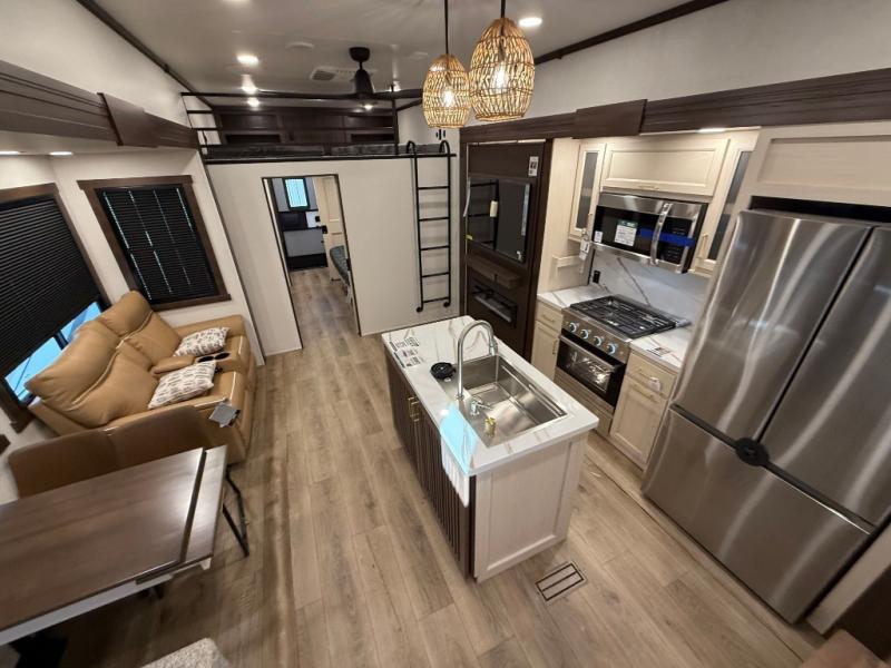 This is the perfect fifth wheel to camp with family or neighbor friends since there are two bedrooms, one of which is a master bedroom with a full rear bath. The second full bath is up front, and both bedrooms include a king bed slide out for added comfort. There is even a loft above the rear bedroom, complete with two bunk mats, two cabinets, and a TV hookup. Everyone can meet in the combined kitchen and living room to enjoy the swivel mounted TV and fireplace across from the theater seating. There is also a wall-mounted dining table with an extension and ottoman.