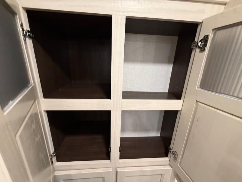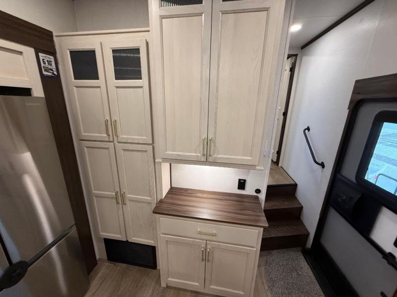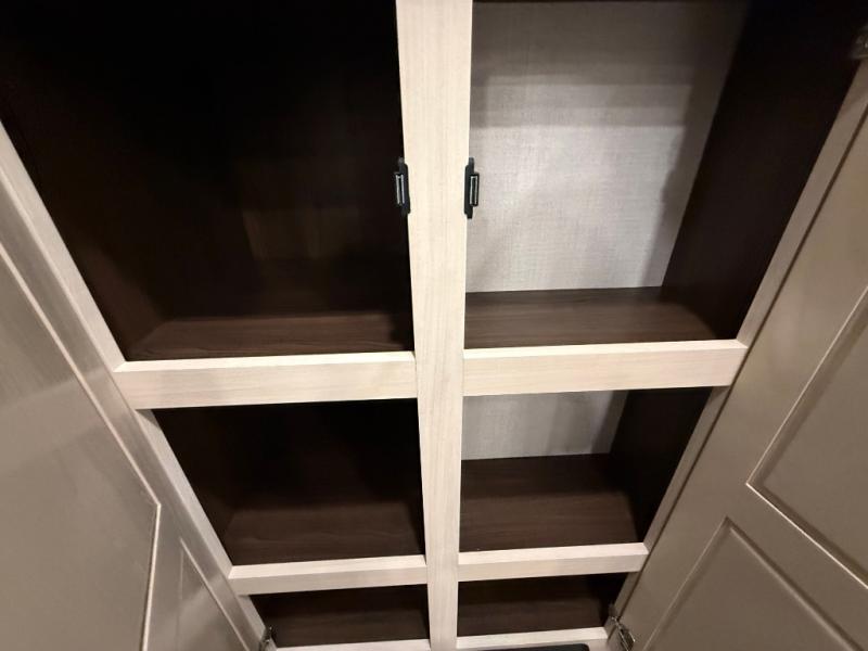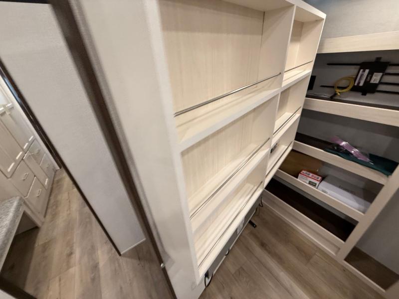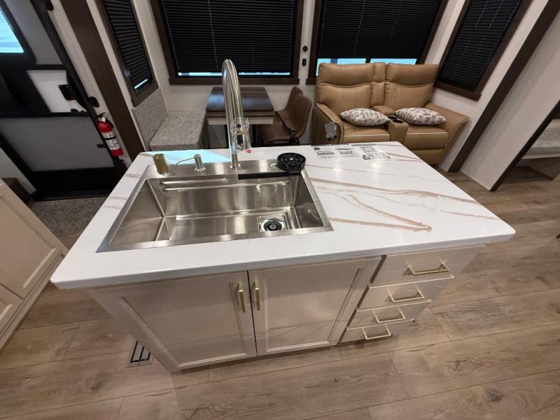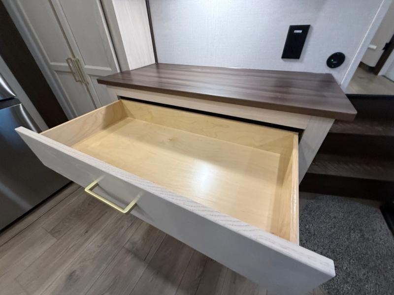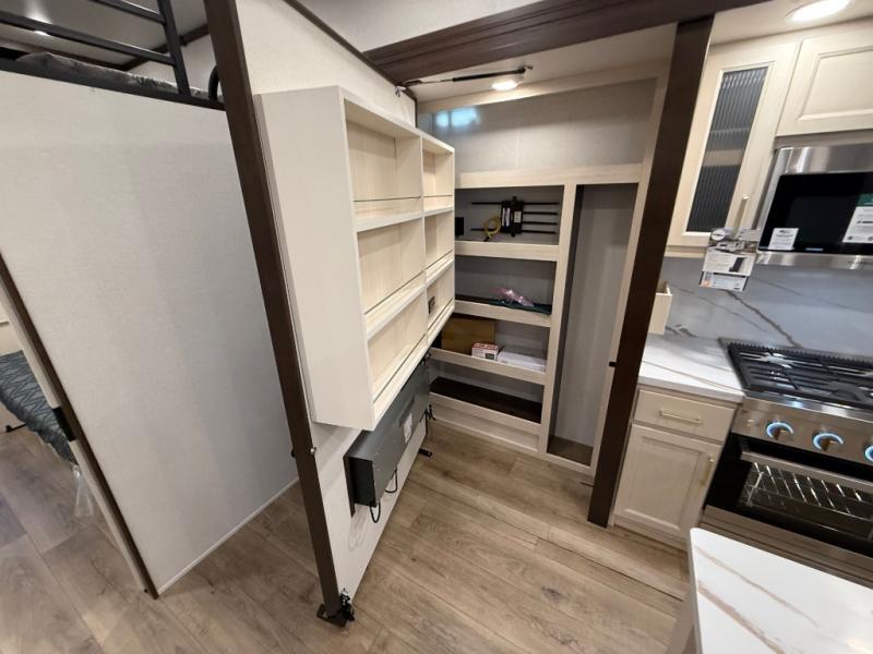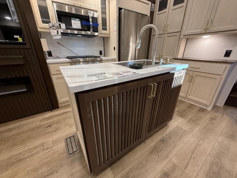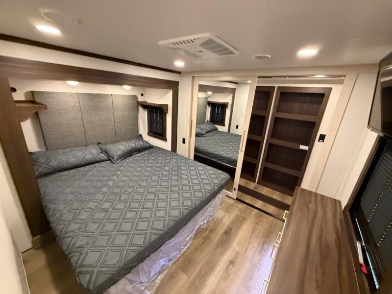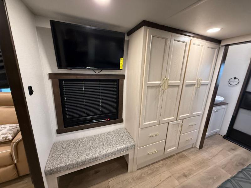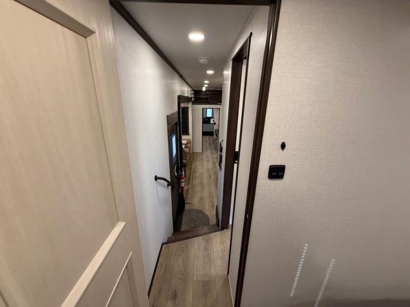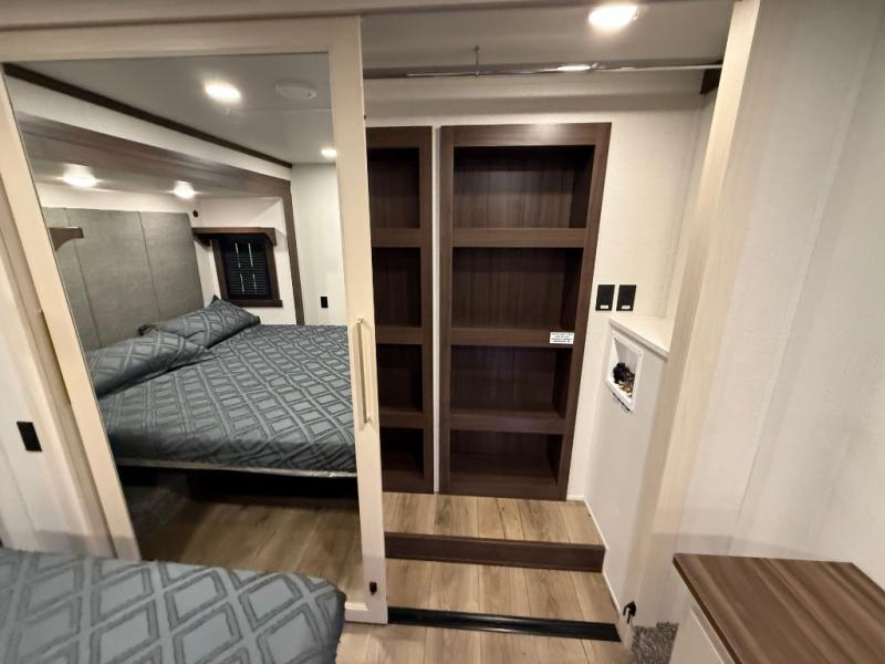 This is the perfect fifth wheel to camp with family or neighbor friends since there are two bedrooms, one of which is a master bedroom with a full rear bath. The second full bath is up front, and both bedrooms include a king bed slide out for added comfort. There is even a loft above the rear bedroom, complete with two bunk mats, two cabinets, and a TV hookup. Everyone can meet in the combined kitchen and living room to enjoy the swivel mounted TV and fireplace across from the theater seating. There is also a wall-mounted dining table with an extension and ottoman.