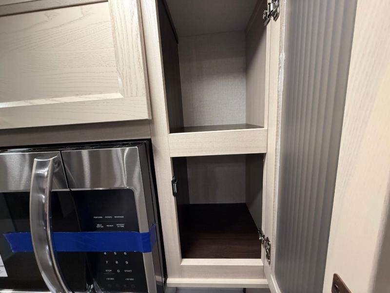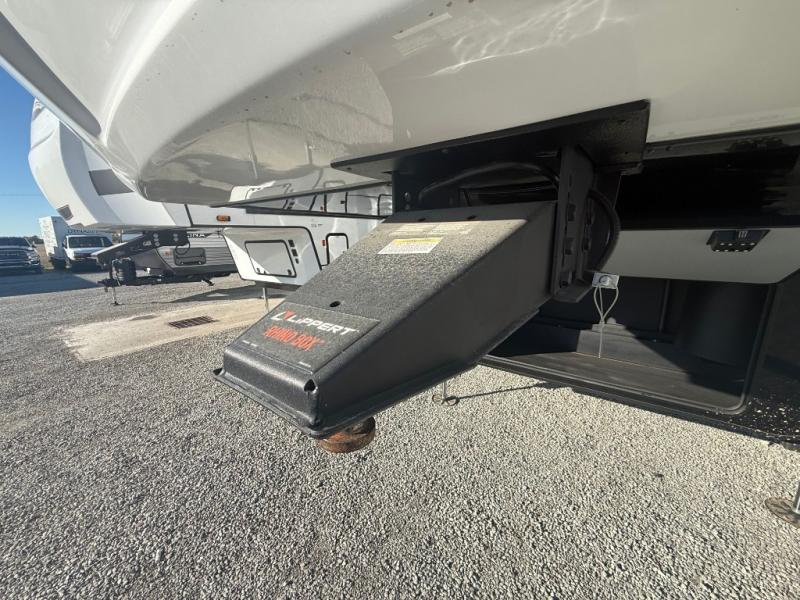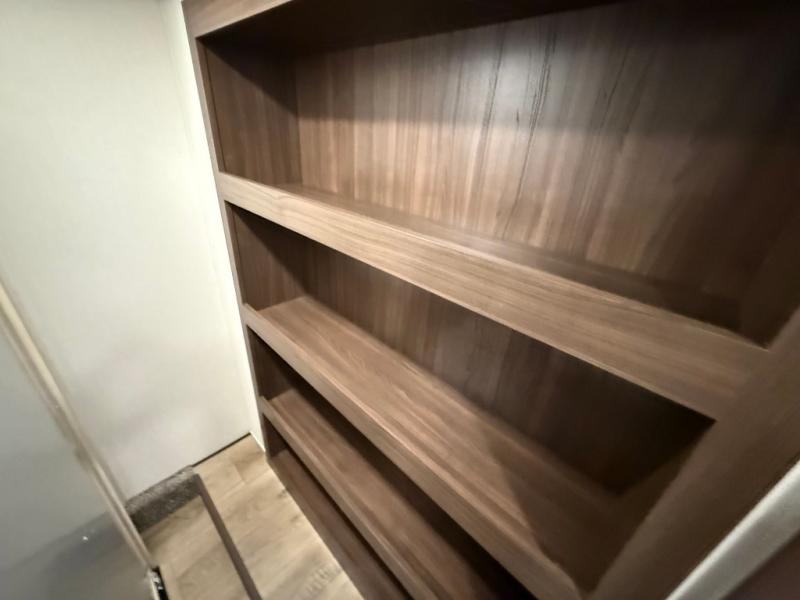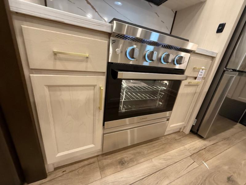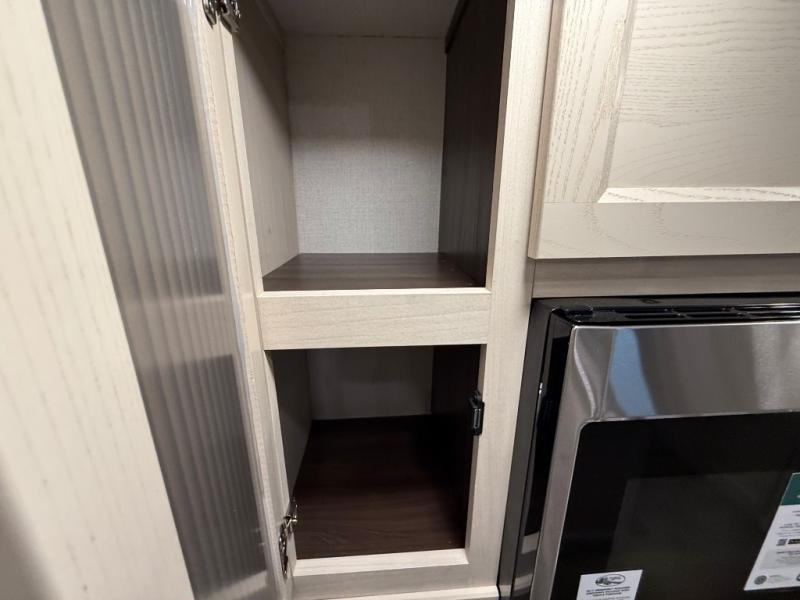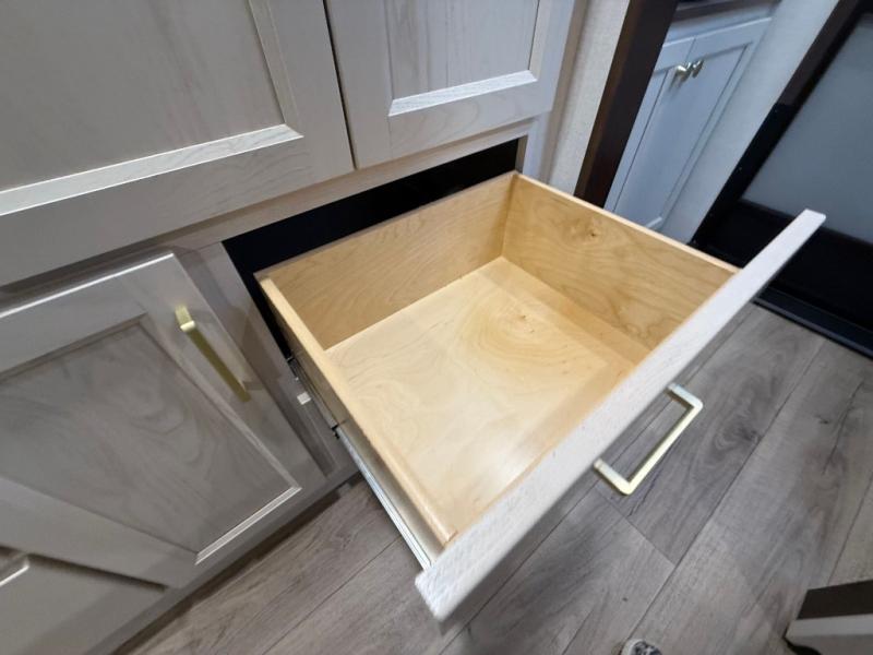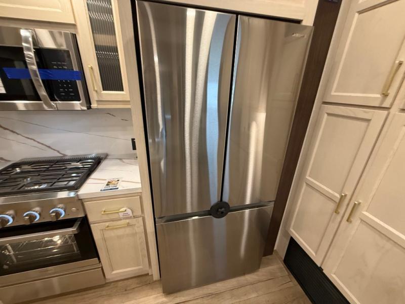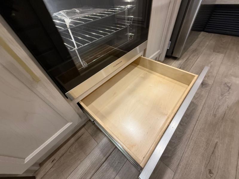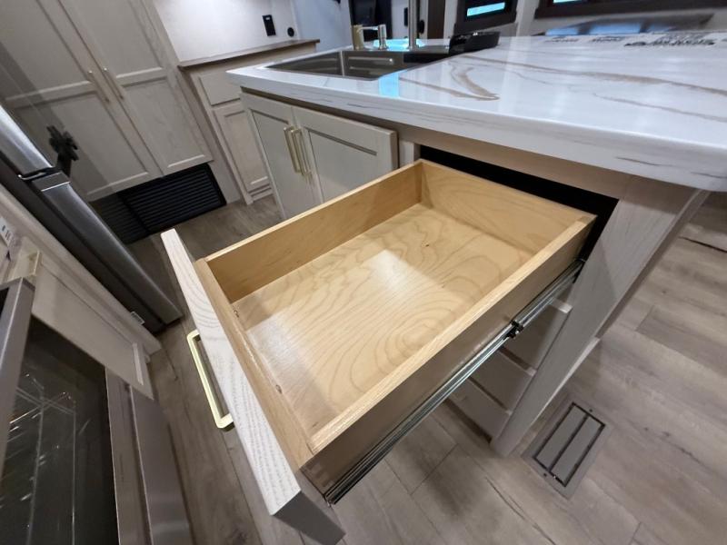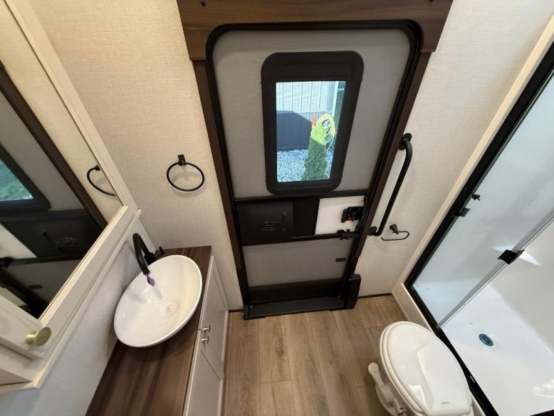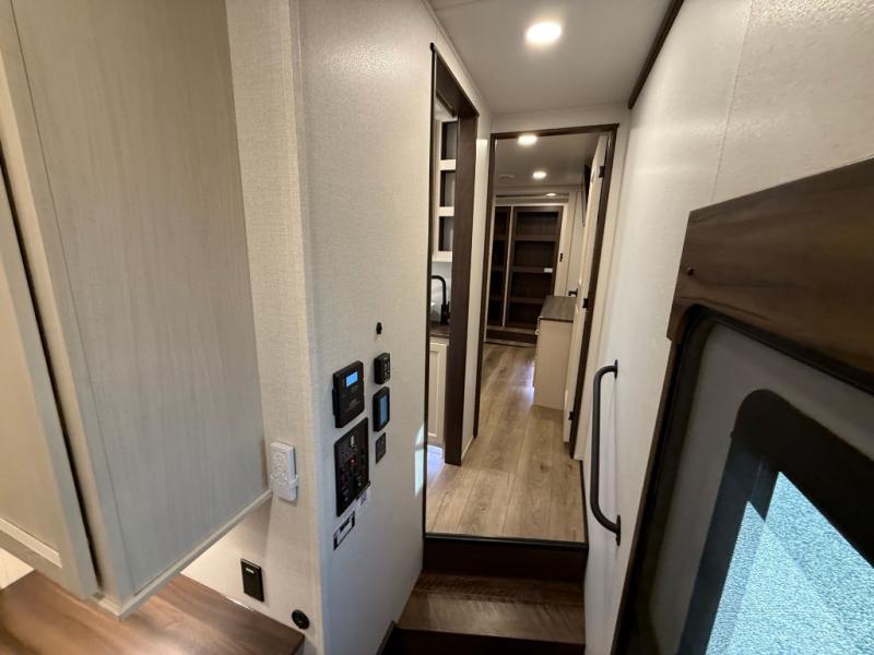 This is the perfect fifth wheel to camp with family or neighbor friends since there are two bedrooms, one of which is a master bedroom with a full rear bath. The second full bath is up front, and both bedrooms include a king bed slide out for added comfort. There is even a loft above the rear bedroom, complete with two bunk mats, two cabinets, and a TV hookup. Everyone can meet in the combined kitchen and living room to enjoy the swivel mounted TV and fireplace across from the theater seating. There is also a wall-mounted dining table with an extension and ottoman.
