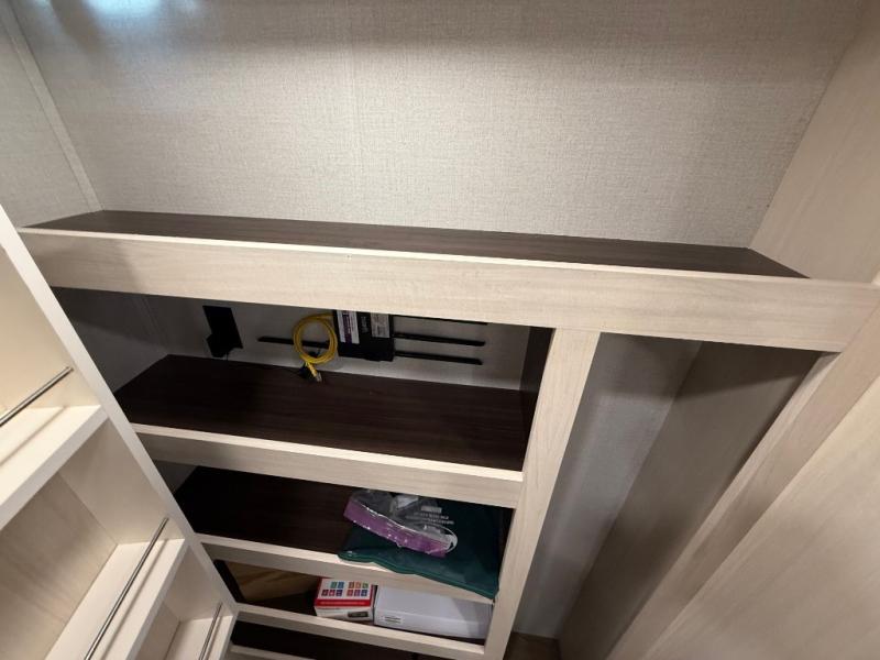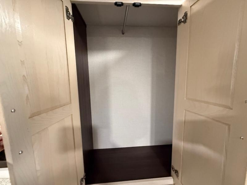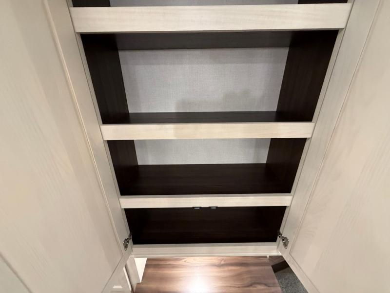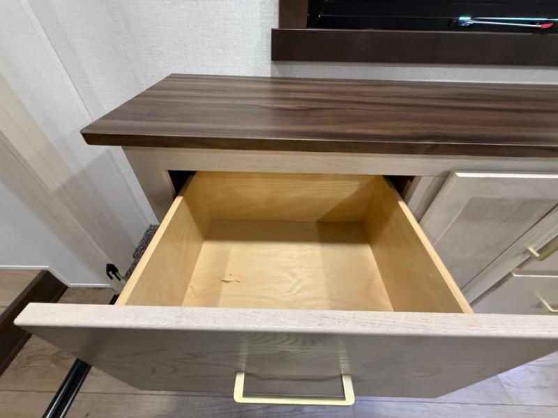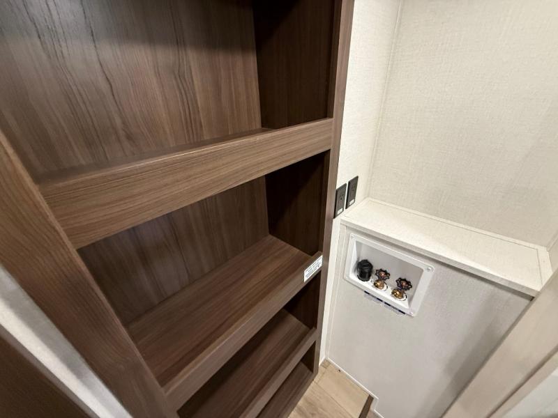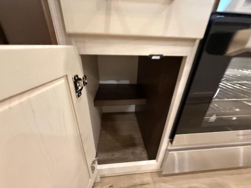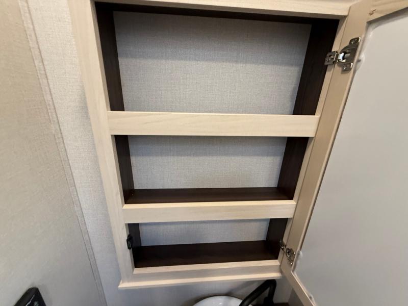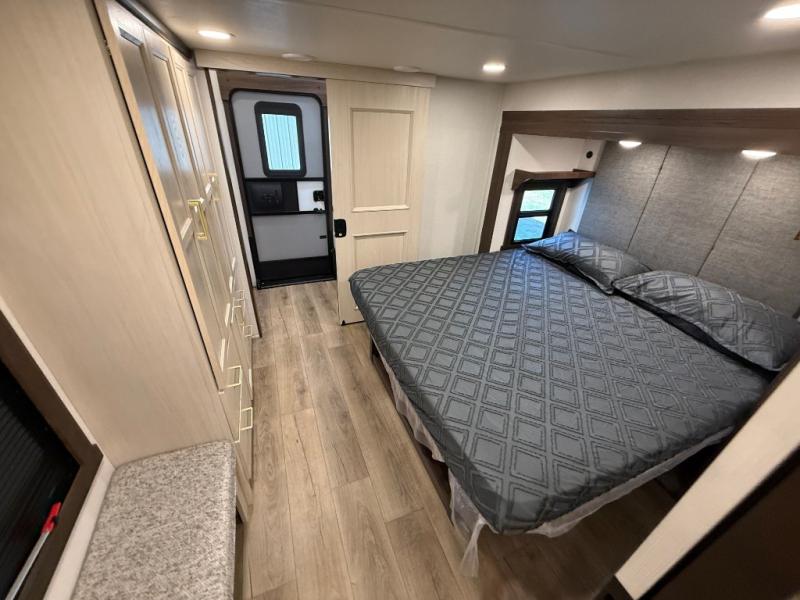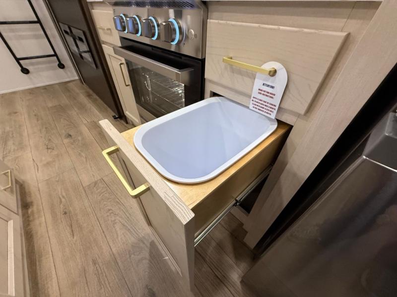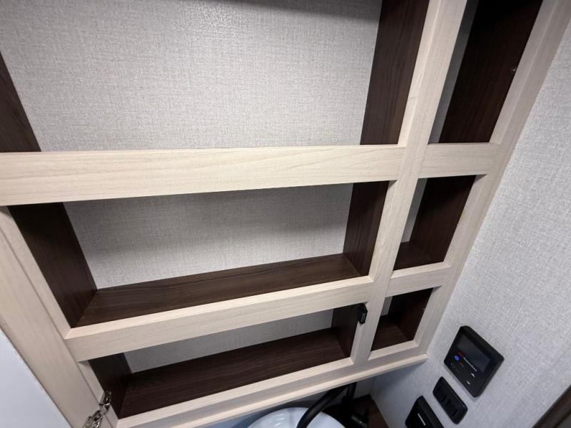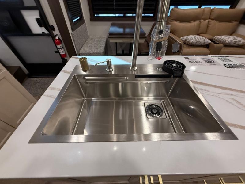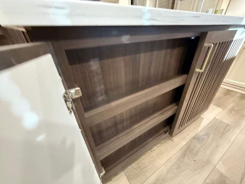 This is the perfect fifth wheel to camp with family or neighbor friends since there are two bedrooms, one of which is a master bedroom with a full rear bath. The second full bath is up front, and both bedrooms include a king bed slide out for added comfort. There is even a loft above the rear bedroom, complete with two bunk mats, two cabinets, and a TV hookup. Everyone can meet in the combined kitchen and living room to enjoy the swivel mounted TV and fireplace across from the theater seating. There is also a wall-mounted dining table with an extension and ottoman.