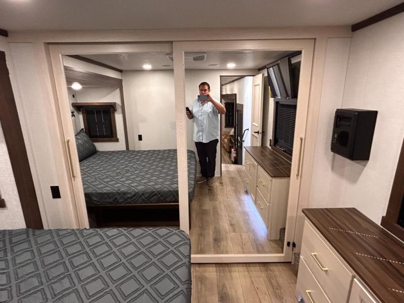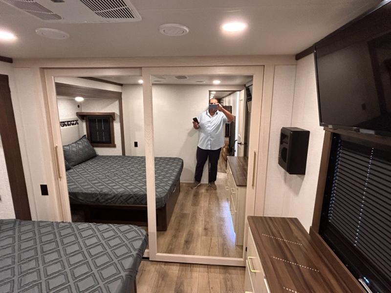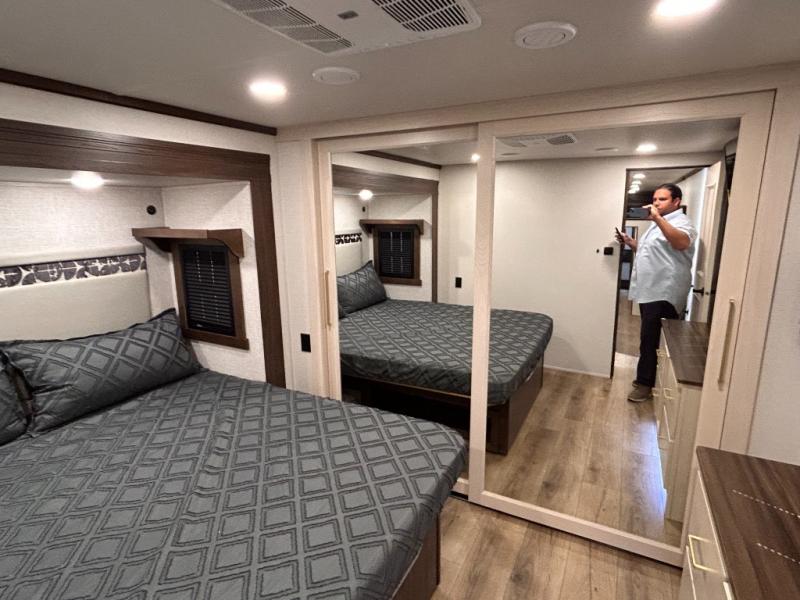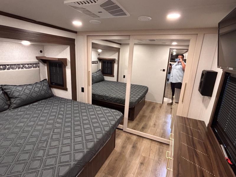 TWO BEDROOM/ TWO FULL BATH/ DOUBLE QUEEN HUGE LOFT/ THEATER SEATING / 4 SLIDE TOPPERS / 200 SOLAR PANEL / AUTO LEVELING With 2ND AC!!!