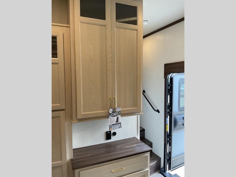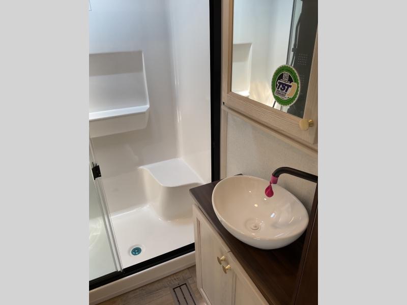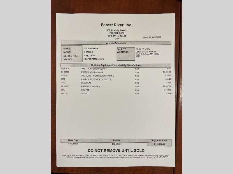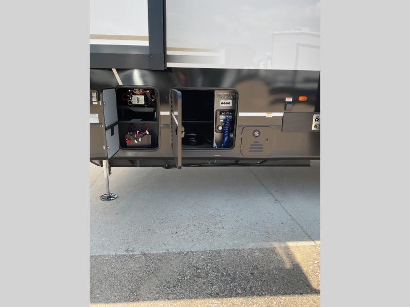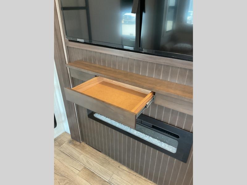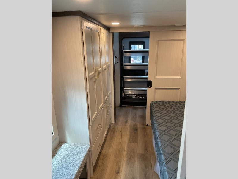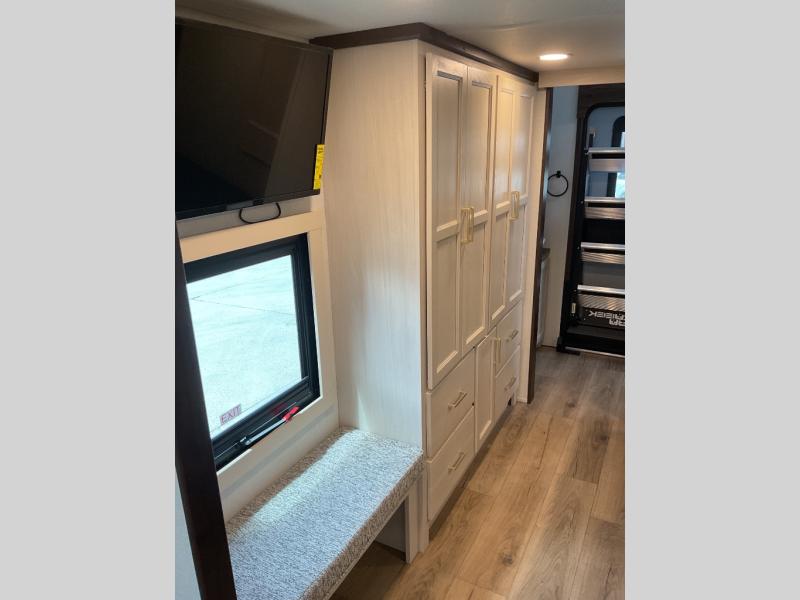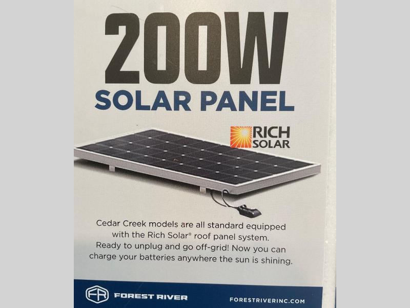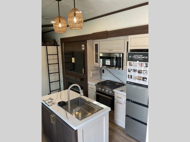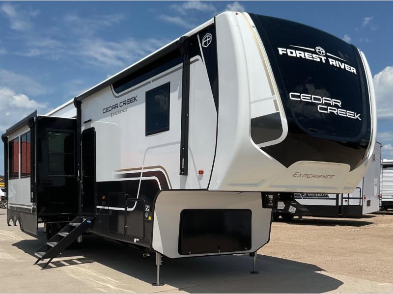 With any Cedar Creek Experience fifth wheel by Forest River, you will bet met with luxury features both inside and out! The True Gelcoat exterior is the best of the best in exteriors and the 3M bonded sidewalls will hold up over years of use. There is also a new 101'' wide-body frame, a Road Warrior suspension, plus a TST tire pressure monitoring system to make towing that much easier. You will find a hidden front storage compartment, along with a 4' x 6' ABS, ribbed, removable underbelly panels, and 6-point hydraulic leveling system, plus many more exterior conveniences. The interior will have you feeling like you haven't left home with vinyl floor coverings, power theater seating with USB ports, a cozy fireplace, vinyl floor covering and the list of comforts goes on! Each model is also pre-wired for satellite to the roof, and you're sure to never go bored with a Smart TV in the bedroom!