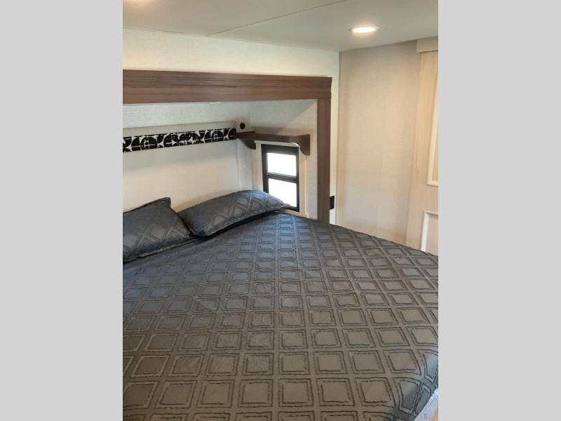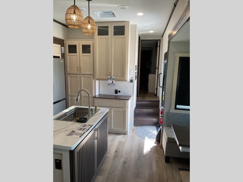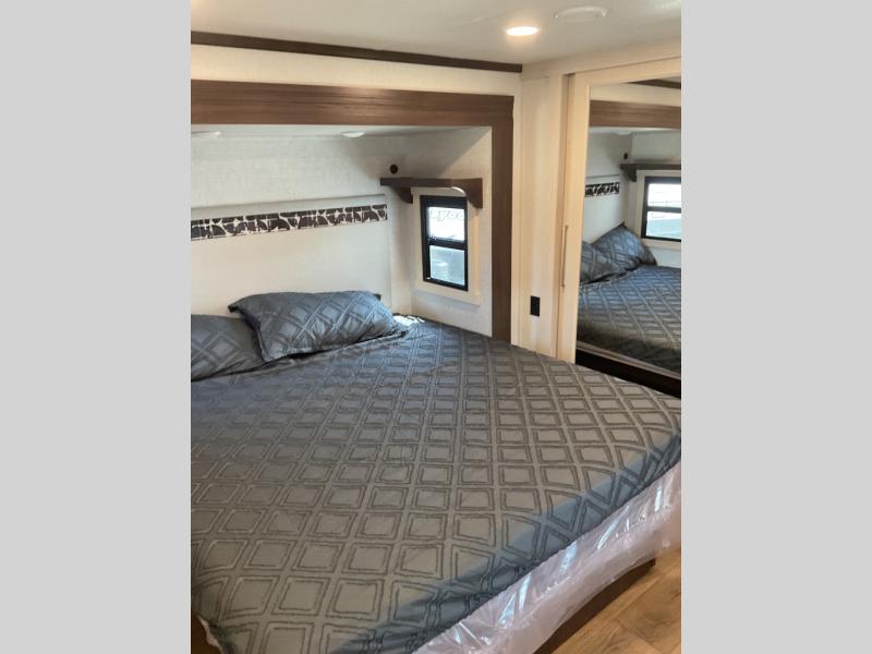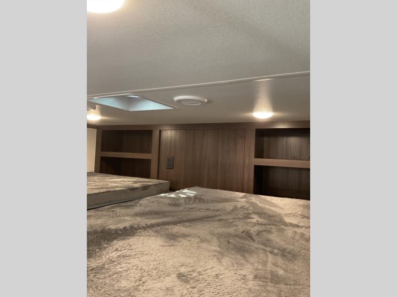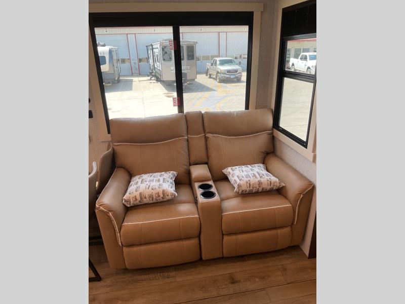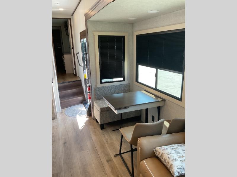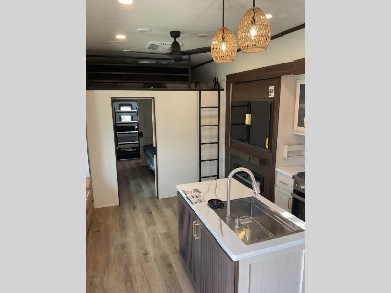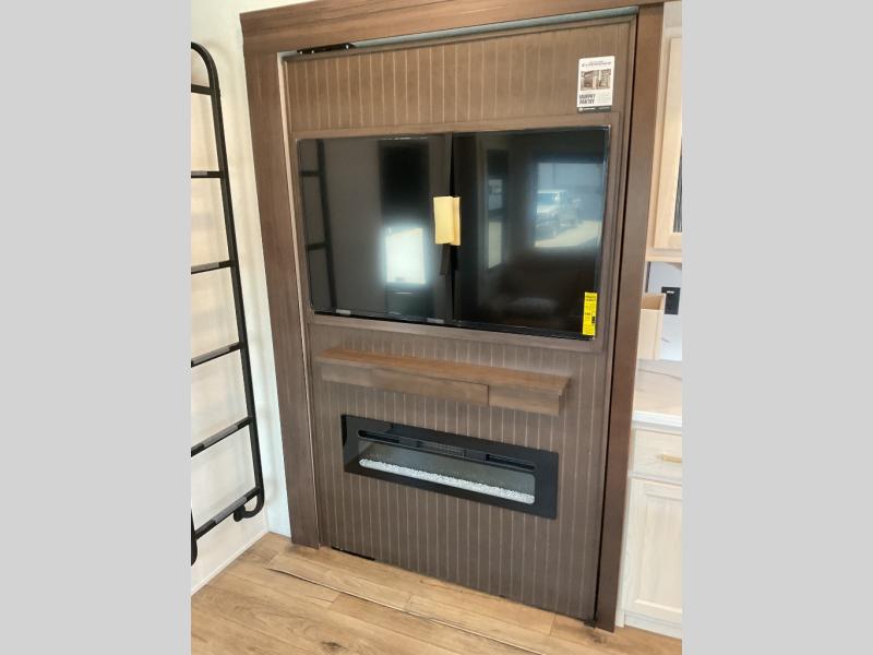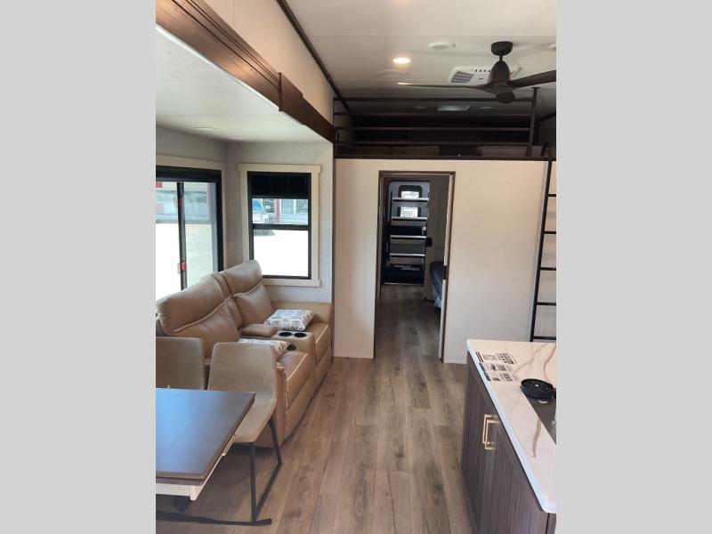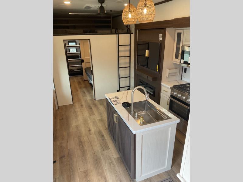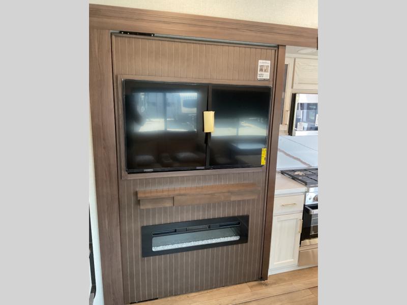 This is the perfect fifth wheel to camp with family or neighbor friends since there are two bedrooms, one of which is a master bedroom with a full rear bath. The second full bath is up front, and both bedrooms include a king bed slide out for added comfort. There is even a loft above the rear bedroom, complete with two bunk mats, two cabinets, and a TV hookup. Everyone can meet in the combined kitchen and living room to enjoy the swivel mounted TV and fireplace across from the theater seating. There is also a wall-mounted dining table with an extension and ottoman.