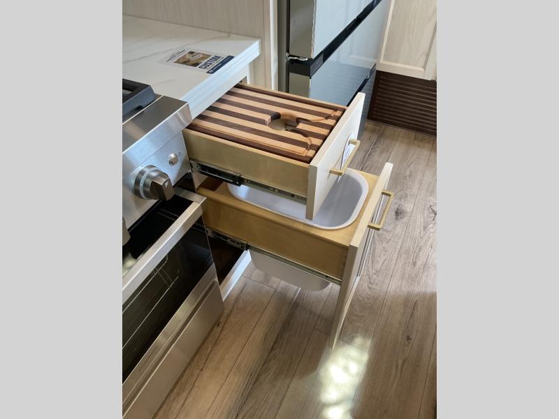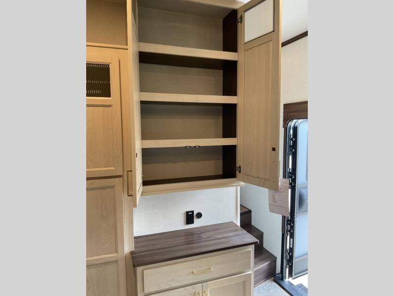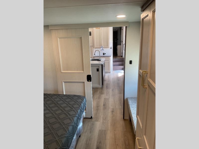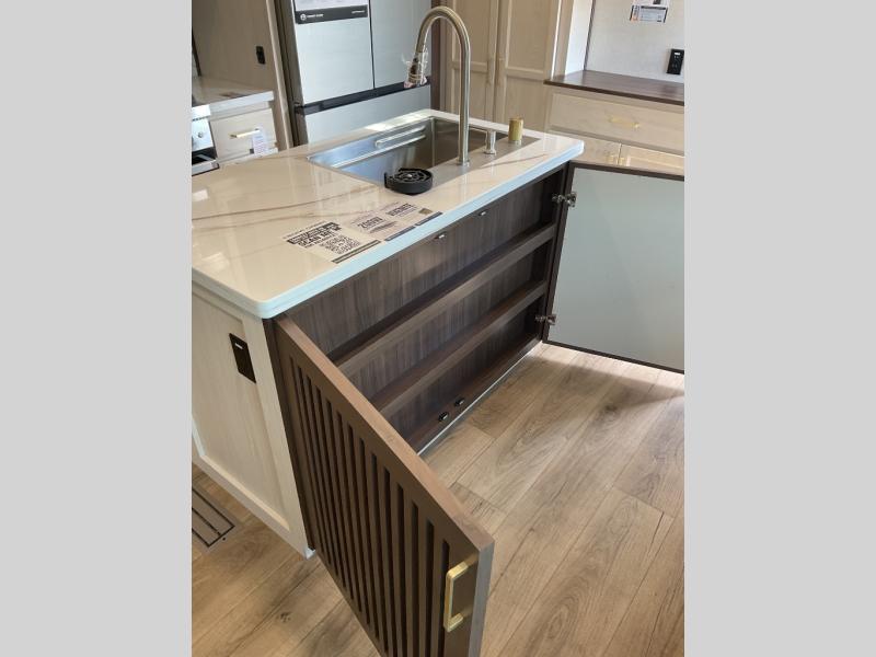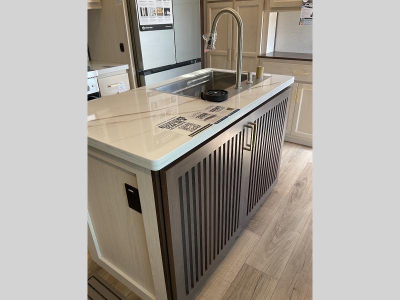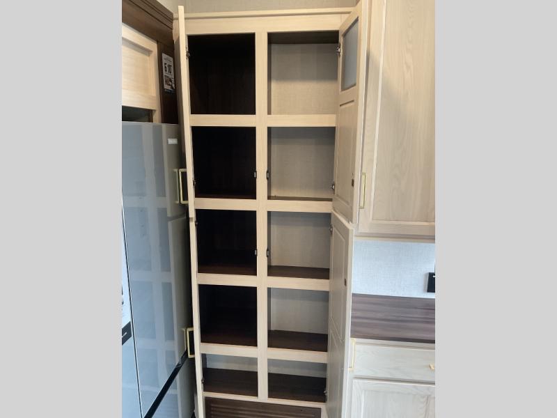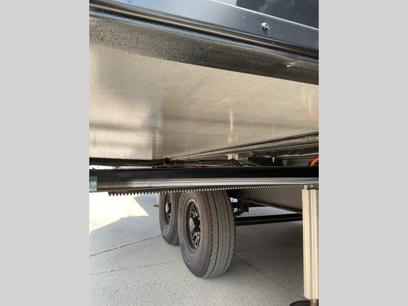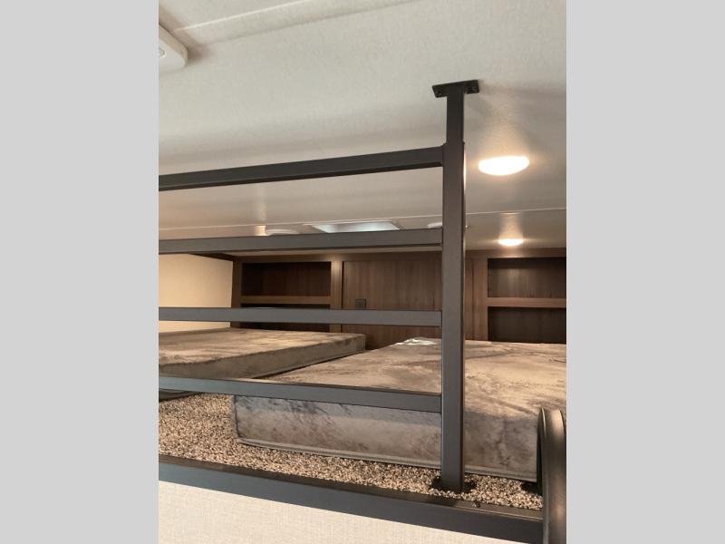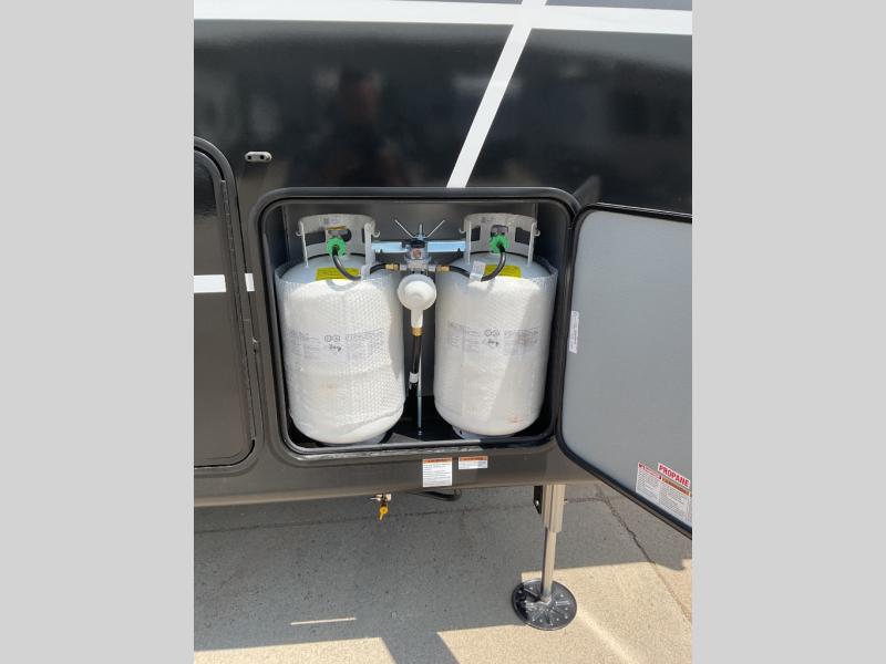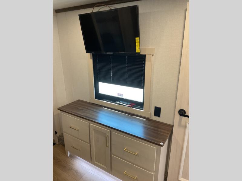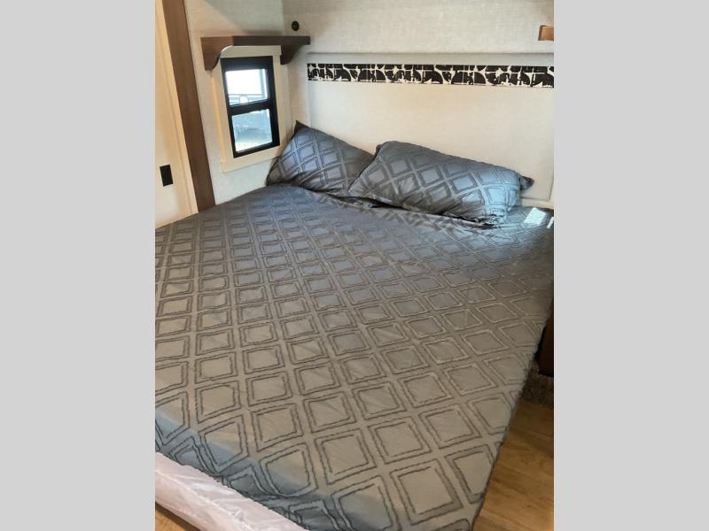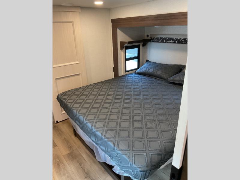 This is the perfect fifth wheel to camp with family or neighbor friends since there are two bedrooms, one of which is a master bedroom with a full rear bath. The second full bath is up front, and both bedrooms include a king bed slide out for added comfort. There is even a loft above the rear bedroom, complete with two bunk mats, two cabinets, and a TV hookup. Everyone can meet in the combined kitchen and living room to enjoy the swivel mounted TV and fireplace across from the theater seating. There is also a wall-mounted dining table with an extension and ottoman.
