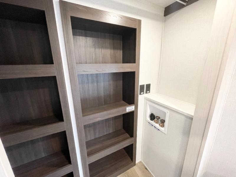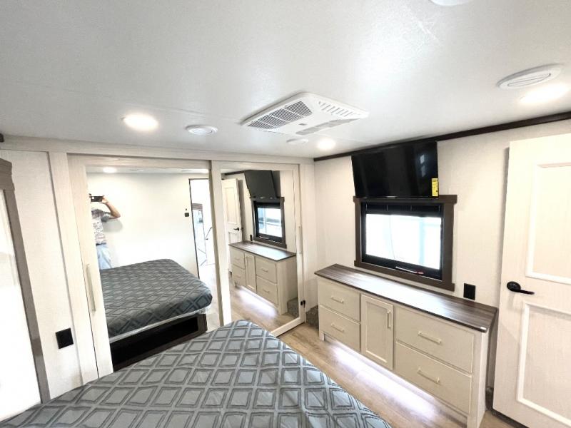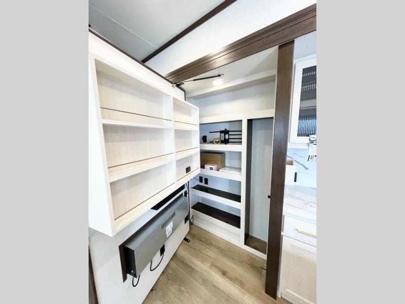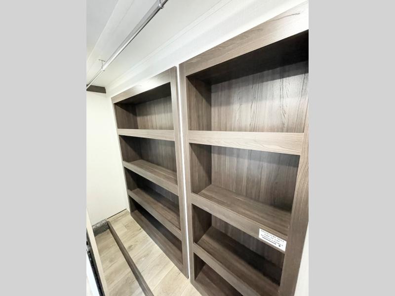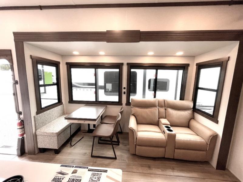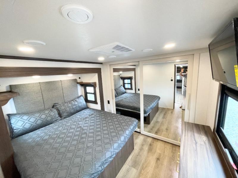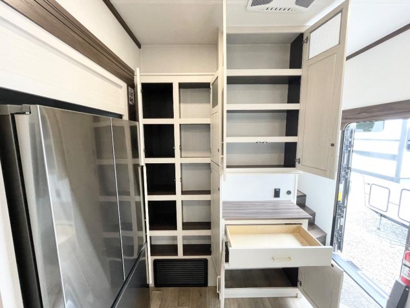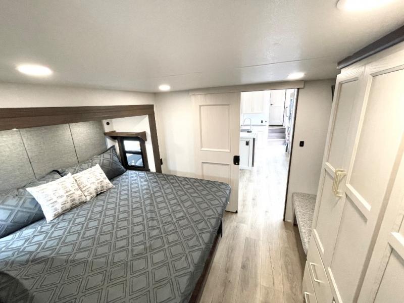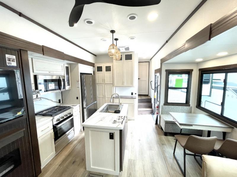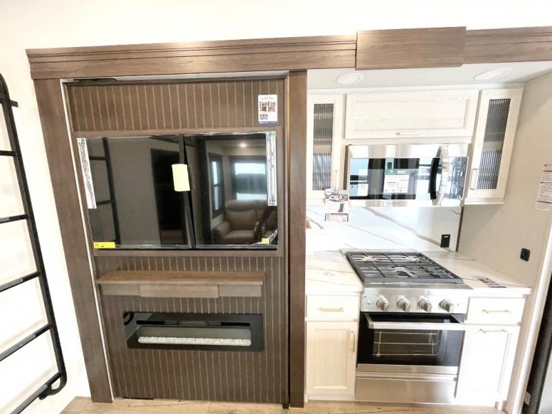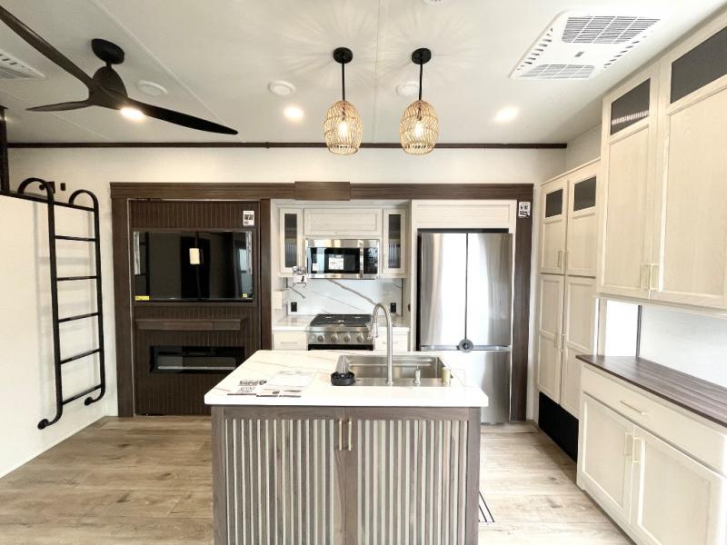 This is the perfect fifth wheel to camp with family or neighbor friends since there are two bedrooms, one of which is a master bedroom with a full rear bath. The second full bath is up front, and both bedrooms include a king bed slide out for added comfort. There is even a loft above the rear bedroom, complete with two bunk mats, two cabinets, and a TV hookup. Everyone can meet in the combined kitchen and living room to enjoy the swivel mounted TV and fireplace across from the theater seating. There is also a wall-mounted dining table with an extension and ottoman.