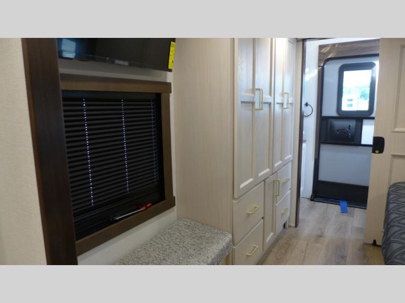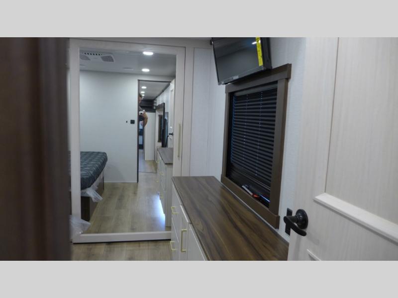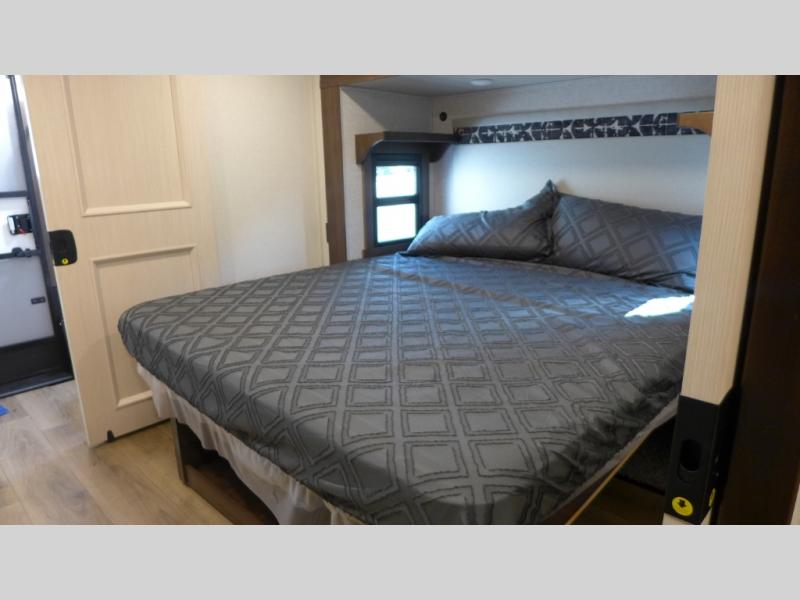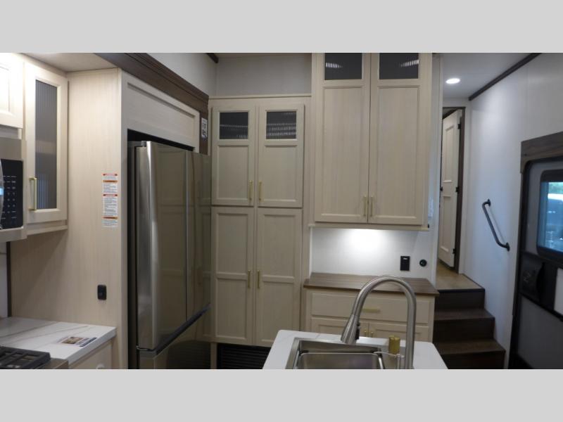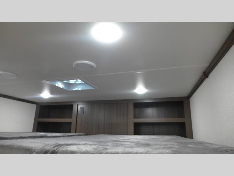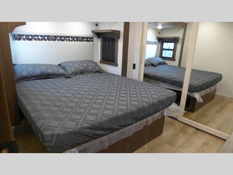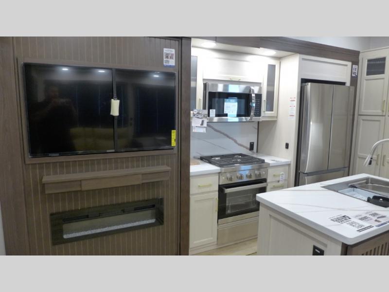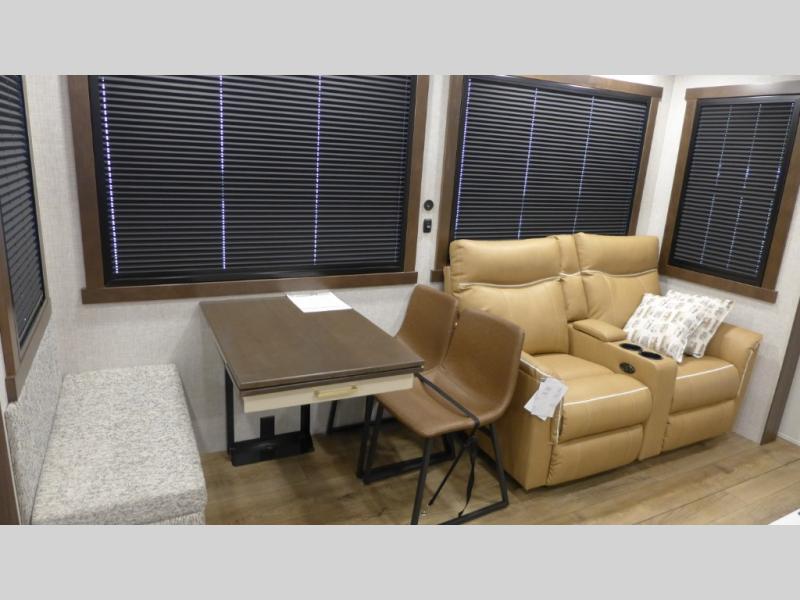 This is the perfect fifth wheel to camp with family or neighbor friends since there are two bedrooms, one of which is a master bedroom with a full rear bath. The second full bath is up front, and both bedrooms include a king bed slide out for added comfort. There is even a loft above the rear bedroom, complete with two bunk mats, two cabinets, and a TV hookup. Everyone can meet in the combined kitchen and living room to enjoy the swivel mounted TV and fireplace across from the theater seating. There is also a wall-mounted dining table with an extension and ottoman.