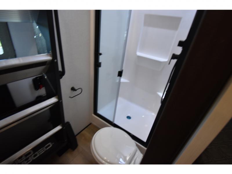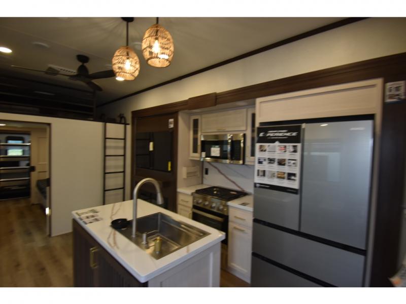 This is the perfect fifth wheel to camp with family or neighbor friends since there are two bedrooms, one of which is a master bedroom with a full rear bath. The second full bath is up front, and both bedrooms include a king bed slide out for added comfort. There is even a loft above the rear bedroom, complete with two bunk mats, two cabinets, and a TV hookup. Everyone can meet in the combined kitchen and living room to enjoy the swivel mounted TV and fireplace across from the theater seating. There is also a wall-mounted dining table with an extension and ottoman.