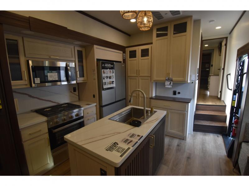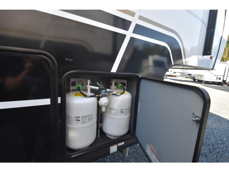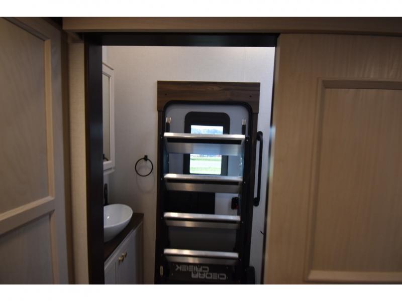 With any Cedar Creek Experience fifth wheel by Forest River, you will bet met with luxury features both inside and out! The True Gelcoat exterior is the best of the best in exteriors and the 3M bonded sidewalls will hold up over years of use. There is also a new 101'' wide-body frame, a Road Warrior suspension, plus a TST tire pressure monitoring system to make towing that much easier. You will find a hidden front storage compartment, along with a 4' x 6' ABS, ribbed, removable underbelly panels, and 6-point hydraulic leveling system, plus many more exterior conveniences. The interior will have you feeling like you haven't left home with vinyl floor coverings, power theater seating with USB ports, a cozy fireplace, vinyl floor covering and the list of comforts goes on! Each model is also pre-wired for satellite to the roof, and you're sure to never go bored with a Smart TV in the bedroom!