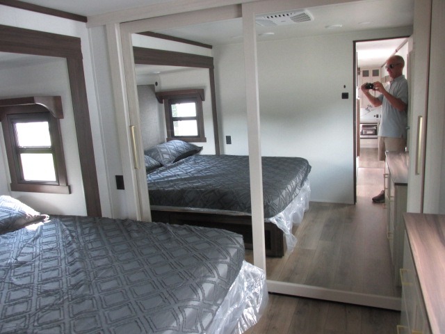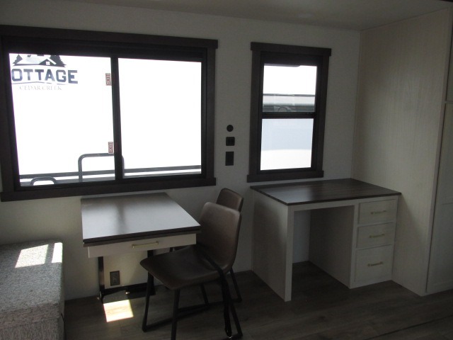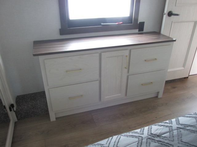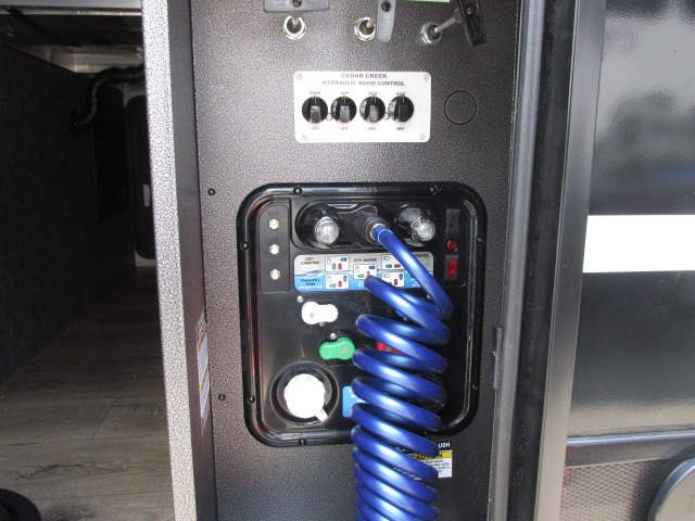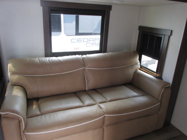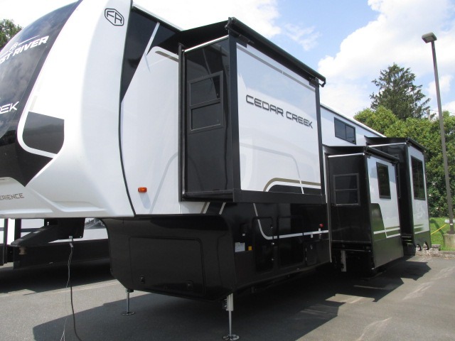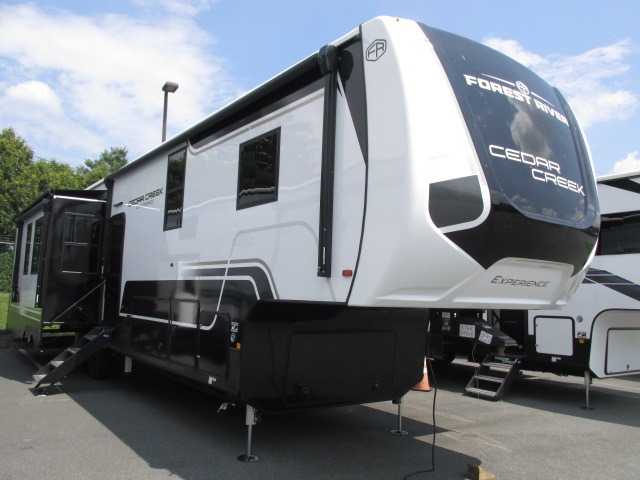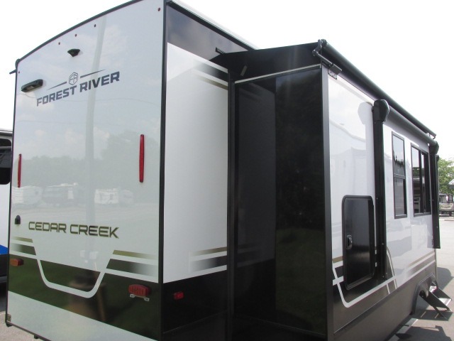 With any Cedar Creek Experience fifth wheel by Forest River, you will bet met with luxury features both inside and out! The True Gelcoat exterior is the best of the best in exteriors and the 3M bonded sidewalls will hold up over years of use. There is also a new 101'' wide-body frame, a Road Warrior suspension, plus a TST tire pressure monitoring system to make towing that much easier. You will find a hidden front storage compartment, along with a 4' x 6' ABS, ribbed, removable underbelly panels, and 6-point hydraulic leveling system, plus many more exterior conveniences. The interior will have you feeling like you haven't left home with vinyl floor coverings, power theater seating with USB ports, a cozy fireplace, vinyl floor covering and the list of comforts goes on! Each model is also pre-wired for satellite to the roof, and you're sure to never go bored with a Smart TV in the bedroom!