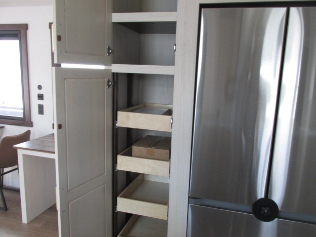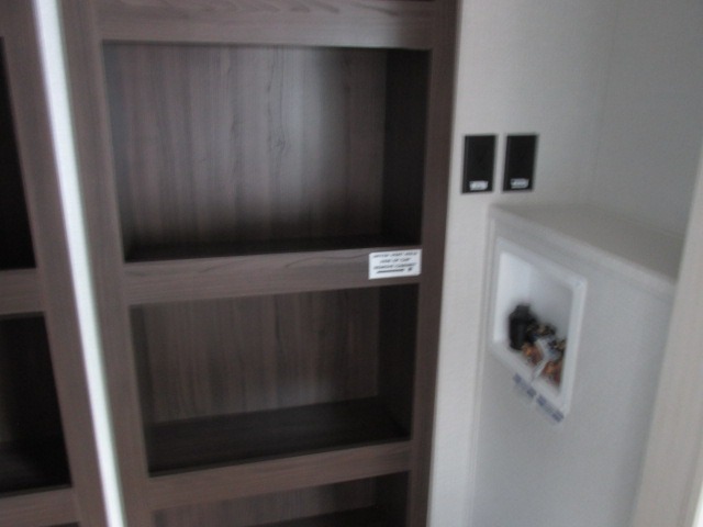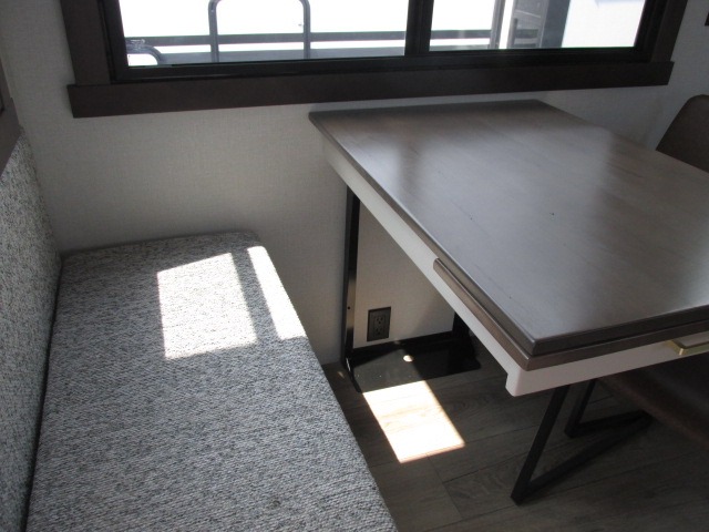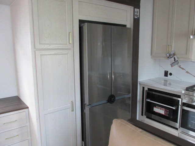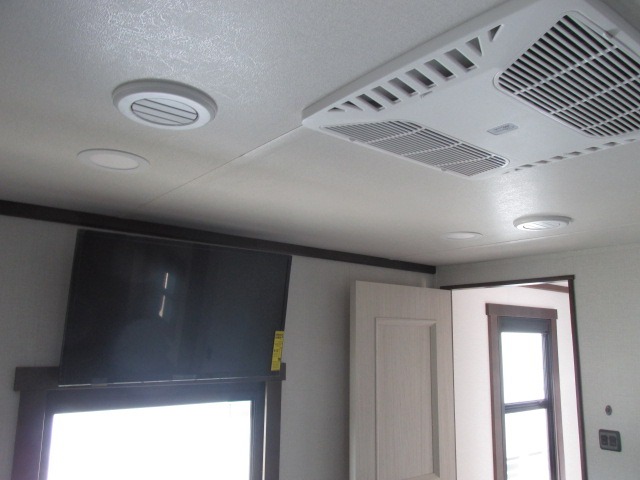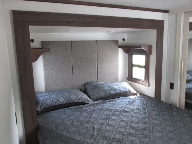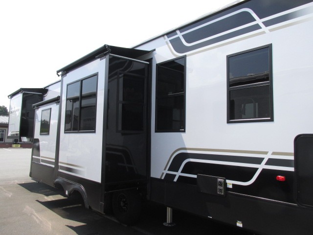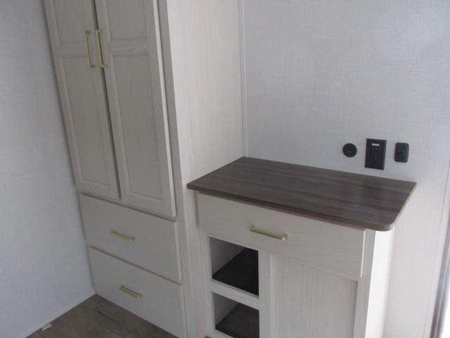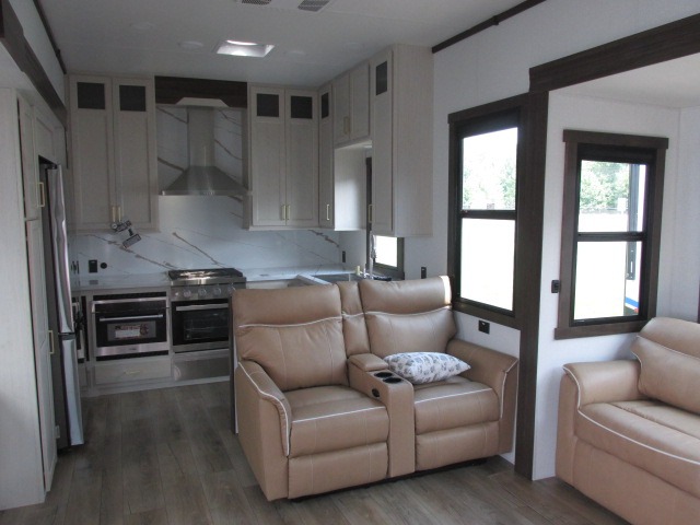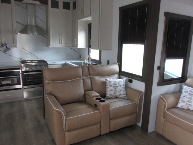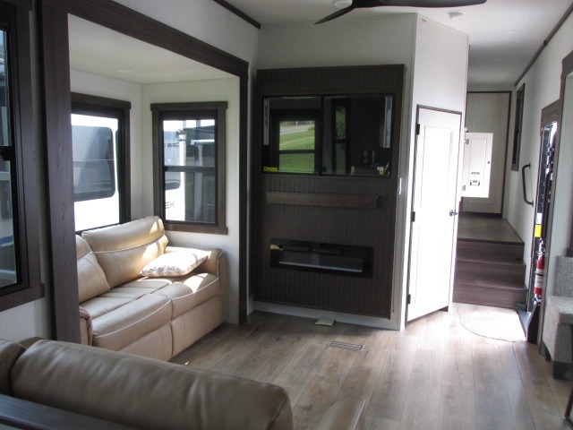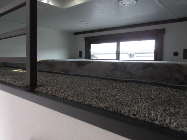A front kitchen with ample counter space, a middle den, and a front bedroom make this fifth wheel one to remember! The living area will be a favorite spot to visit together since there is a hide-a-bed sofa and theater seating, plus an entertainment center with a fireplace. There is also a free-standing dining table and a desk with a chair if you need to telecommute. Your guests will love the middle den with a hide-a-bed sofa and a closet for their things, plus there is a loft above this room for added sleeping or storage space. A spacious full bath includes a shower with a seat, and the king bed slide out in the front private bedroom is sure to bring a great night's rest.