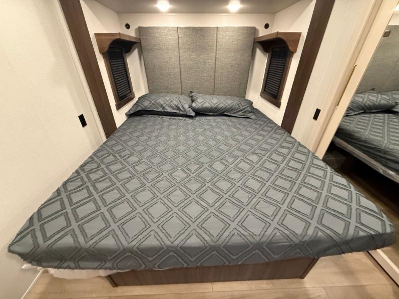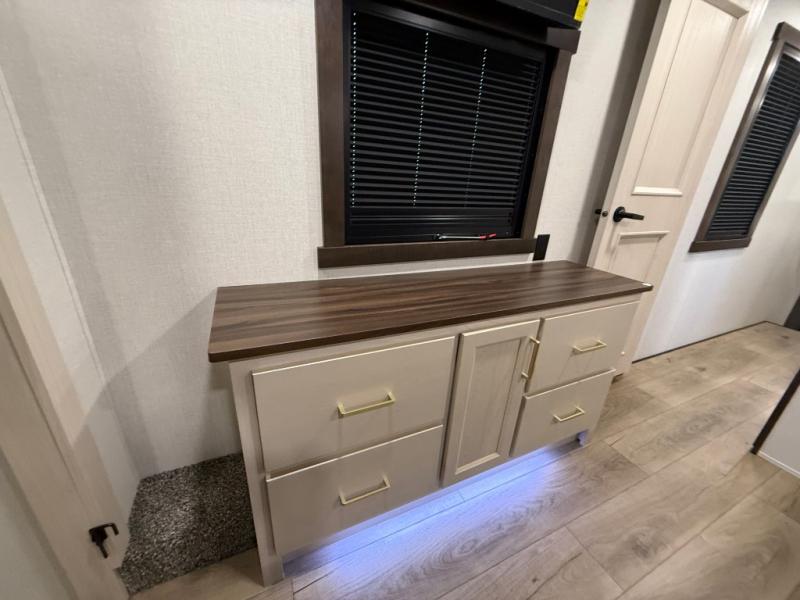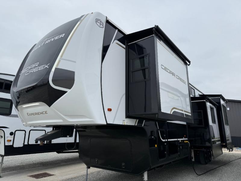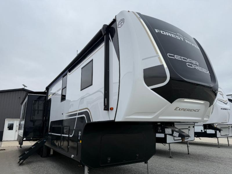 With any Cedar Creek Experience fifth wheel by Forest River, you will bet met with luxury features both inside and out! The True Gelcoat exterior is the best of the best in exteriors and the 3M bonded sidewalls will hold up over years of use. There is also a new 101'' wide-body frame, a Road Warrior suspension, plus a TST tire pressure monitoring system to make towing that much easier. You will find a hidden front storage compartment, along with a 4' x 6' ABS, ribbed, removable underbelly panels, and 6-point hydraulic leveling system, plus many more exterior conveniences. The interior will have you feeling like you haven't left home with vinyl floor coverings, power theater seating with USB ports, a cozy fireplace, vinyl floor covering and the list of comforts goes on! Each model is also pre-wired for satellite to the roof, and you're sure to never go bored with a Smart TV in the bedroom!