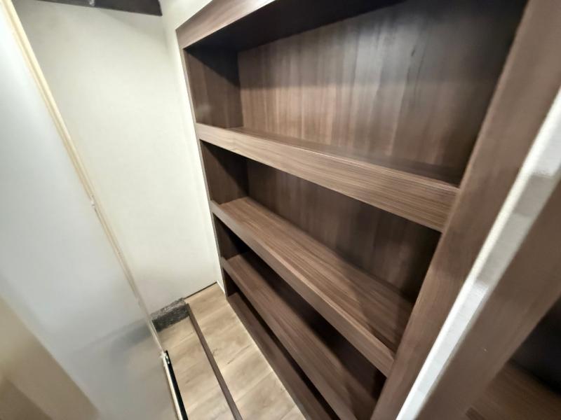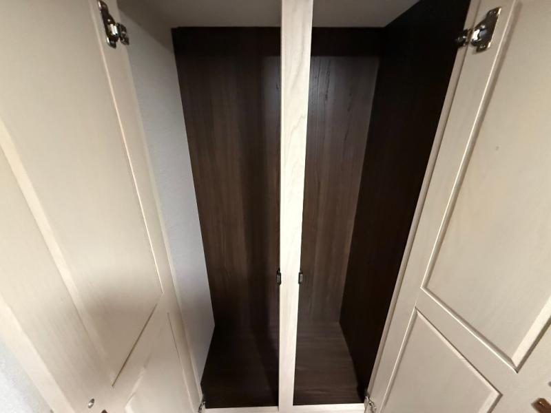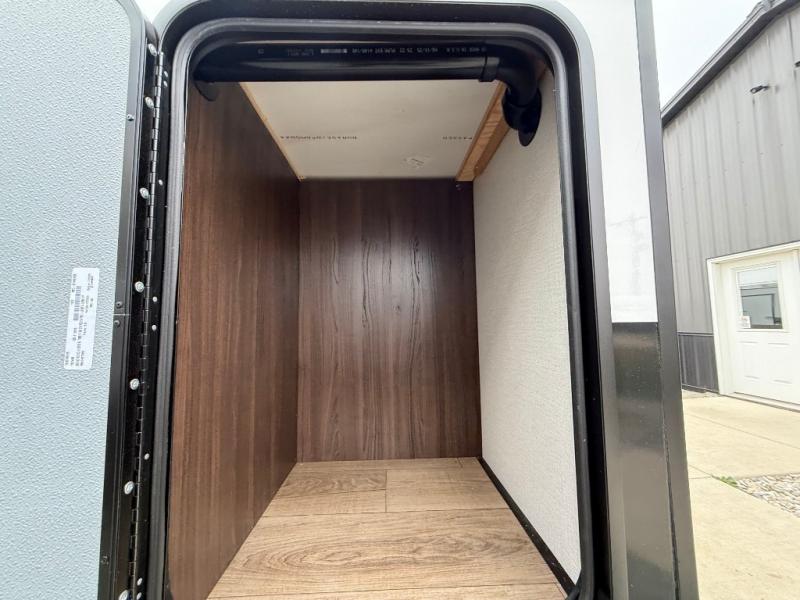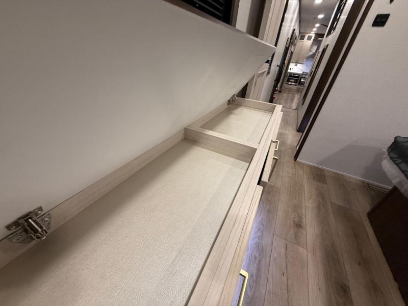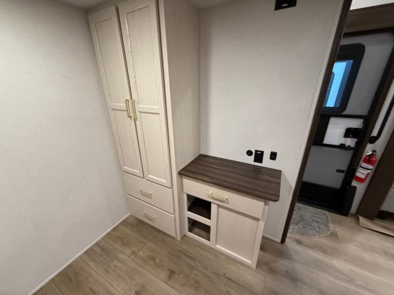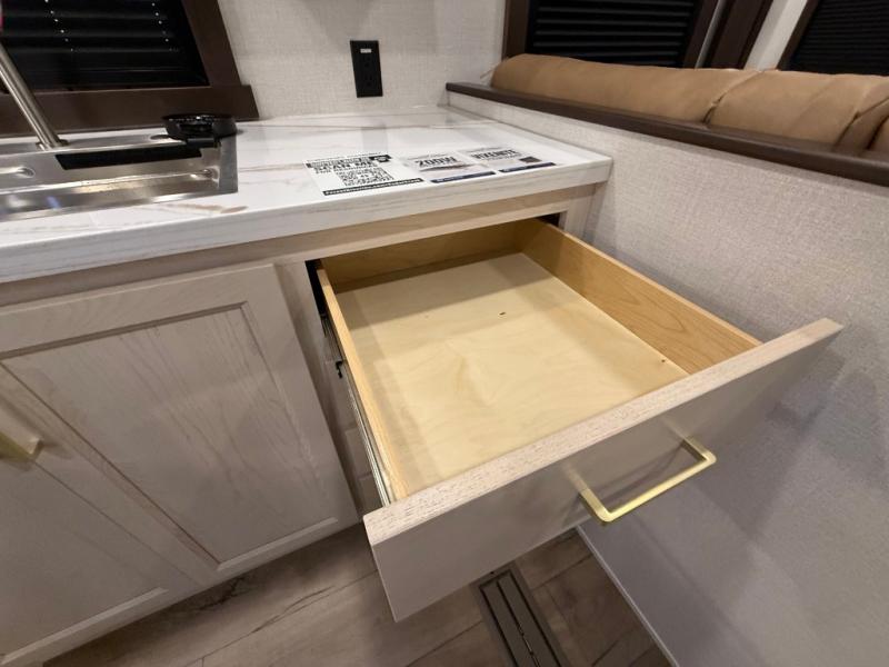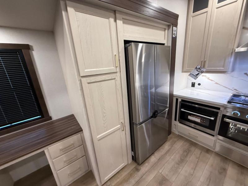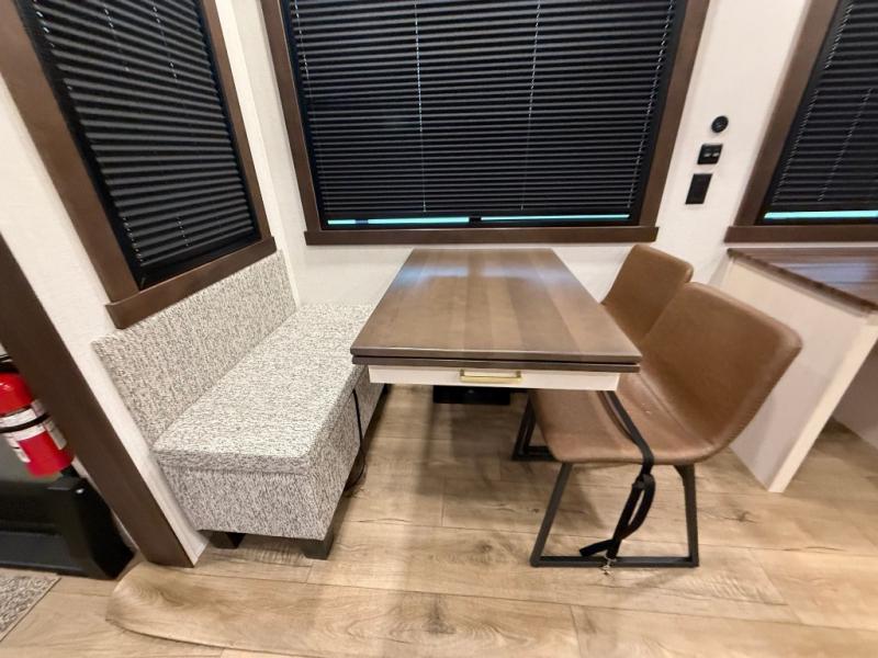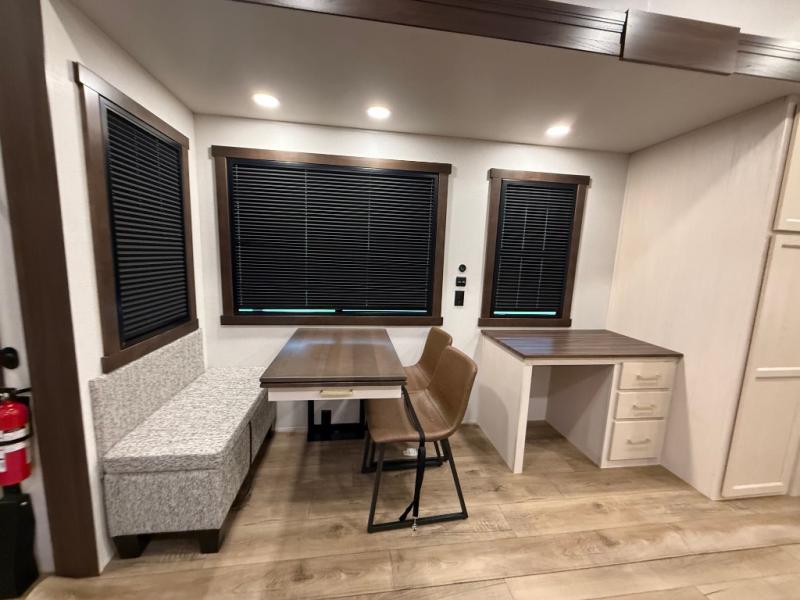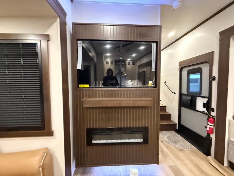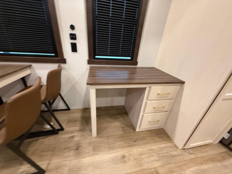 A front kitchen with ample counter space, a middle den, and a front bedroom make this fifth wheel one to remember! The living area will be a favorite spot to visit together since there is a hide-a-bed sofa and theater seating, plus an entertainment center with a fireplace. There is also a free-standing dining table and a desk with a chair if you need to telecommute. Your guests will love the middle den with a hide-a-bed sofa and a closet for their things, plus there is a loft above this room for added sleeping or storage space. A spacious full bath includes a shower with a seat, and the king bed slide out in the front private bedroom is sure to bring a great night's rest.
