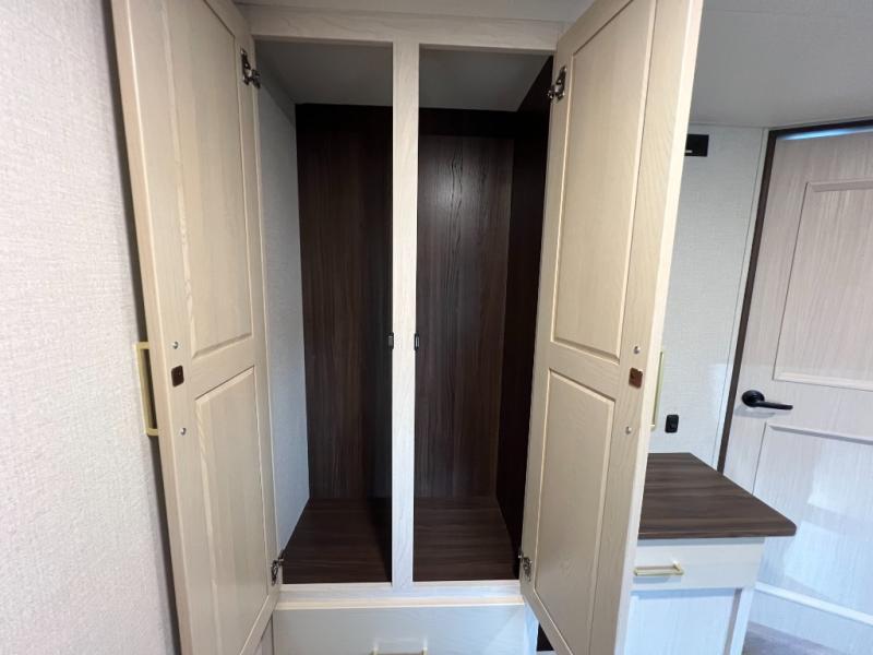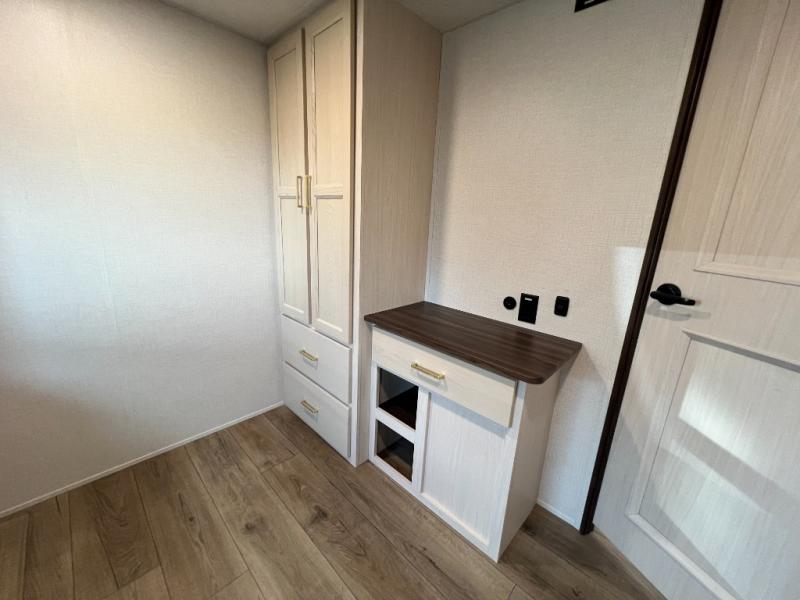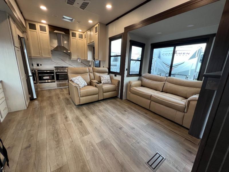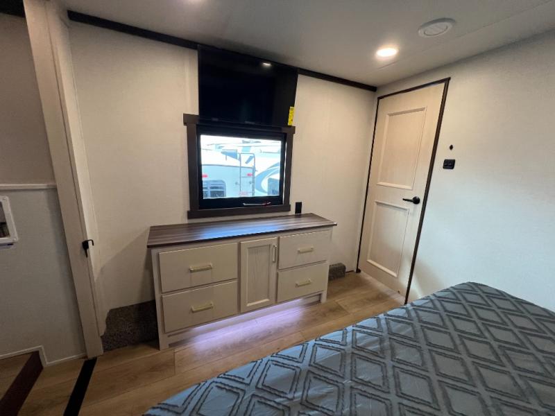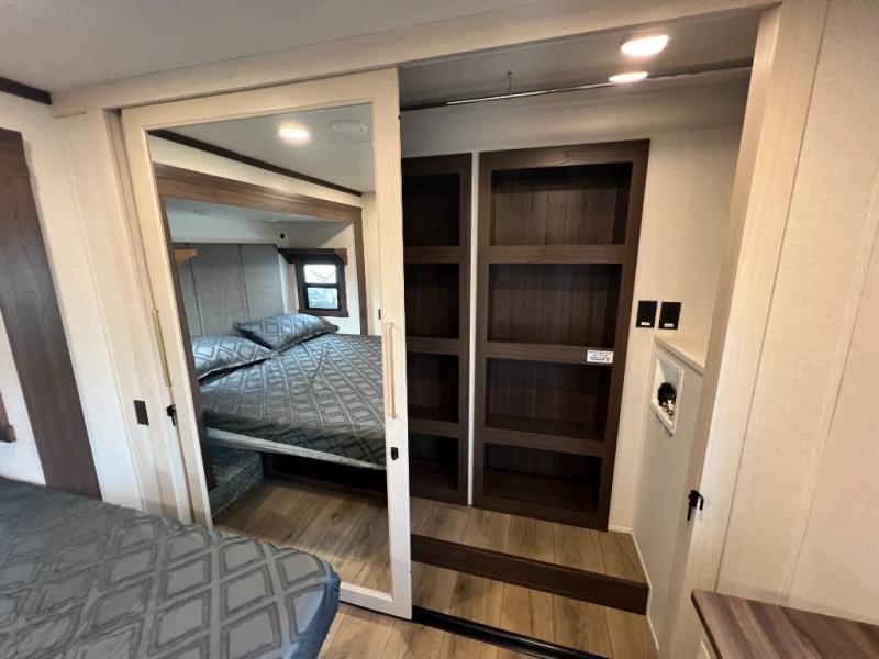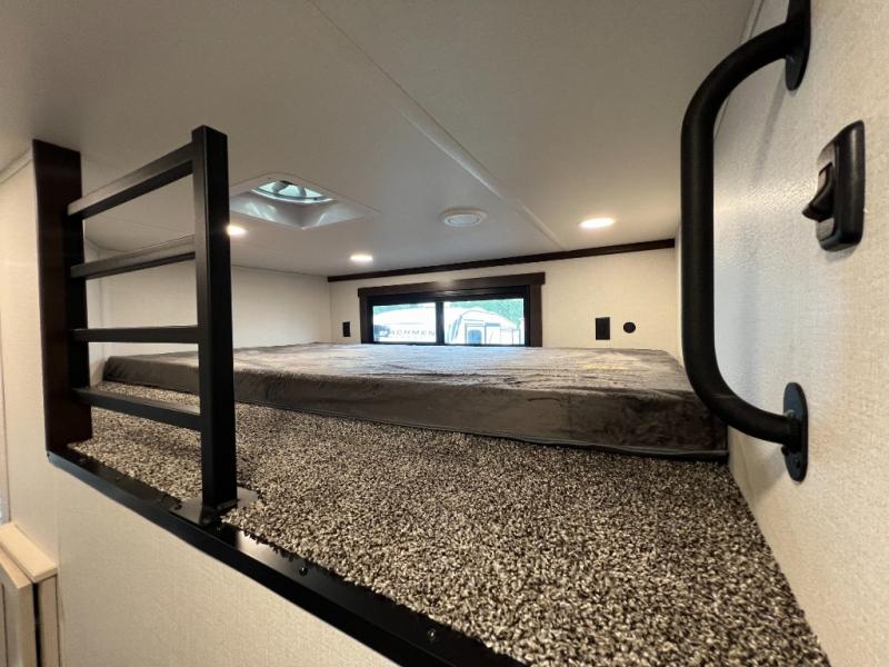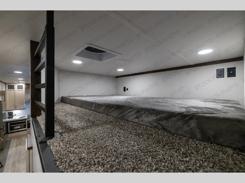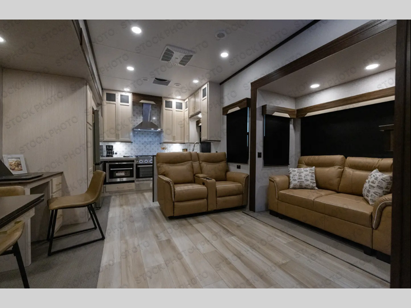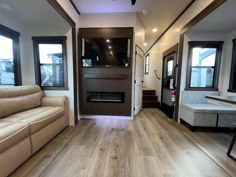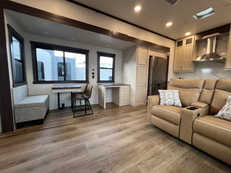 A front kitchen with ample counter space, a middle den, and a front bedroom make this fifth wheel one to remember! The living area will be a favorite spot to visit together since there is a hide-a-bed sofa and theater seating, plus an entertainment center with a fireplace. There is also a free-standing dining table and a desk with a chair if you need to telecommute. Your guests will love the middle den with a hide-a-bed sofa and a closet for their things, plus there is a loft above this room for added sleeping or storage space. A spacious full bath includes a shower with a seat, and the king bed slide out in the front private bedroom is sure to bring a great night's rest.