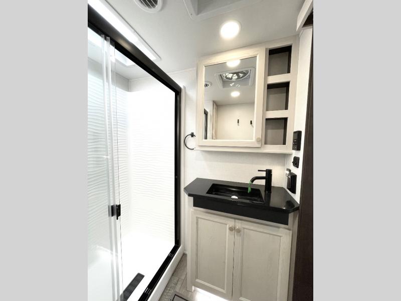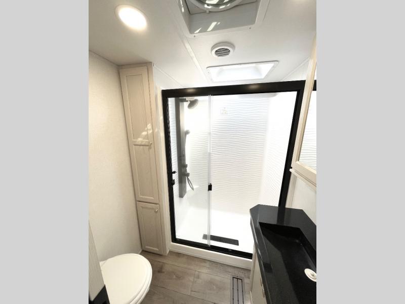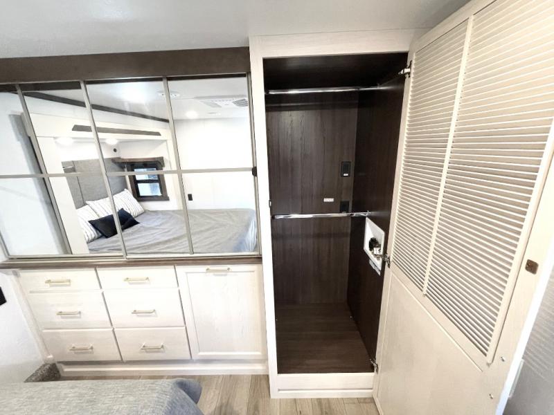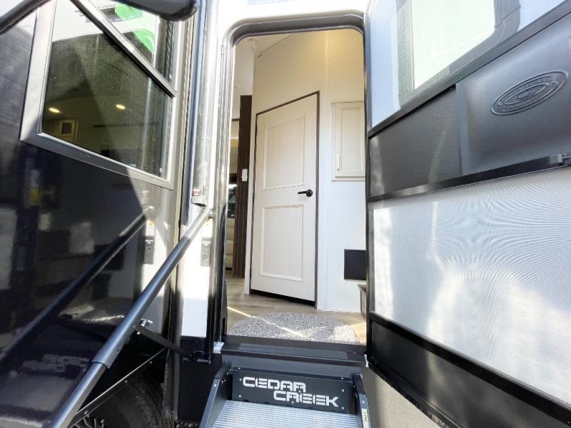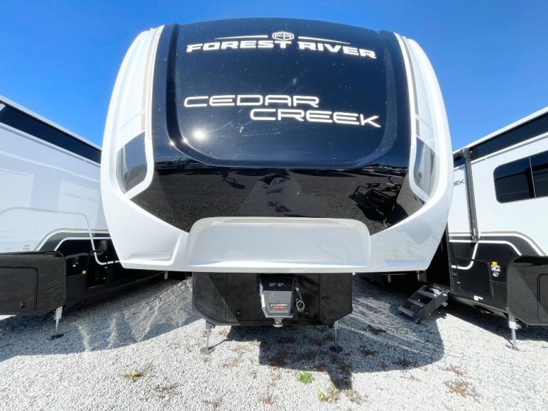 With any Cedar Creek Experience fifth wheel by Forest River, you will bet met with luxury features both inside and out! The True Gelcoat exterior is the best of the best in exteriors and the 3M bonded sidewalls will hold up over years of use. There is also a new 101'' wide-body frame, a Road Warrior suspension, plus a TST tire pressure monitoring system to make towing that much easier. You will find a hidden front storage compartment, along with a 4' x 6' ABS, ribbed, removable underbelly panels, and 6-point hydraulic leveling system, plus many more exterior conveniences. The interior will have you feeling like you haven't left home with vinyl floor coverings, power theater seating with USB ports, a cozy fireplace, vinyl floor covering and the list of comforts goes on! Each model is also pre-wired for satellite to the roof, and you're sure to never go bored with a Smart TV in the bedroom!