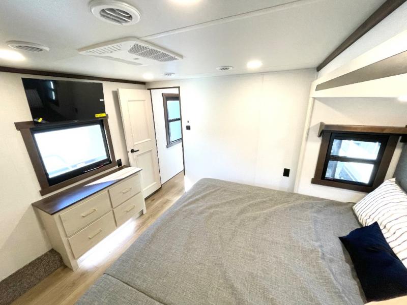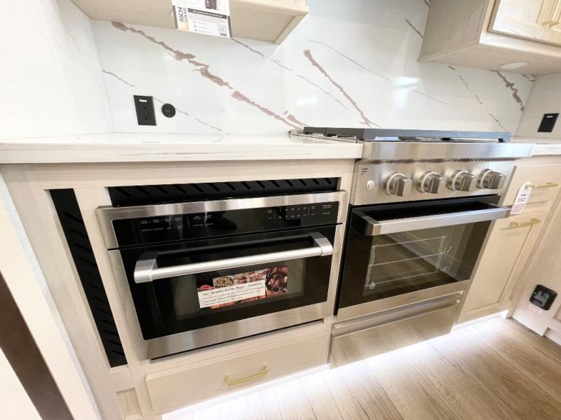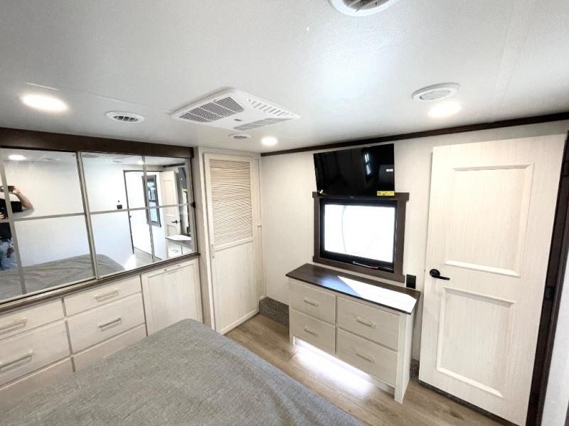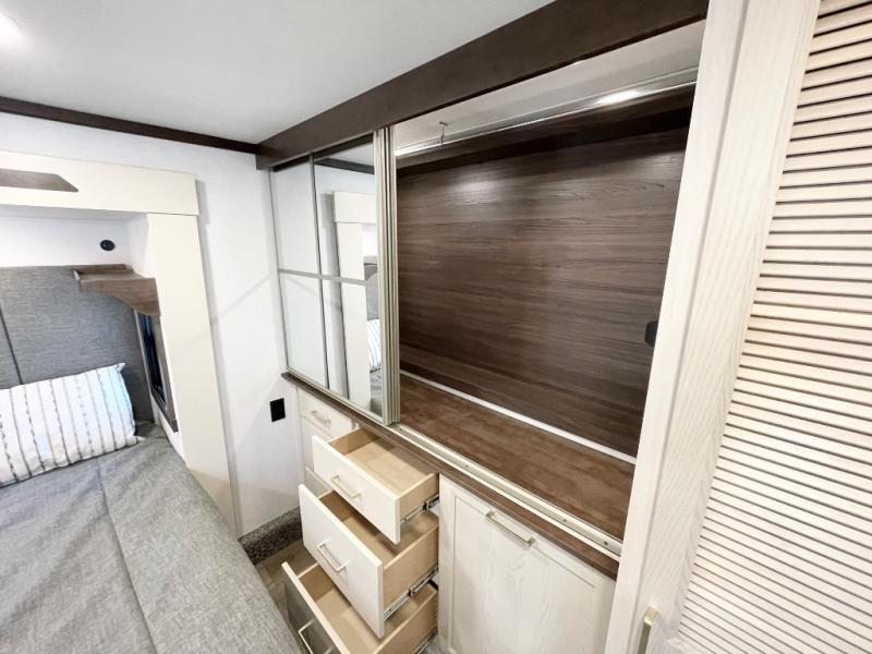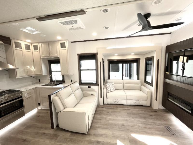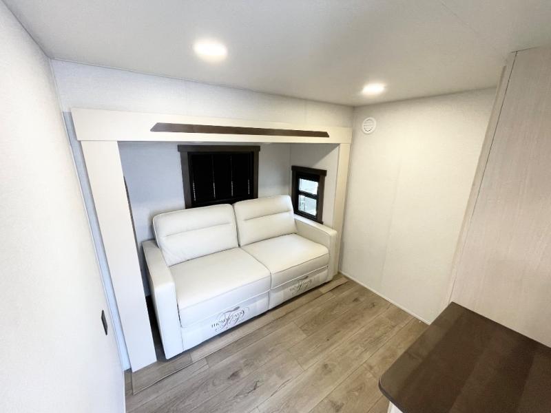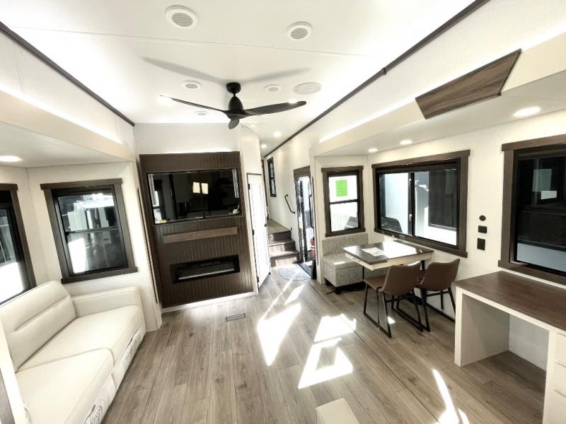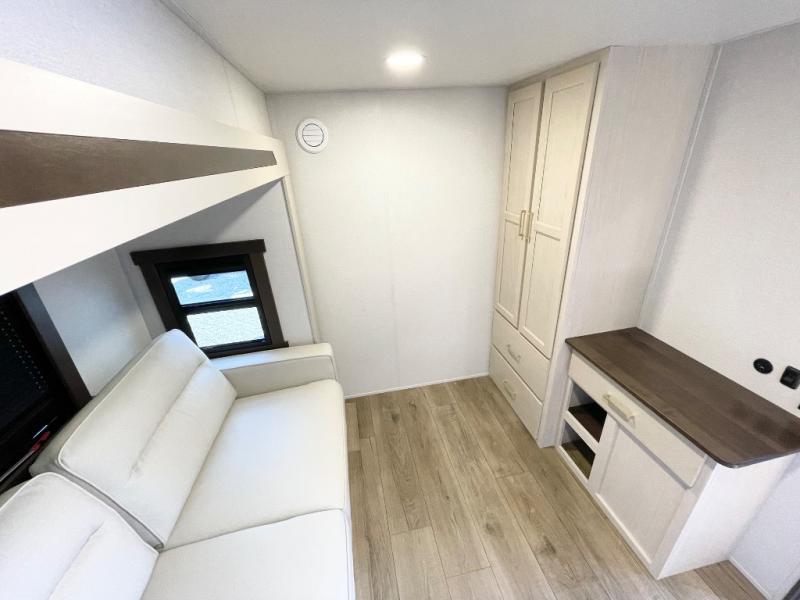 A front kitchen with ample counter space, a middle den, and a front bedroom make this fifth wheel one to remember! The living area will be a favorite spot to visit together since there is a hide-a-bed sofa and theater seating, plus an entertainment center with a fireplace. There is also a free-standing dining table and a desk with a chair if you need to telecommute. Your guests will love the middle den with a hide-a-bed sofa and a closet for their things, plus there is a loft above this room for added sleeping or storage space. A spacious full bath includes a shower with a seat, and the king bed slide out in the front private bedroom is sure to bring a great night's rest.