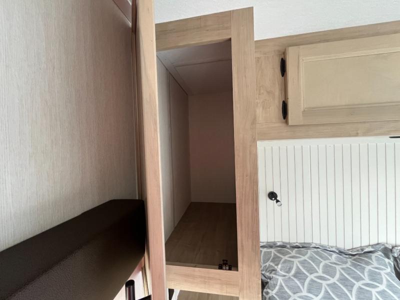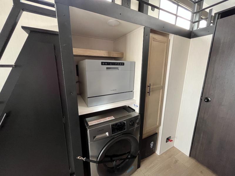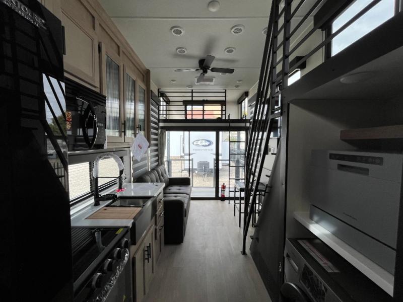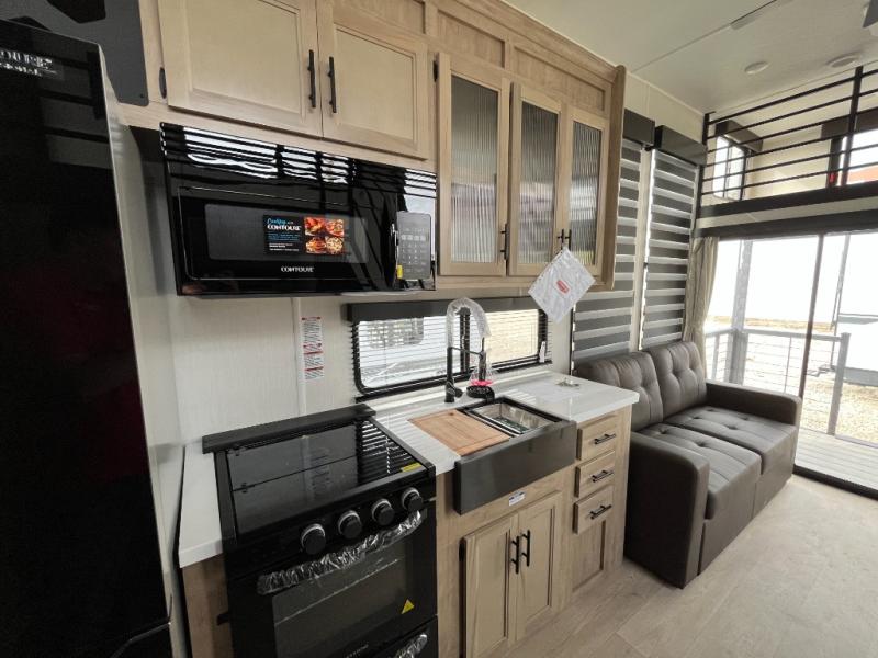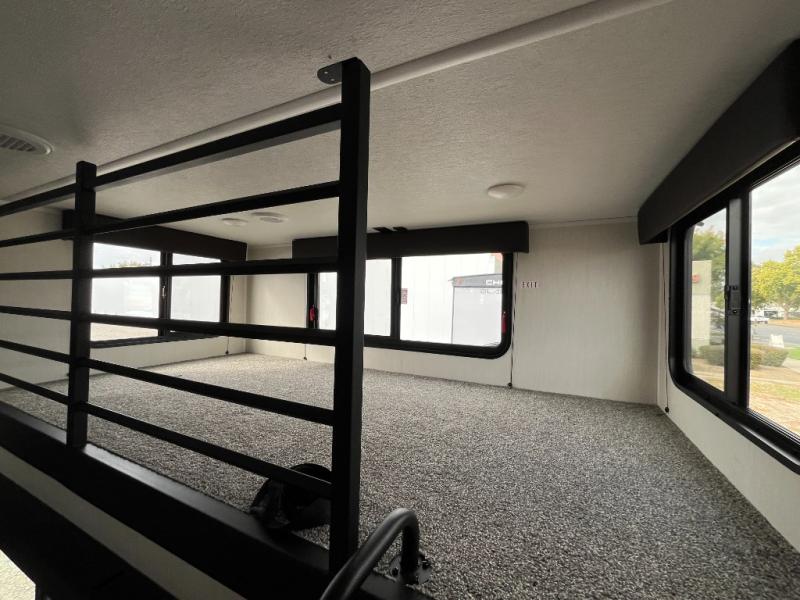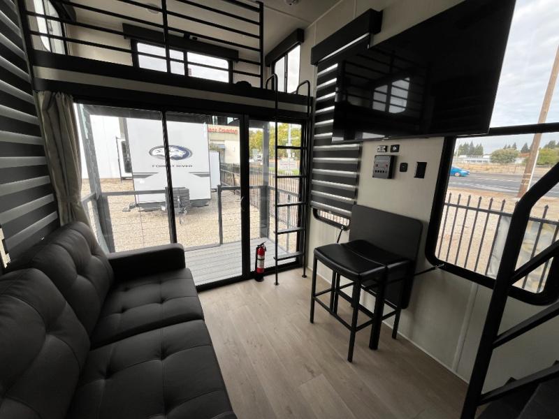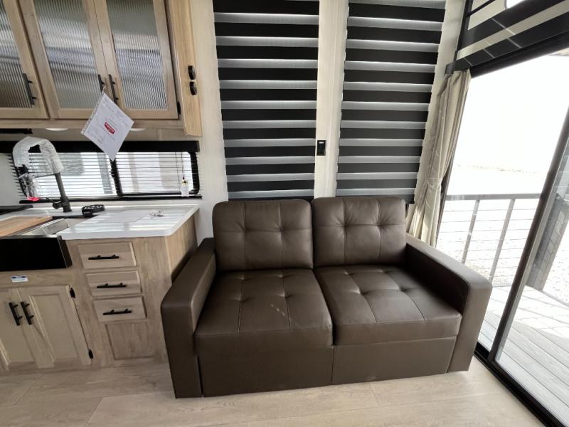 This model is similar to 16ML but larger! A bigger bathroom, RV king bed in the lower master, and a queen bed plus a twin bunk mat in the front loft. And the second loft can be utilized as extra sleeping space or storage space! There is an 18 cu. ft. refrigerator so you can stock up for a week long vacation, a hide-a-bed sofa that can transform into added sleeping for guests, and a high top table with two stools to dine at. The bathroom below is split with a shower on one side, and a private toilet area and sink opposite. And the view is amazing from just about anywhere inside.