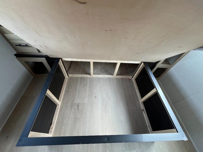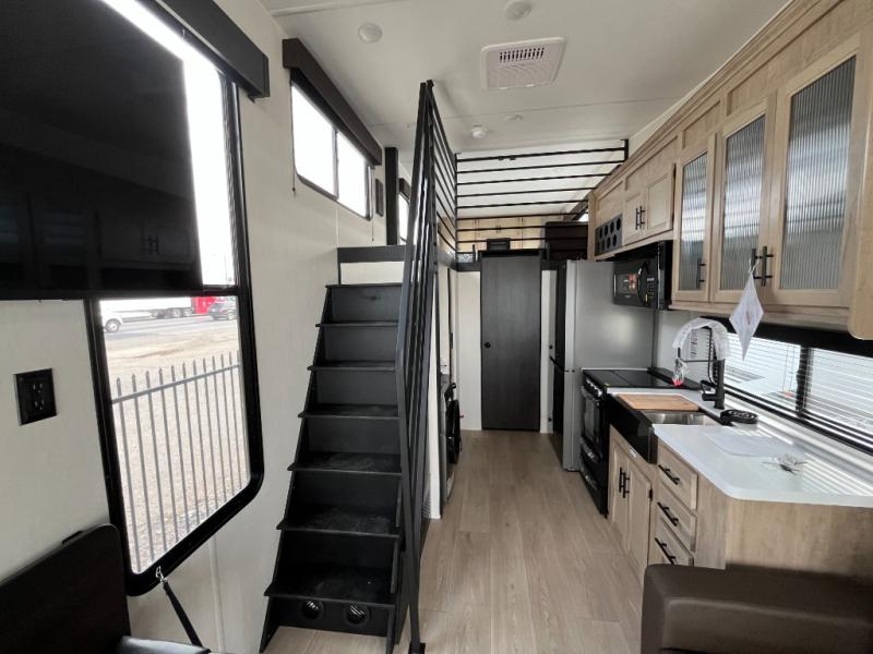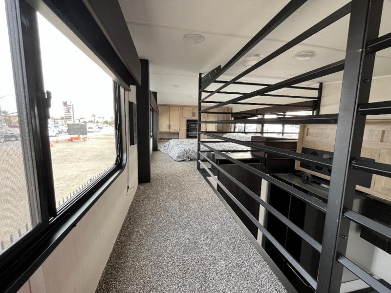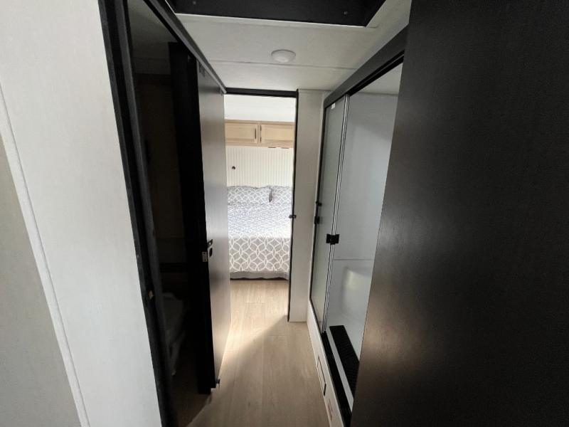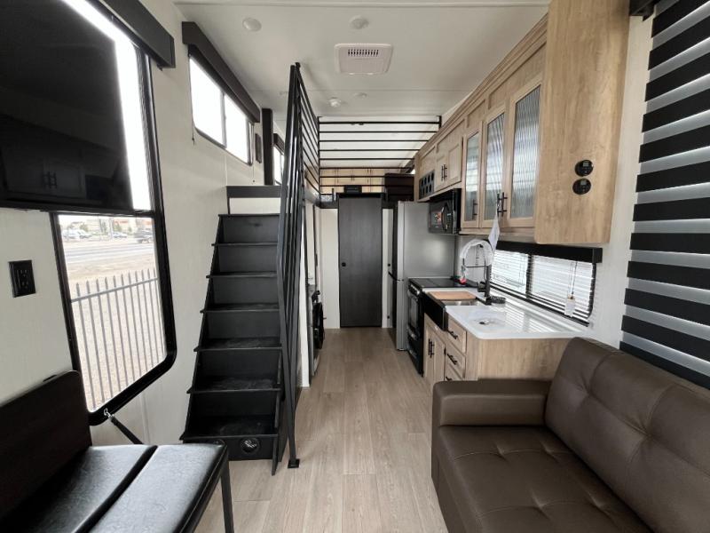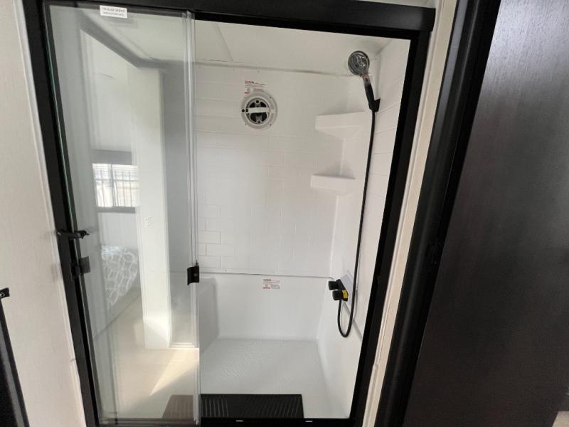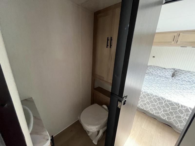 This model is similar to 16ML but larger! A bigger bathroom, RV king bed in the lower master, and a queen bed plus a twin bunk mat in the front loft. And the second loft can be utilized as extra sleeping space or storage space! There is an 18 cu. ft. refrigerator so you can stock up for a week long vacation, a hide-a-bed sofa that can transform into added sleeping for guests, and a high top table with two stools to dine at. The bathroom below is split with a shower on one side, and a private toilet area and sink opposite. And the view is amazing from just about anywhere inside.