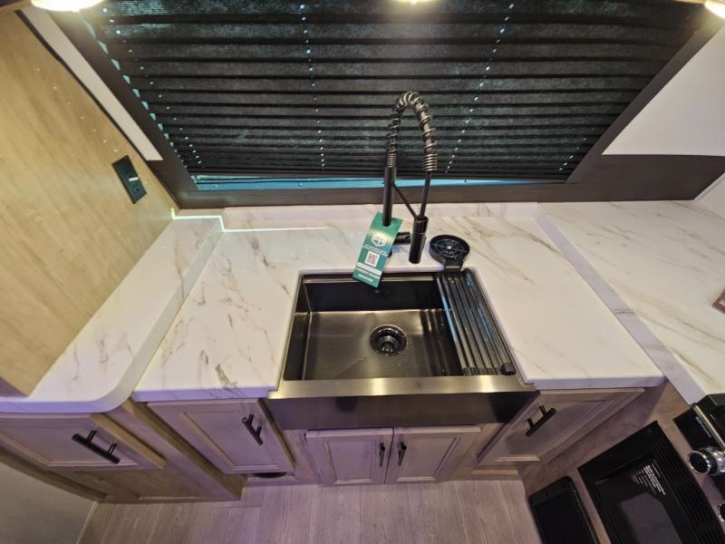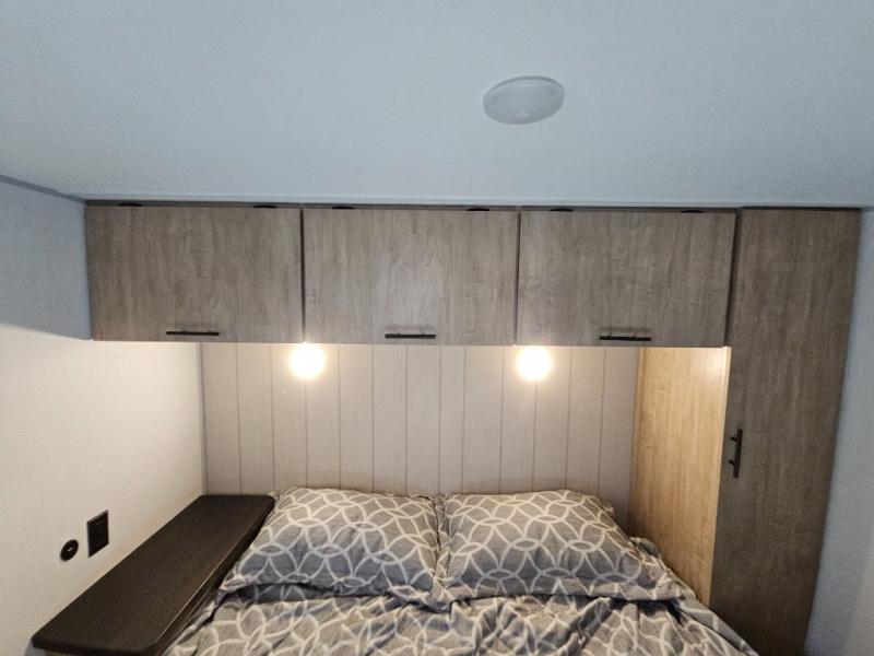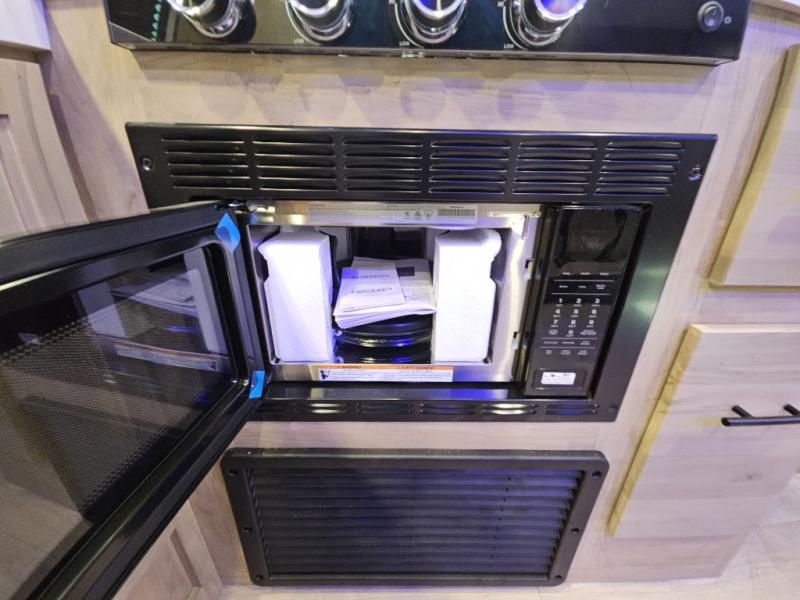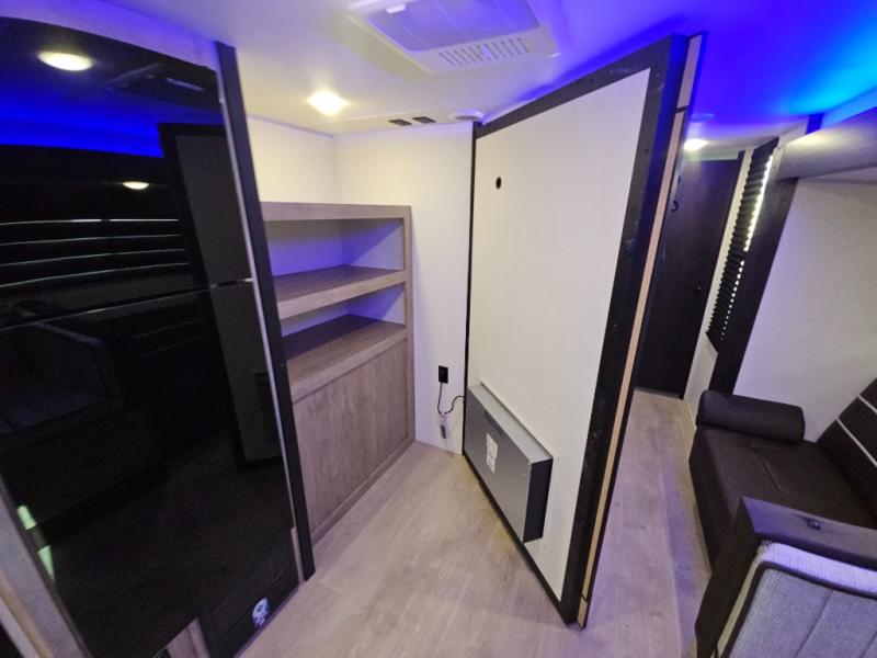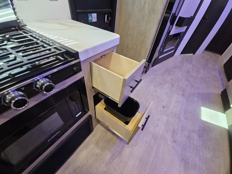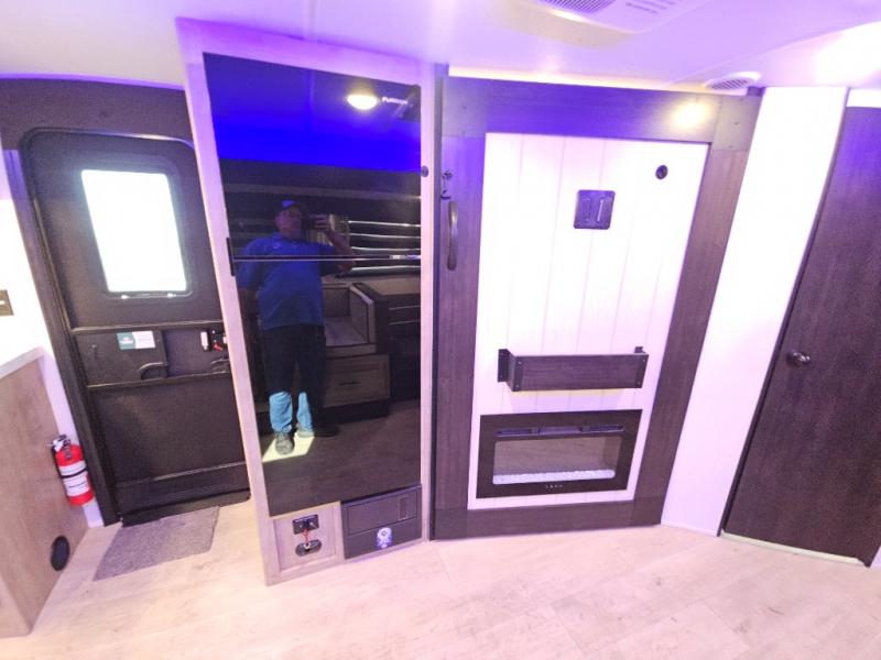 Since this travel trailer features dual entry doors, you can enter in through the rear master bedroom or the front kitchen; how convenient! The kitchen includes ample counter space and all the appliances to prep meals, along with a pantry up front and a hidden pantry behind the fireplace. Your crew can get comfortable on the sofa or play a game around the U-shaped dinette, although you may just find yourselves outdoors since there is an outside kitchen and a power awning with LED lights. The dual entry bath will let you enter in through the main living area, plus it has a private entrance into the bedroom. Here, you'll find an RV king bed, a wardrobe for your things, and USB ports to keep your electronics charged!