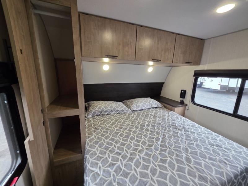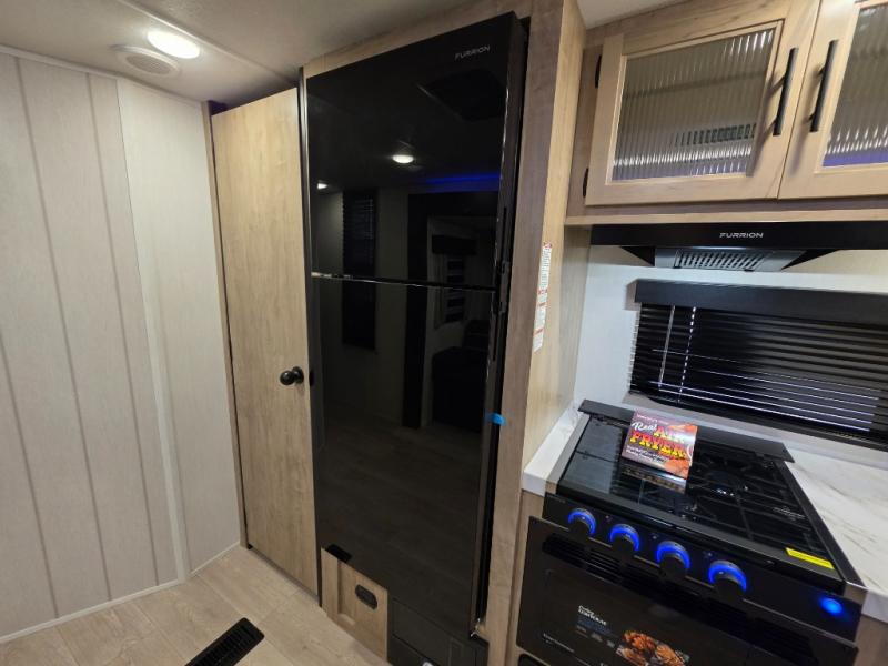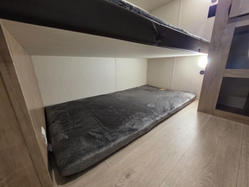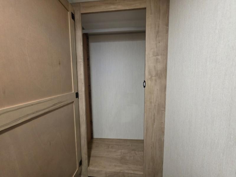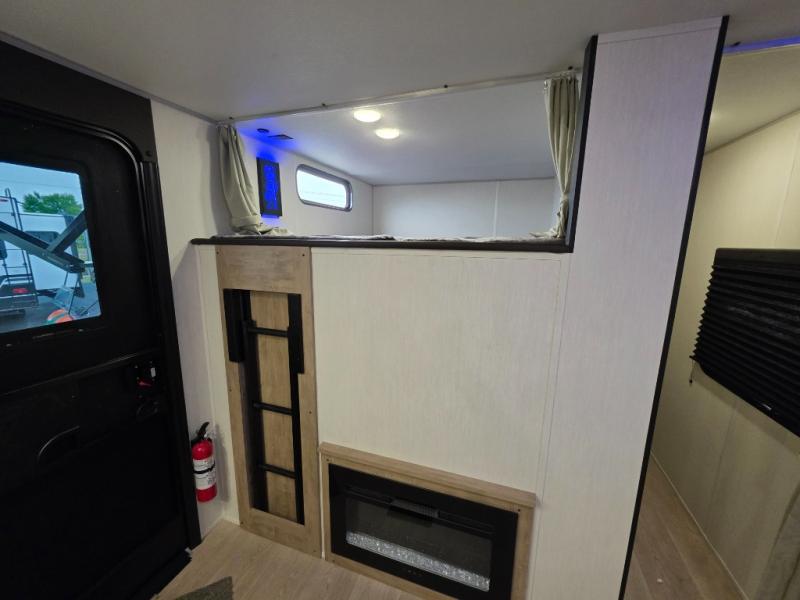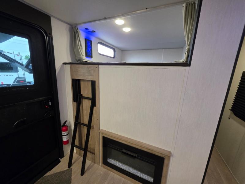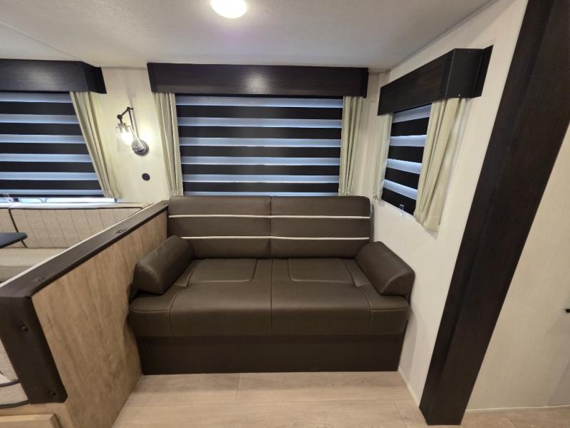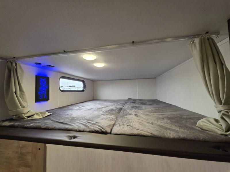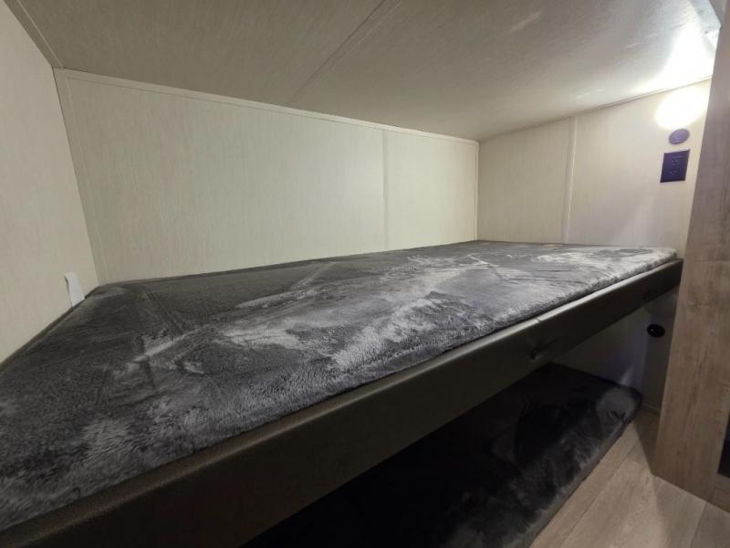 Versatile Rear Bunkroom with Sofa: The rear of the trailer includes a bunk over a jackknife sofa and a second bunk overhead that's perfect for kids, teens, or even extra storage. Sliding doors give the room privacy for sleeping or relaxing.
