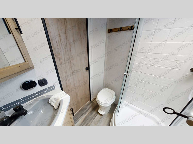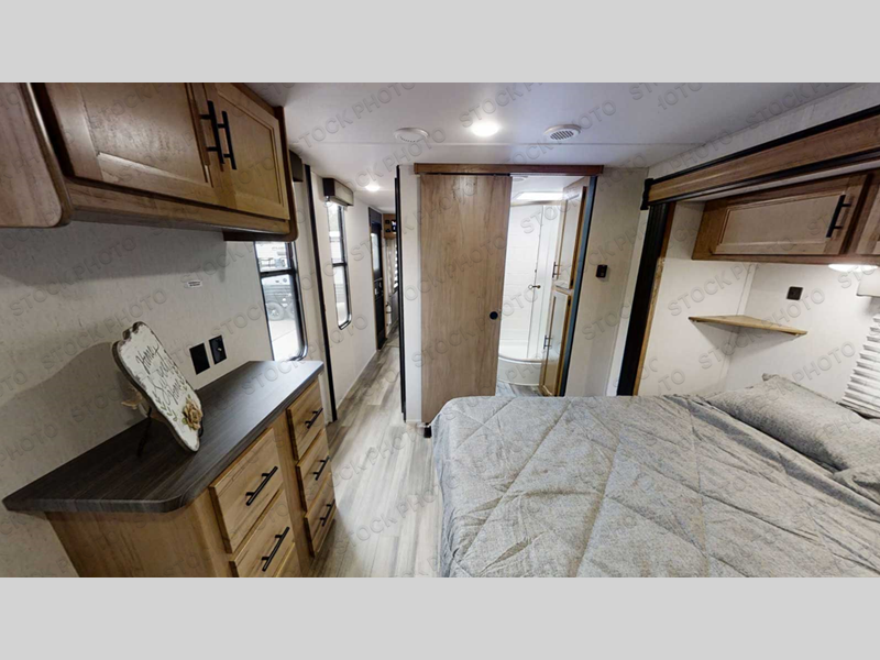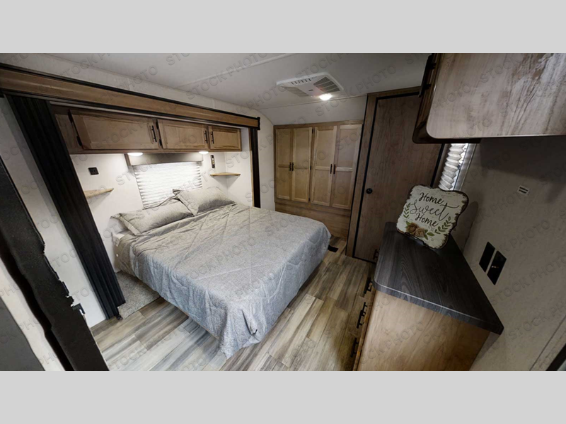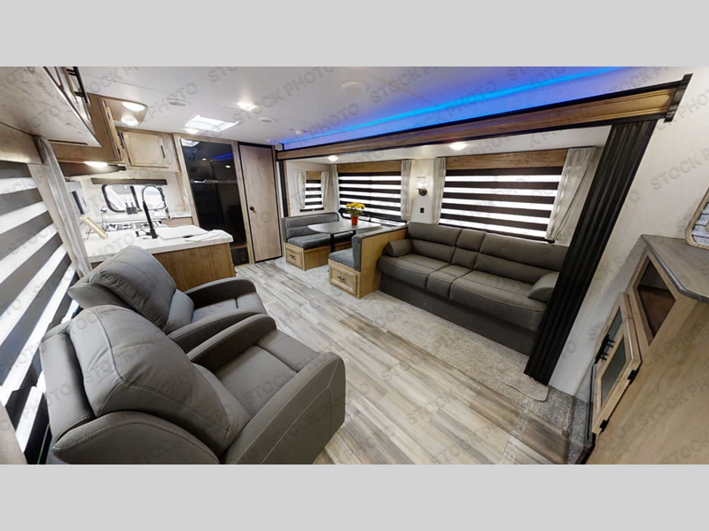 You will feel right at home camping in this travel trailer! The front private bedroom has a queen bed slide with shelves and overhead cabinets, a dresser with overhead cabinets, a front large closet to hang your clothes, and another closet that is prepped to add an optional washer and dryer, plus you can switch out the queen bed for an optional king bed. You even have an entrance into the dual entry bathroom which has a radius shower to freshen up in each morning and a linen closet to keep your towels close. The rear kitchen has enough countertop space to prepare your best meals and cook them on the three burner cooktop, plus a large pantry to store your canned goods. You could even cook your meals at the outside kitchen with the two burner cooktop and then enjoy them at the booth dinette. The two recliners and sofa offer comfortable places to relax by the fireplace with a TV mount above it!