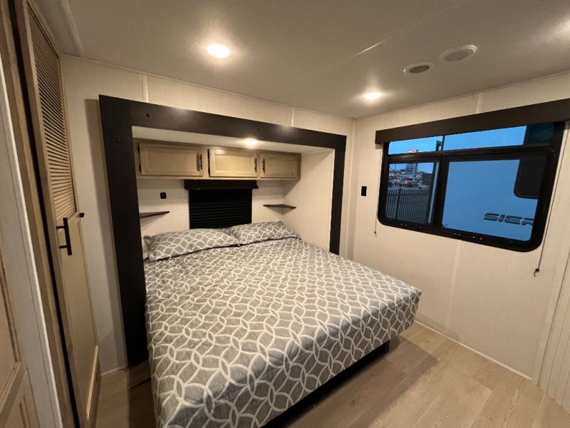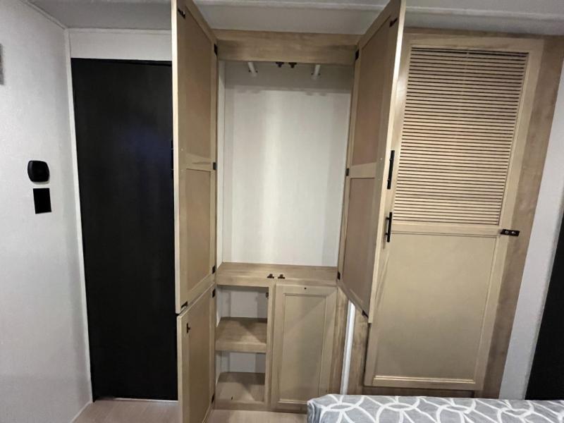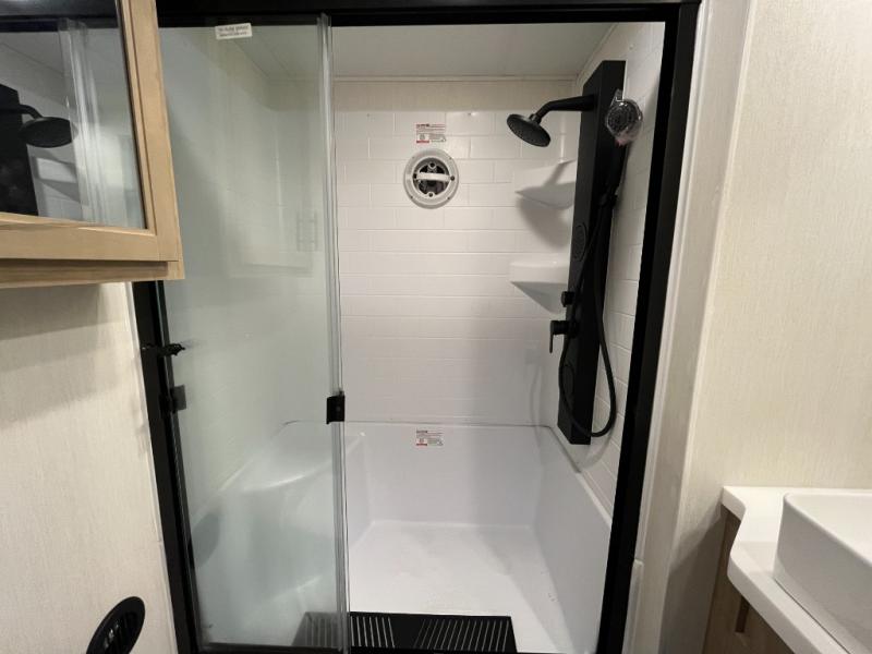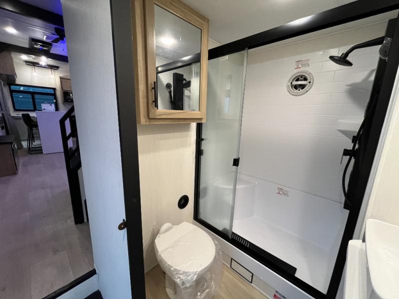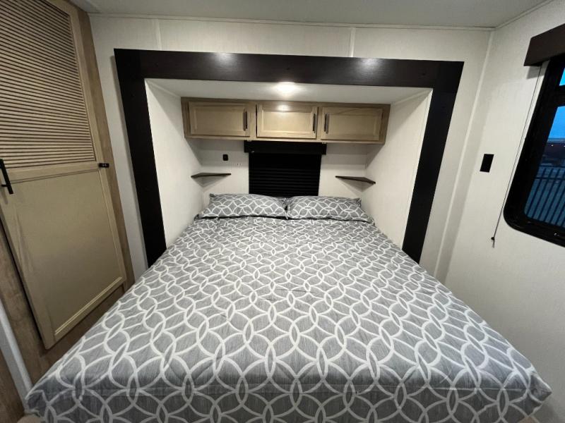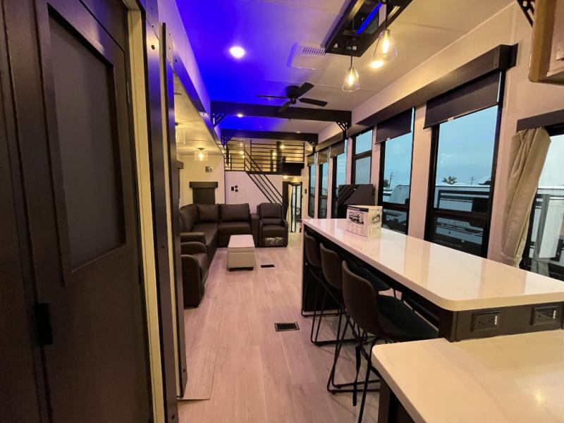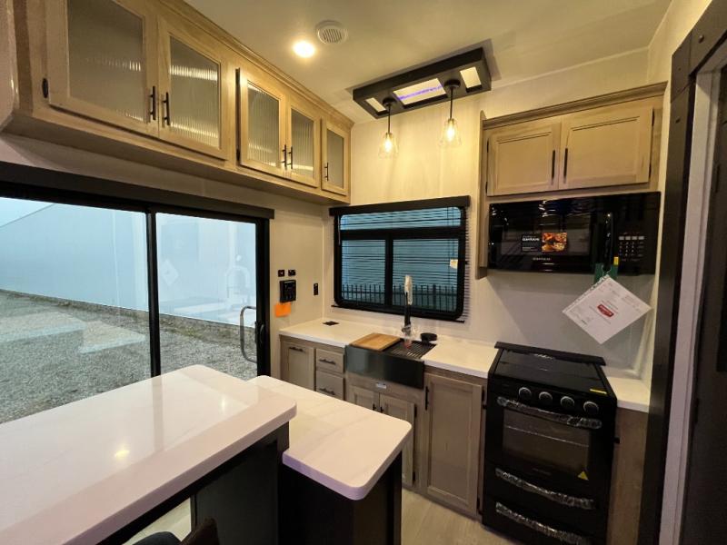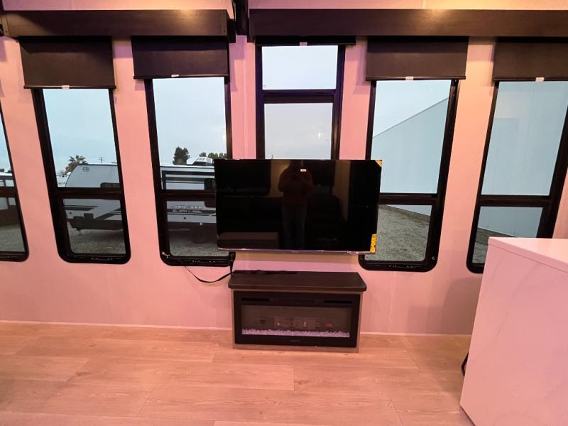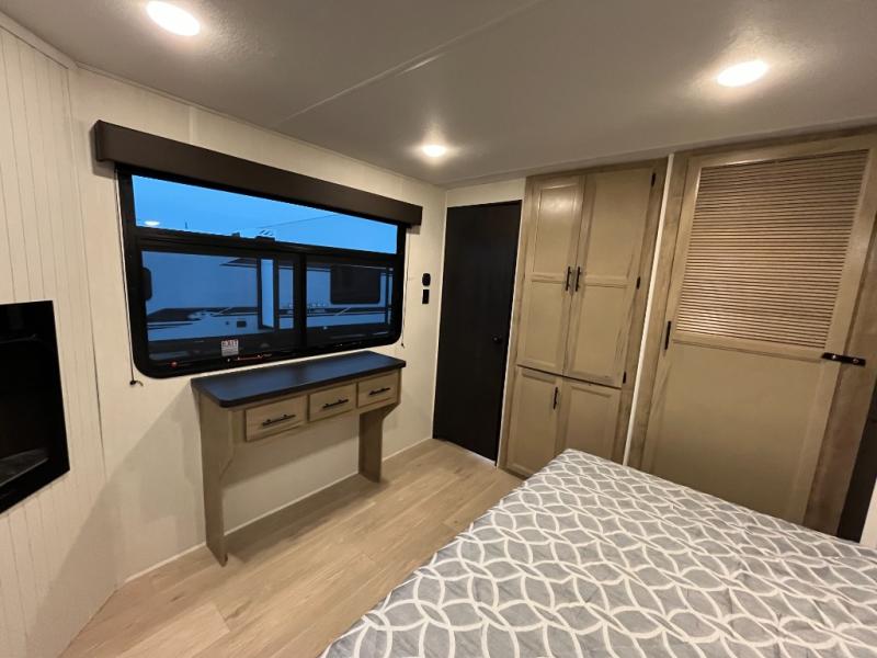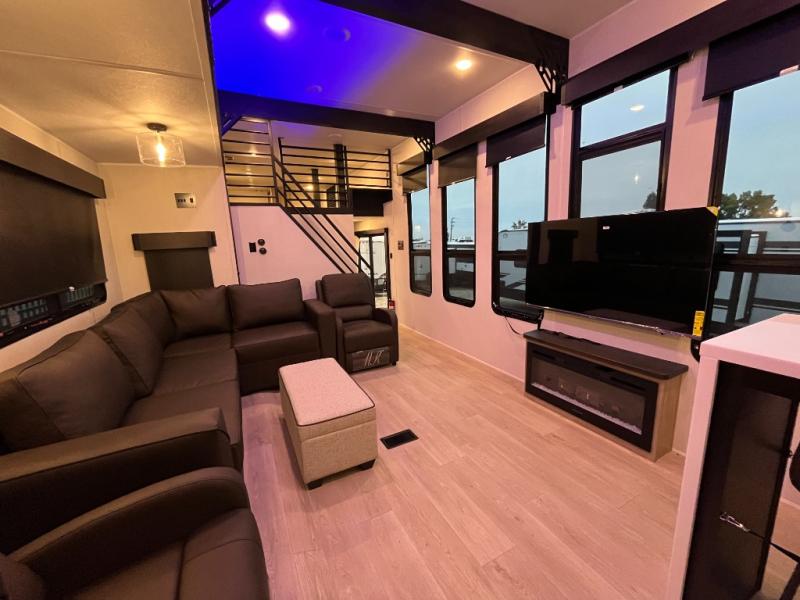 Time spent in this destination trailer will be time well spent! You will appreciate dual entry doors for maximum convenience, plus a spacious full bath that is close by the front private bedroom! Your crew can relax in the middle living area on the L-shaped hide-a-bed sofa or on the two lounge chairs. The rear kitchen will be any chef's dream with its island with six stools and all the appliances to create meals each day. This model also features triple slides so you can enjoy more space to relax. The front bedroom includes a king bed slide out, a desk with drawers, and a bedroom fireplace. And above this room is where you'll find the spacious loft with two bunk mats, storage, and space for the little ones to play!