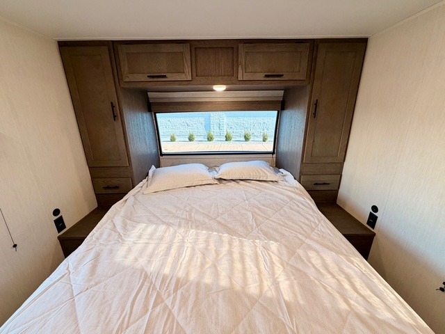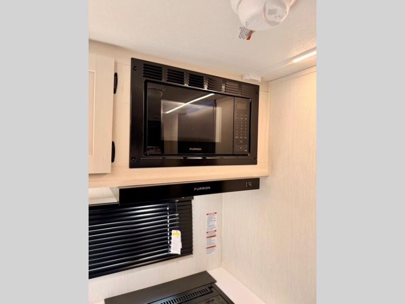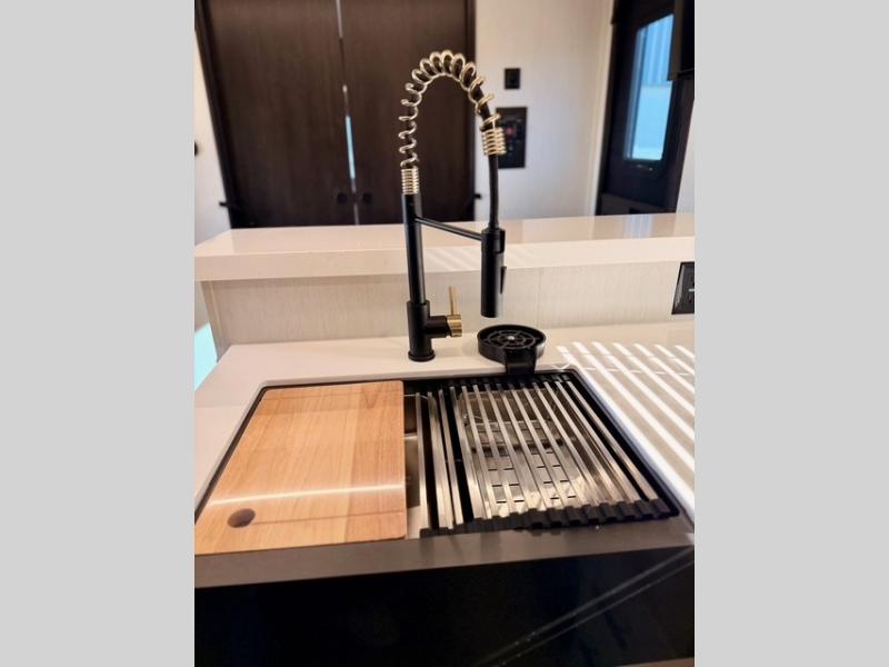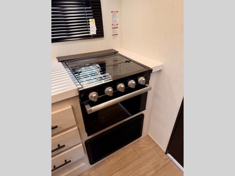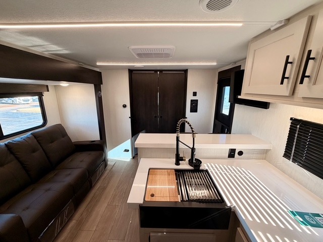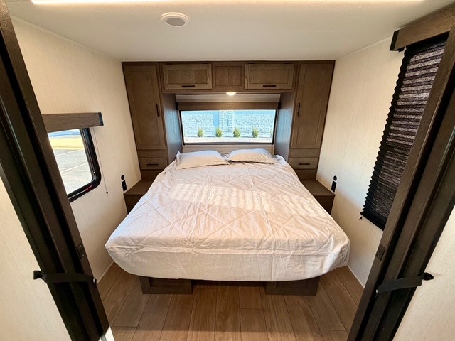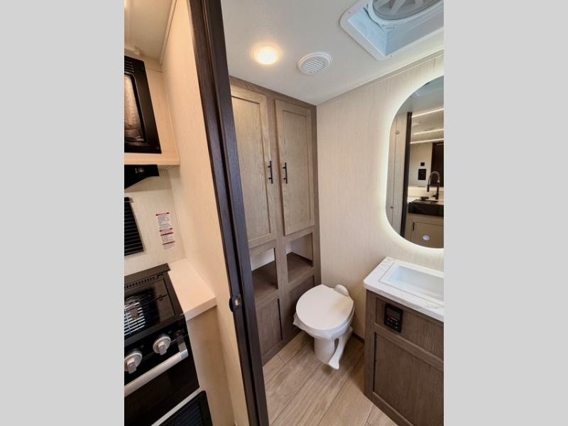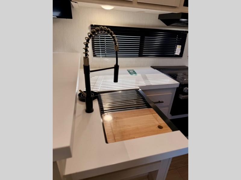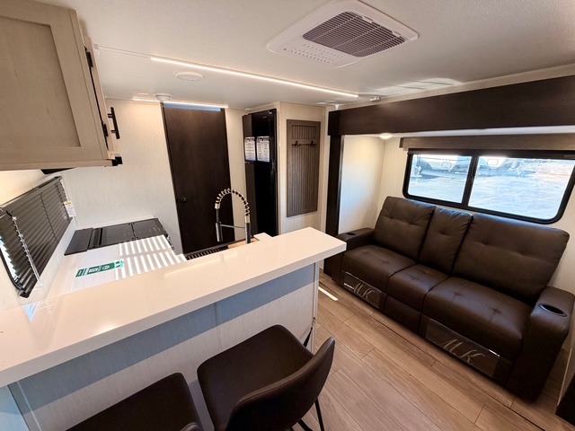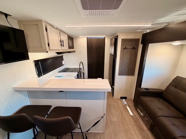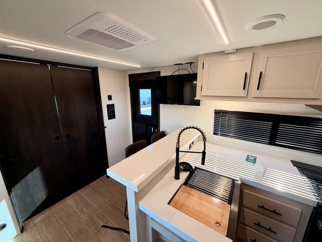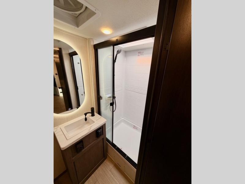 The L-shaped kitchen is a model of convenience, where solid-surface countertops, a three-burner range, and a 10 cu. ft. 12V refrigerator make meal prep quick and easy. The farm-style sink, complete with a cup washer and helpful accessories, adds both charm and modern utility, while the unique bar top with chairs provides an ideal spot to dine or plan out your day’s adventures. At the rear, the full bathroom awaits with a generous linen closet, an ample shower with a glass door, and a porcelain stool toilet, ensuring you enjoy home-like comfort and total privacy.