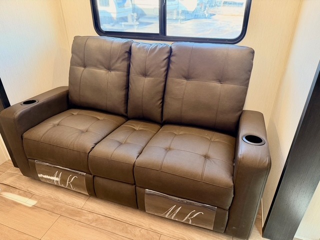 At the front of this travel trailer, a private bedroom with sliding doors offers a peaceful retreat, featuring a comfortable 60" x 80" residential queen bed and ample storage with dual wardrobes and overhead cabinets. Moving into the center, the living area opens up with plush theater seating housed in a slide-out, creating a spacious feel and a cozy place to relax across from the entertainment center.