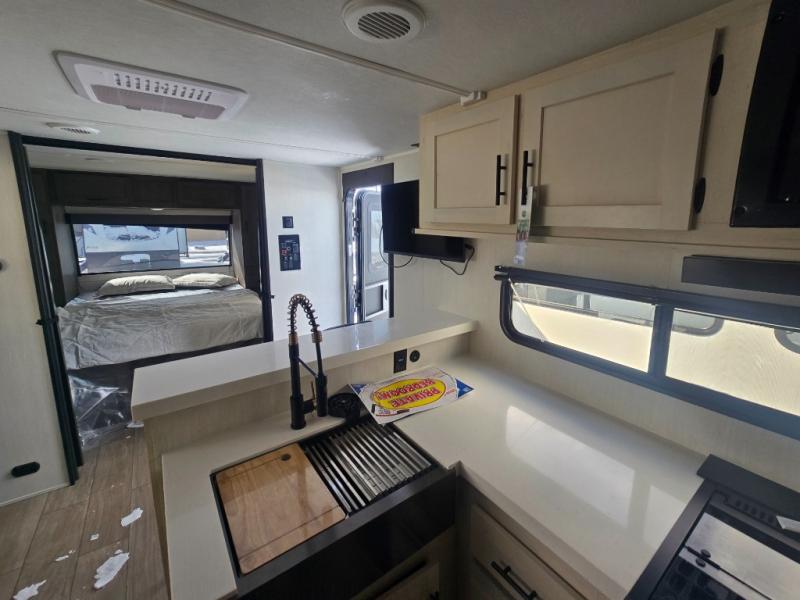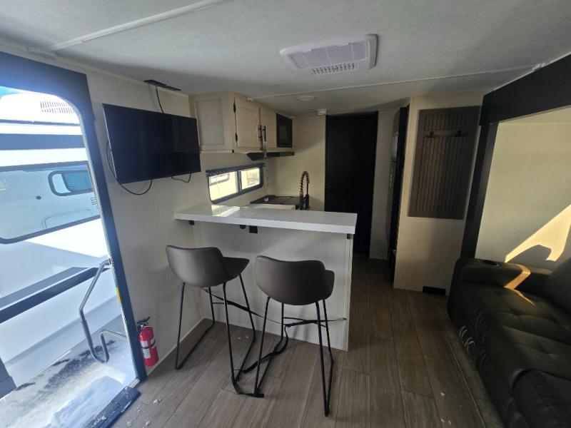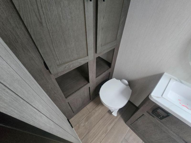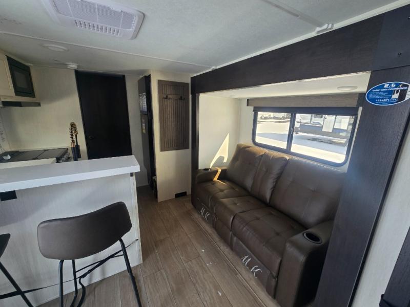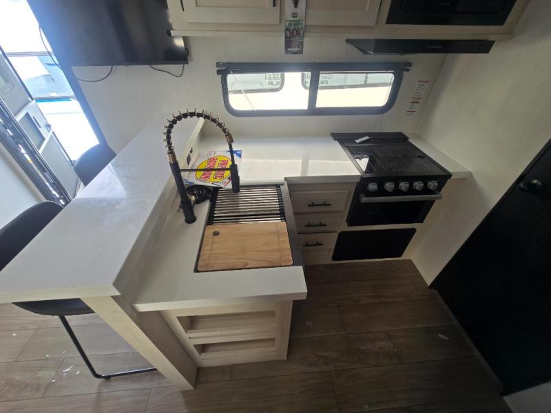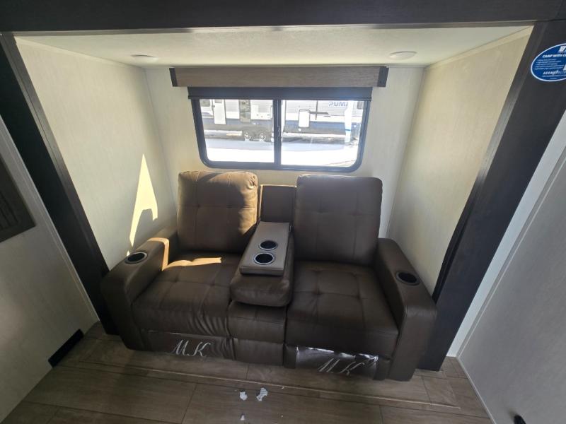 At the front of this travel trailer, a private bedroom with sliding doors offers a peaceful retreat, featuring a comfortable 60" x 80" queen bed and ample storage with dual wardrobes and overhead cabinets for all your essentials. Moving into the center, the living and kitchen area opens up with theater seating housed in a slide-out, creating a spacious feel and a cozy place to relax. Across from it sits the L-shaped kitchen, where solid-surface countertops, a three-burner range, microwave, and 10 cu. ft. refrigerator make meal prep quick and easy. The farm-style sink, complete with a cup washer and helpful accessories, adds both charm and convenience, while the bar top with chairs provides an ideal spot to dine or plan out your day’s adventures. At the rear, the full bathroom awaits with a generous linen closet, an ample shower, and a porcelain stool toilet so you can enjoy comfort and privacy without relying on campsite facilities.