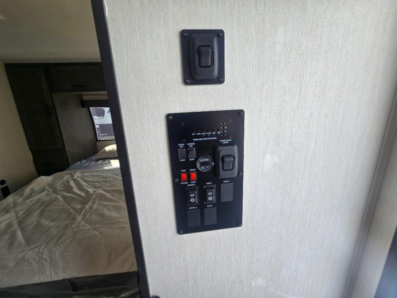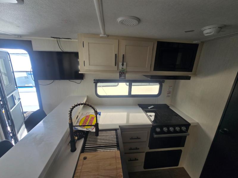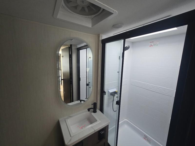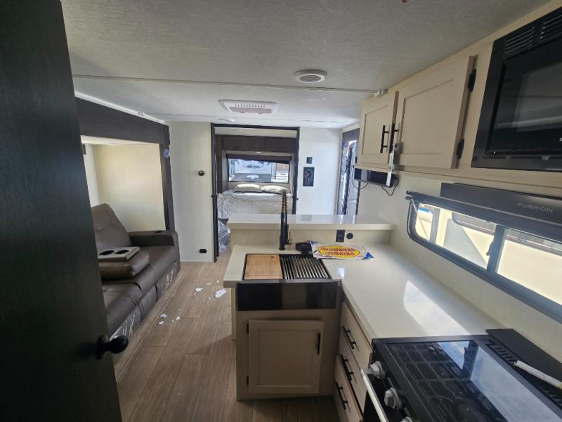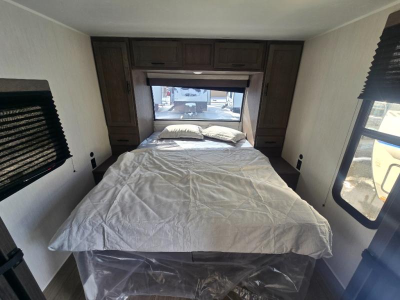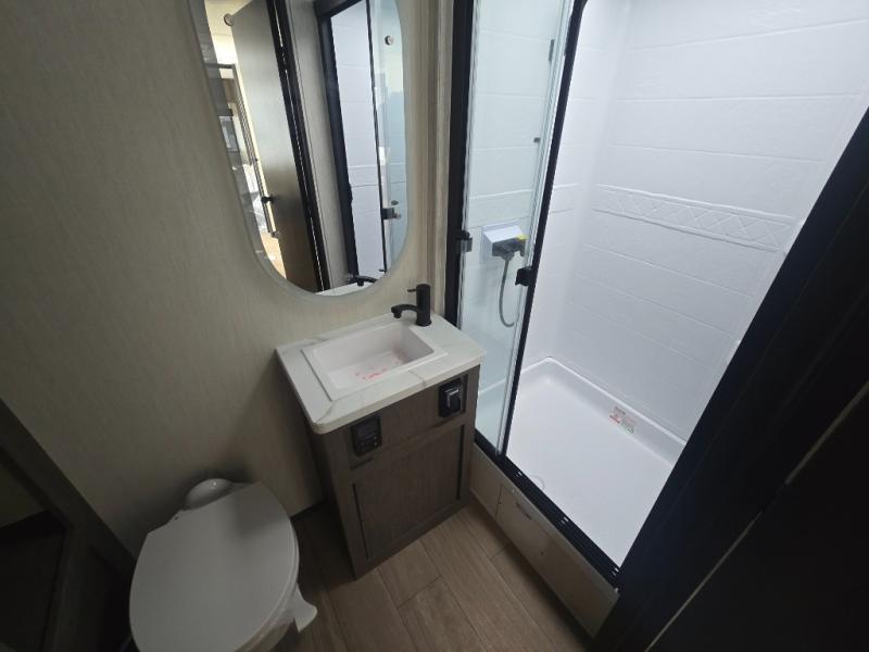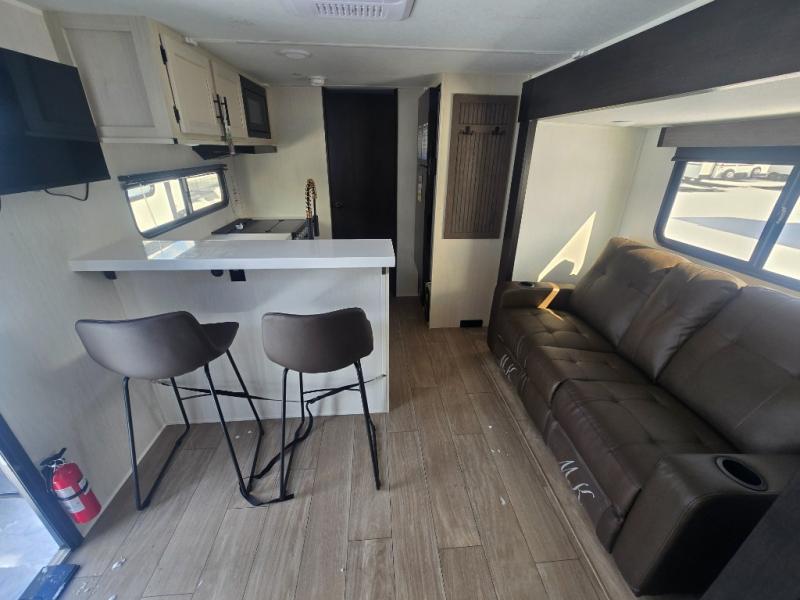 At the front of this travel trailer, a private bedroom with sliding doors offers a peaceful retreat, featuring a comfortable 60" x 80" queen bed and ample storage with dual wardrobes and overhead cabinets for all your essentials. Moving into the center, the living and kitchen area opens up with theater seating housed in a slide-out, creating a spacious feel and a cozy place to relax. Across from it sits the L-shaped kitchen, where solid-surface countertops, a three-burner range, microwave, and 10 cu. ft. refrigerator make meal prep quick and easy. The farm-style sink, complete with a cup washer and helpful accessories, adds both charm and convenience, while the bar top with chairs provides an ideal spot to dine or plan out your day’s adventures. At the rear, the full bathroom awaits with a generous linen closet, an ample shower, and a porcelain stool toilet so you can enjoy comfort and privacy without relying on campsite facilities.