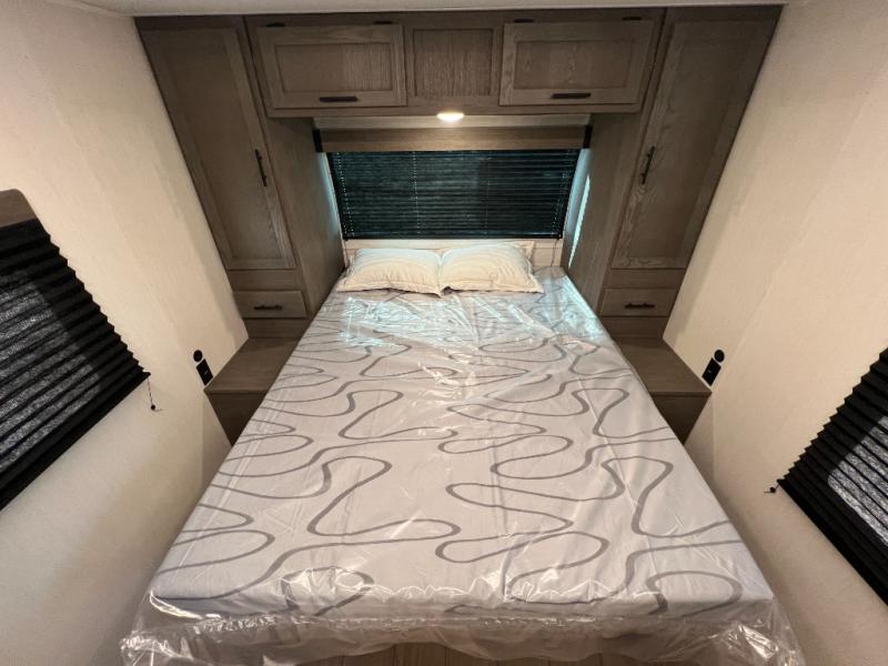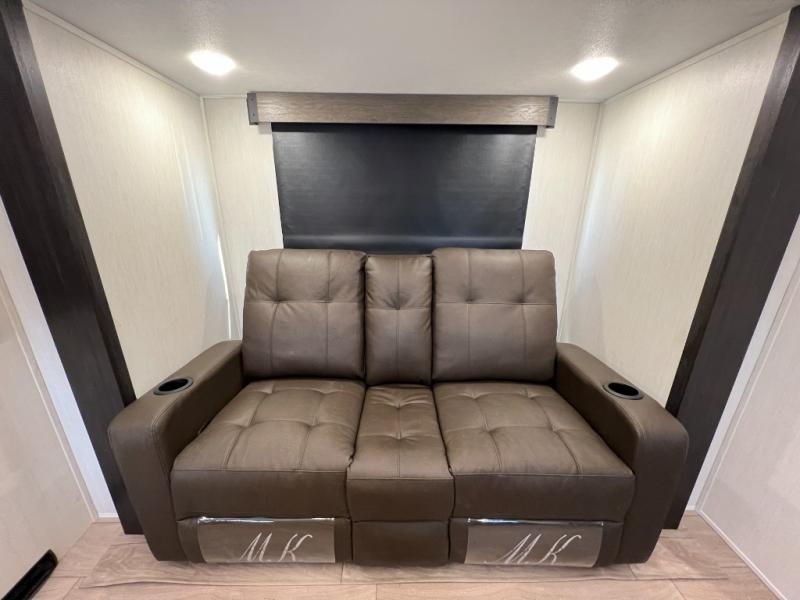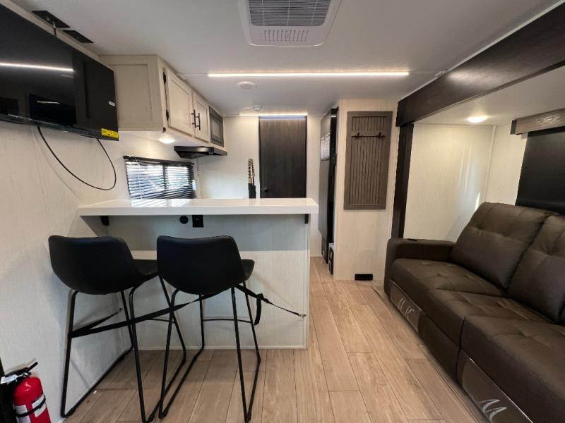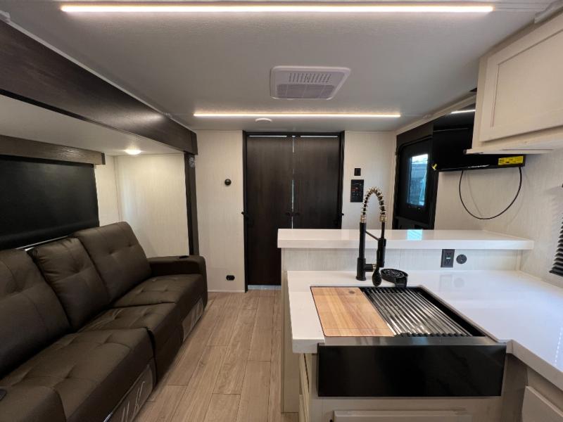 At the front of this travel trailer, a private bedroom with sliding doors offers a peaceful retreat, featuring a comfortable 60" x 80" queen bed and ample storage with dual wardrobes and overhead cabinets for all your essentials. Moving into the center, the living and kitchen area opens up with theater seating housed in a slide-out, creating a spacious feel and a cozy place to relax. Across from it sits the L-shaped kitchen, where solid-surface countertops, a three-burner range, microwave, and 10 cu. ft. refrigerator make meal prep quick and easy. The farm-style sink, complete with a cup washer and helpful accessories, adds both charm and convenience, while the bar top with chairs provides an ideal spot to dine or plan out your day’s adventures. At the rear, the full bathroom awaits with a generous linen closet, an ample shower, and a porcelain stool toilet so you can enjoy comfort and privacy without relying on campsite facilities.