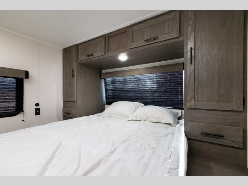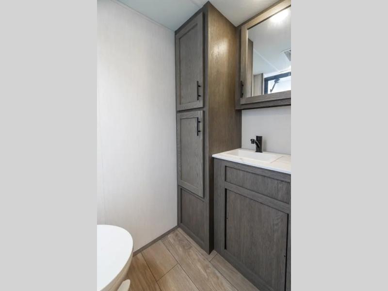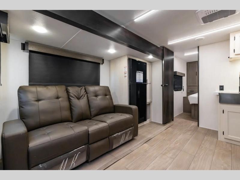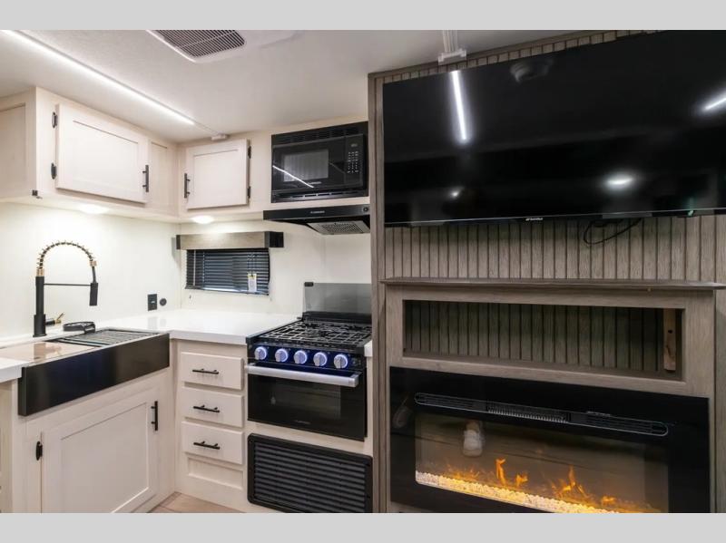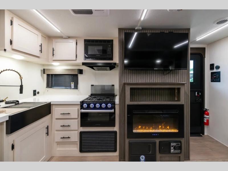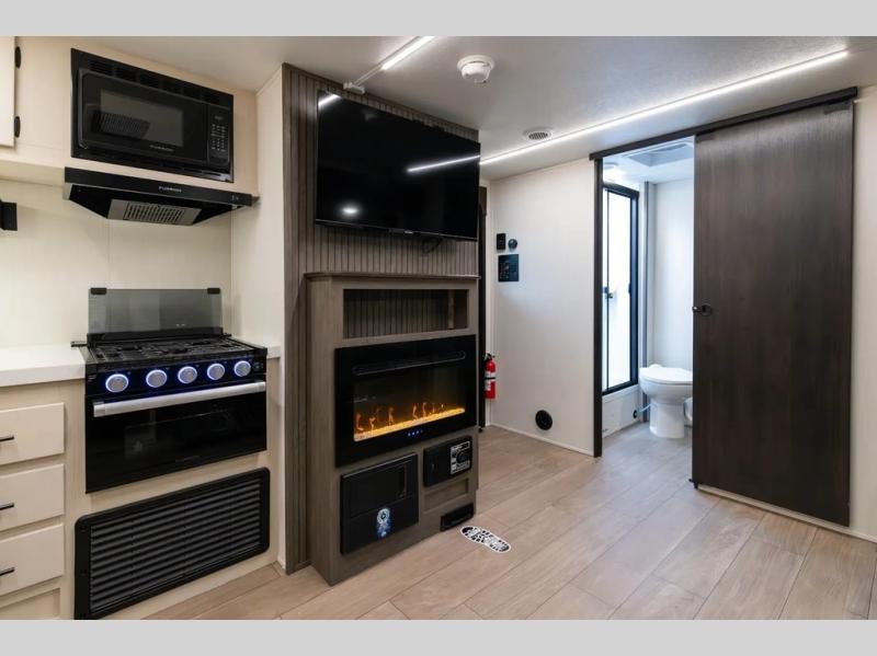 Looking for the perfect trailer for two with a spacious bathroom and bedroom? This Alpha Wolf provides a rear oversized bathroom complete with linen storage and a sliding door that saves space and looks great. The front bedroom includes a walk-around queen bed, dual wardrobes, a sliding door plus windows for natural lighting and great views. The main living and kitchen area is spacious as well with a large slide out that includes theater seating with a removable table across from the entertainment center with a fireplace, a 12V residential style refrigerator for lots of cold storage, and a pantry for your snacks and dry goods. You can decide to cook indoors on the three burner cooktop, or head outdoors to cook on the outside kitchen!