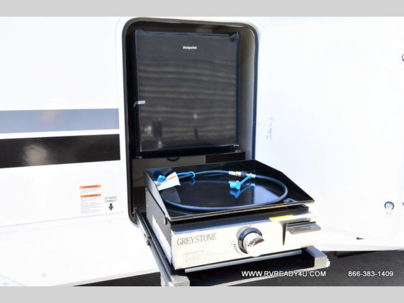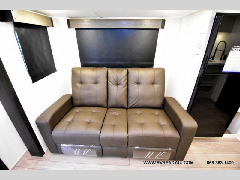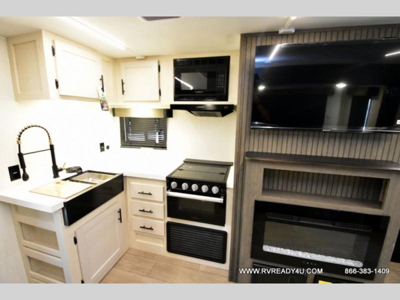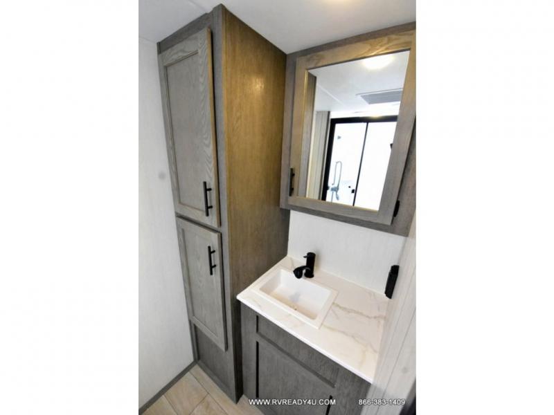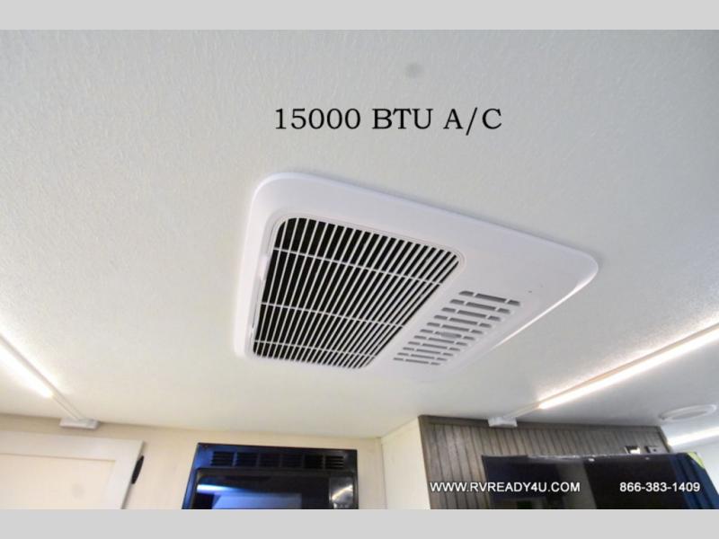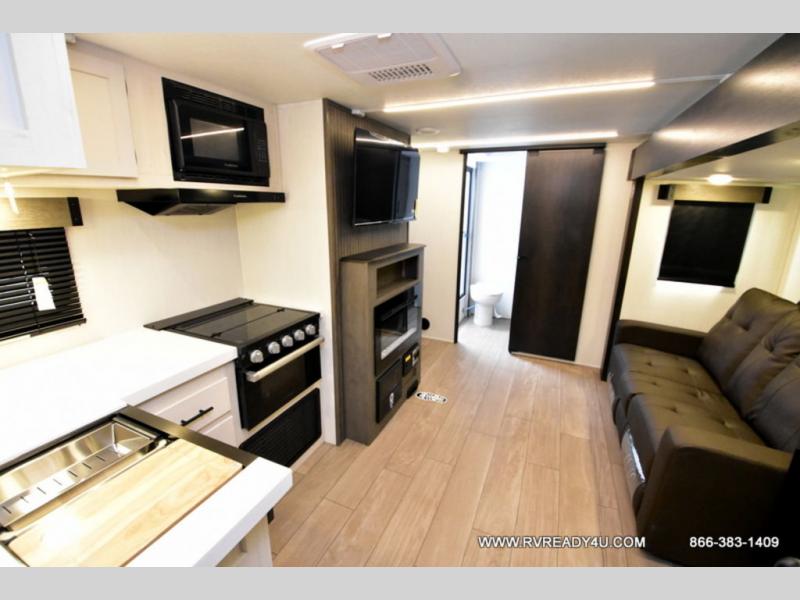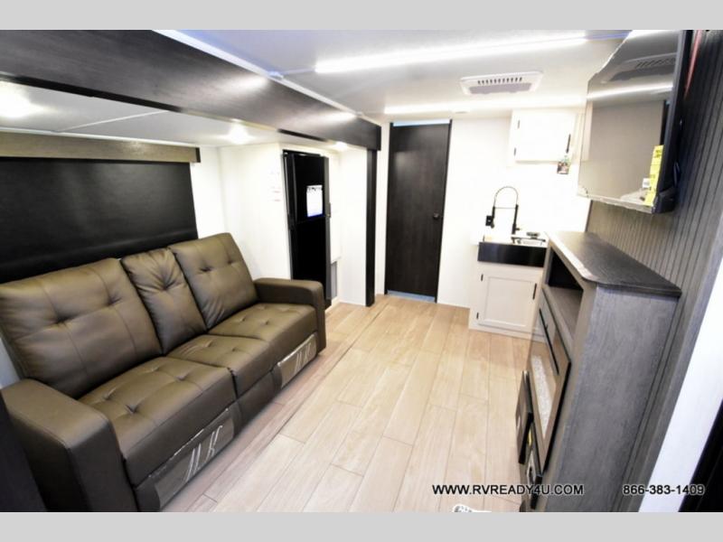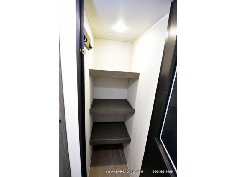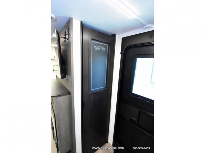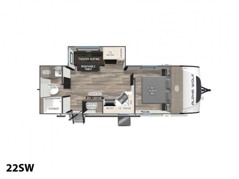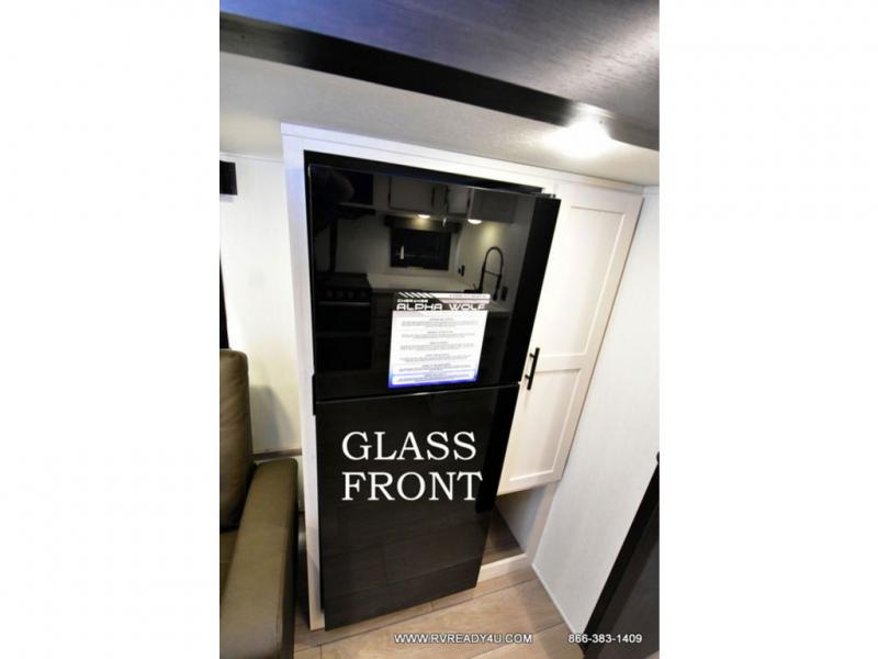 Looking for the perfect trailer for two with a spacious bathroom and bedroom? This Alpha Wolf provides a rear oversized bathroom complete with linen storage and a sliding door that saves space and looks great. The front bedroom includes a walk-around queen bed, dual wardrobes, a sliding door plus windows for natural lighting and great views. The main living and kitchen area is spacious as well with a large slide out that includes theater seating with a removable table across from the entertainment center with a fireplace, a 12V residential style refrigerator for lots of cold storage, and a pantry for your snacks and dry goods. You can decide to cook indoors on the three burner cooktop, or head outdoors to cook on the outside kitchen!