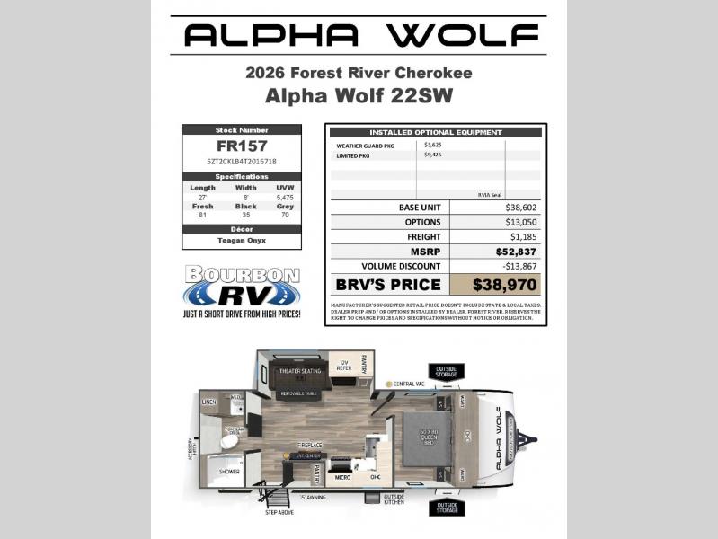New 2026 Forest River RV Cherokee Alpha Wolf 22SW Travel Trailer