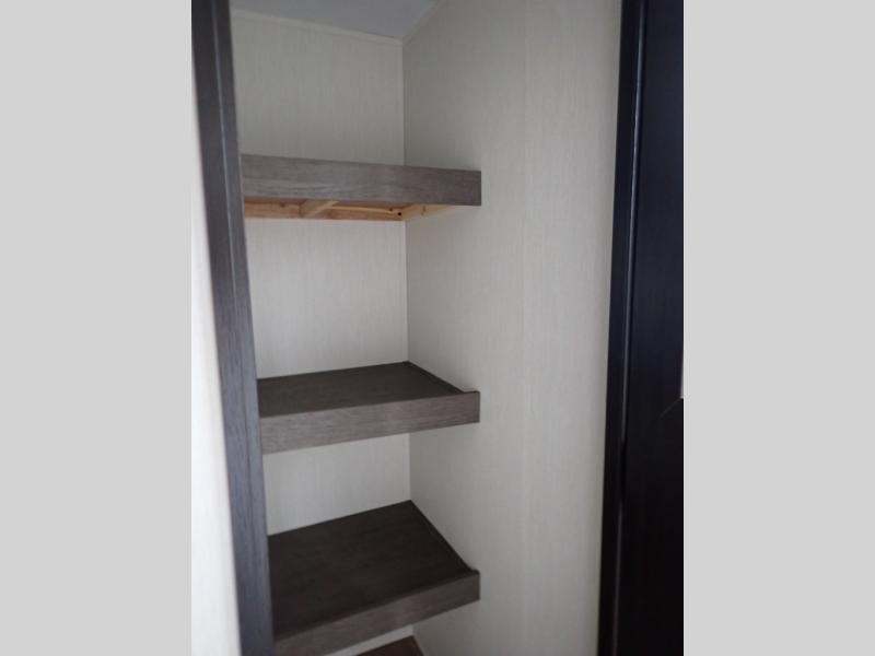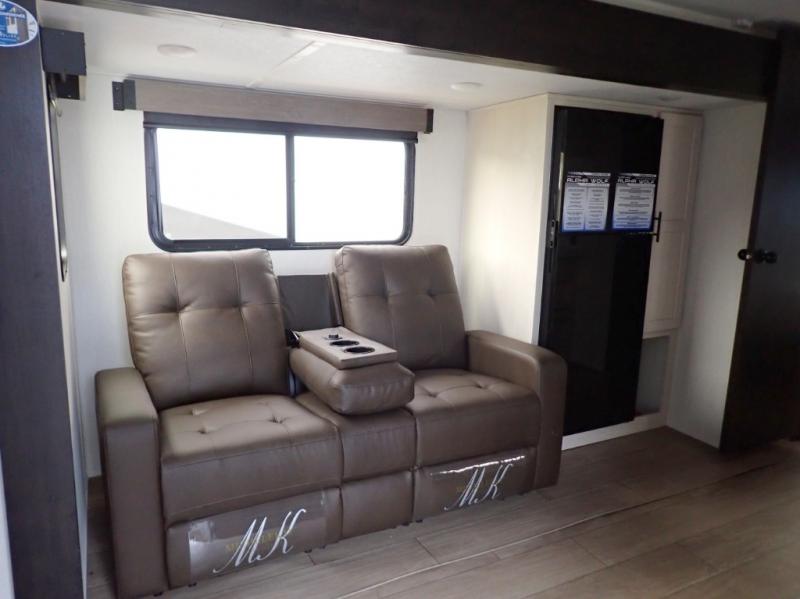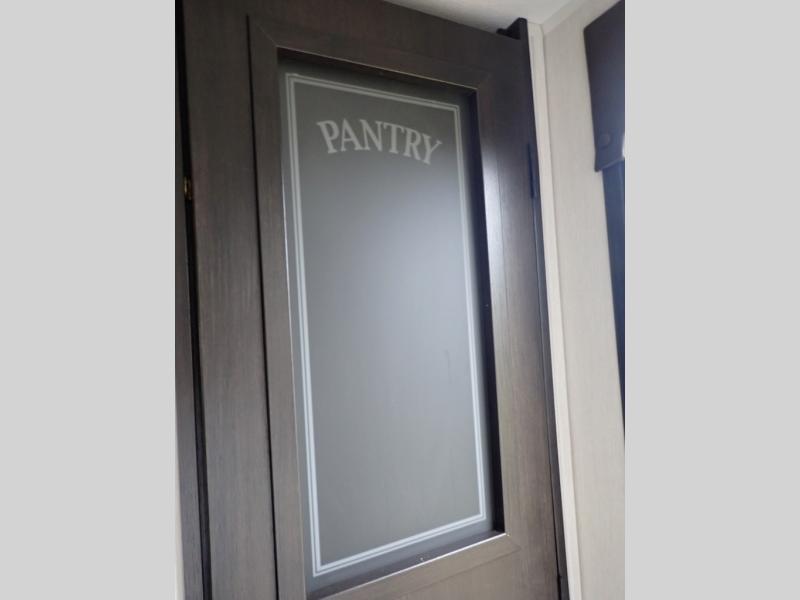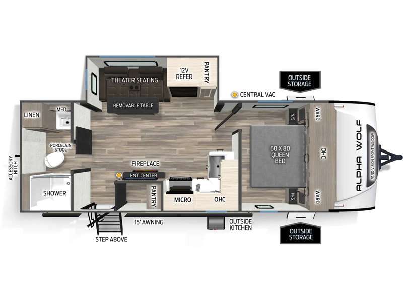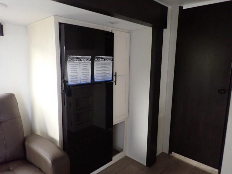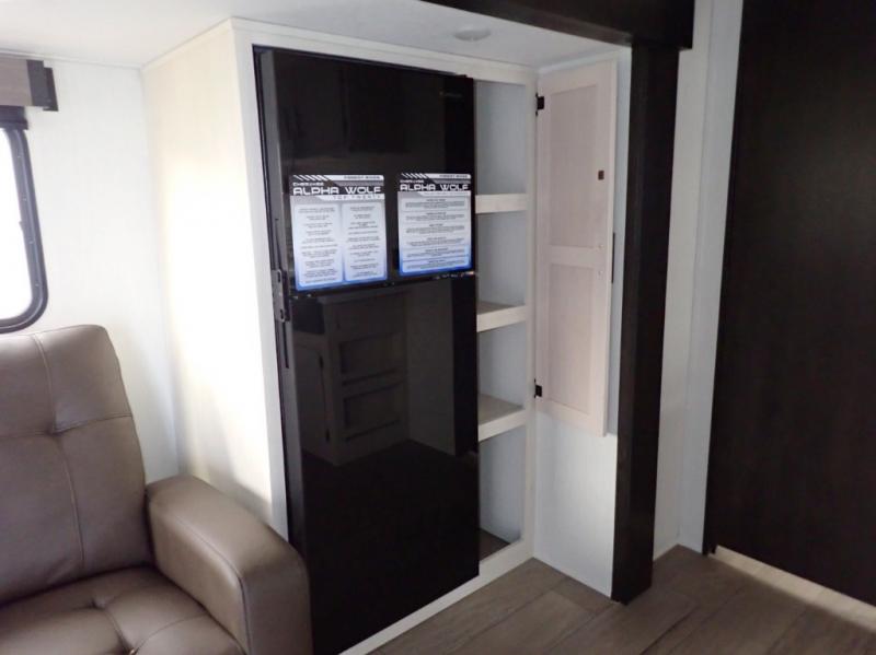 Looking for the perfect trailer for two with a spacious bathroom and bedroom? This Alpha Wolf provides a rear oversized bathroom complete with linen storage and a sliding door that saves space and looks great. The front bedroom includes a walk-around queen bed, dual wardrobes, a sliding door plus windows for natural lighting and great views. The main living and kitchen area is spacious as well with a large slide out that includes theater seating with a removable table across from the entertainment center with a fireplace, a 12V residential style refrigerator for lots of cold storage, and a pantry for your snacks and dry goods. You can decide to cook indoors on the three burner cooktop, or head outdoors to cook on the outside kitchen!