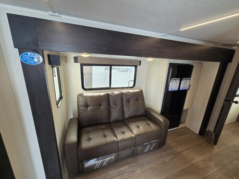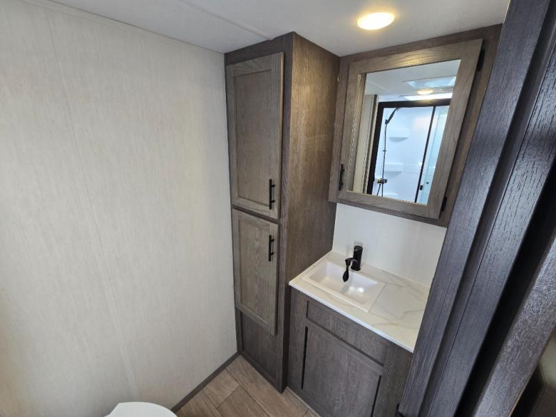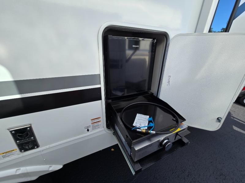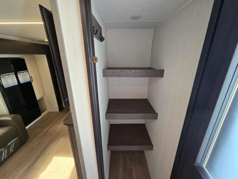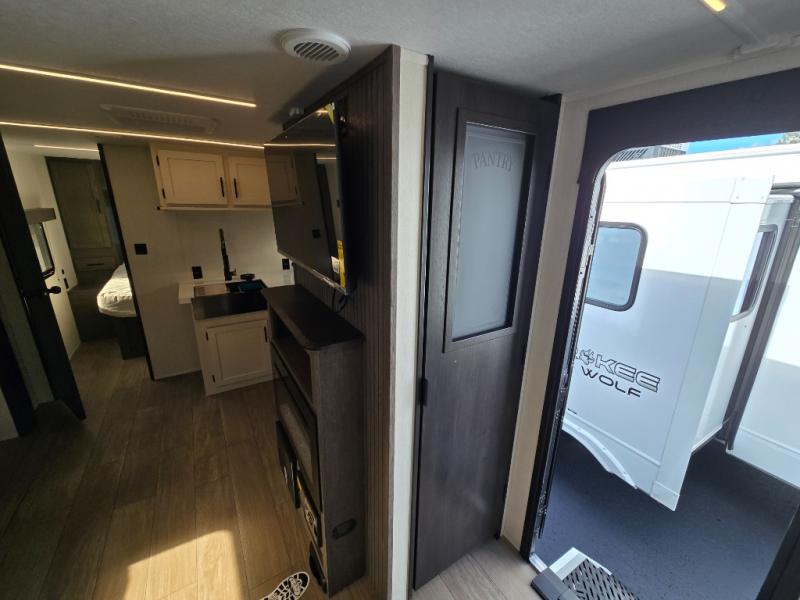 Looking for the perfect trailer for two with a spacious bathroom and bedroom? This Alpha Wolf provides a rear oversized bathroom complete with linen storage and a sliding door that saves space and looks great. The front bedroom includes a walk-around queen bed, dual wardrobes, a sliding door plus windows for natural lighting and great views. The main living and kitchen area is spacious as well with a large slide out that includes theater seating with a removable table across from the entertainment center with a fireplace, a 12V residential style refrigerator for lots of cold storage, and a pantry for your snacks and dry goods. You can decide to cook indoors on the three burner cooktop, or head outdoors to cook on the outside kitchen!
