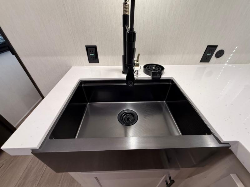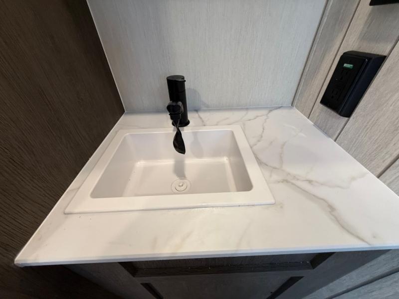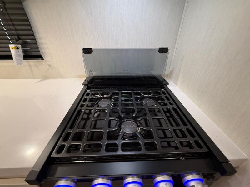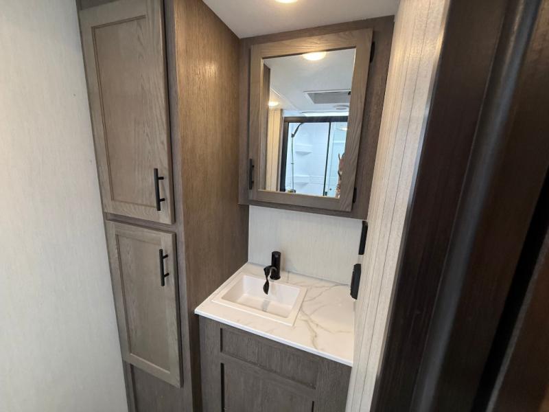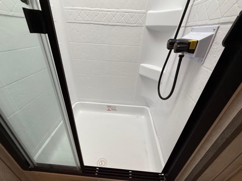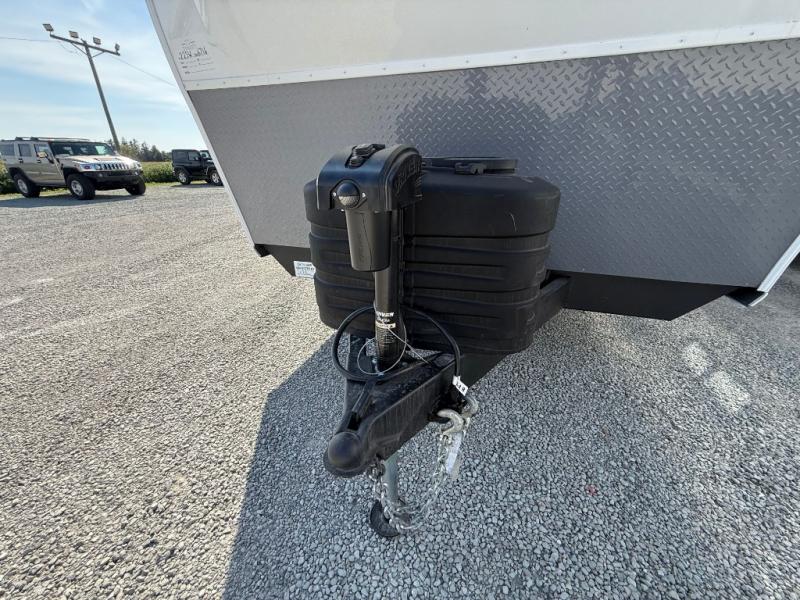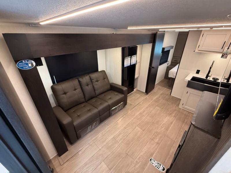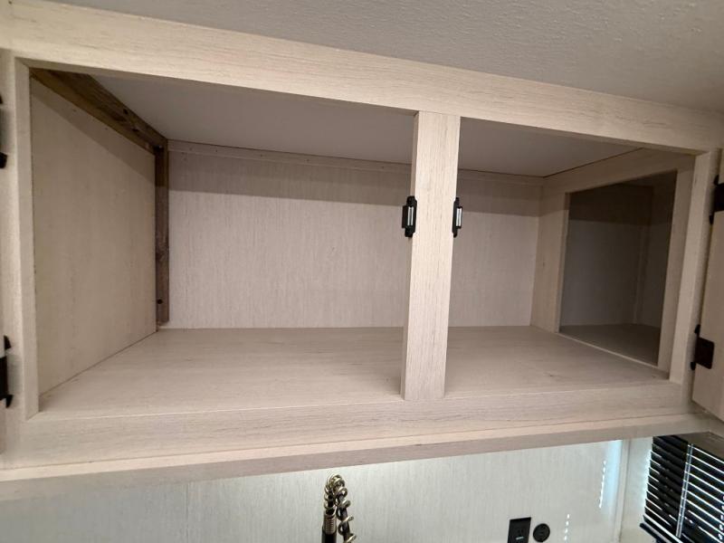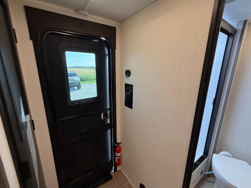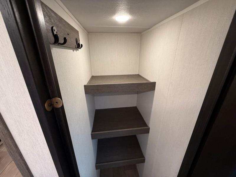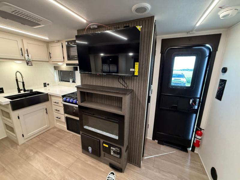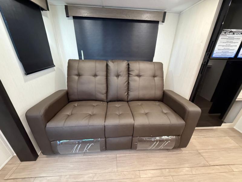 Looking for the perfect trailer for two with a spacious bathroom and bedroom? This Alpha Wolf provides a rear oversized bathroom complete with linen storage and a sliding door that saves space and looks great. The front bedroom includes a walk-around queen bed, dual wardrobes, a sliding door plus windows for natural lighting and great views. The main living and kitchen area is spacious as well with a large slide out that includes theater seating with a removable table across from the entertainment center with a fireplace, a 12V residential style refrigerator for lots of cold storage, and a pantry for your snacks and dry goods. You can decide to cook indoors on the three burner cooktop, or head outdoors to cook on the outside kitchen!