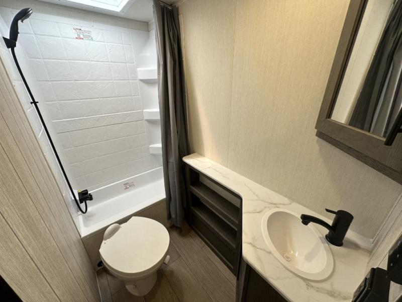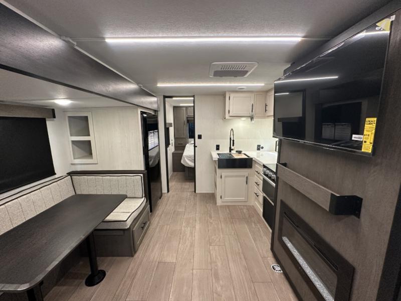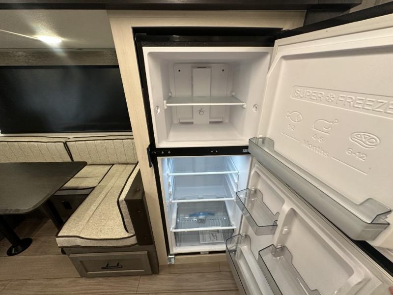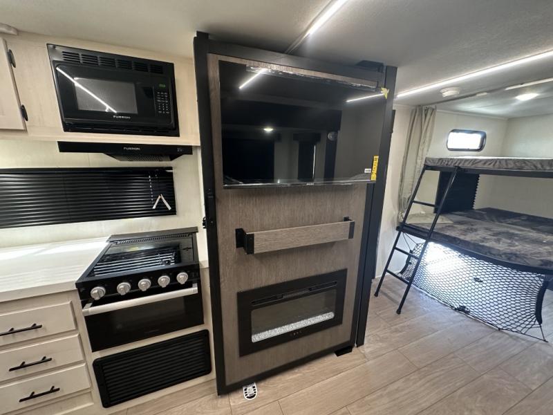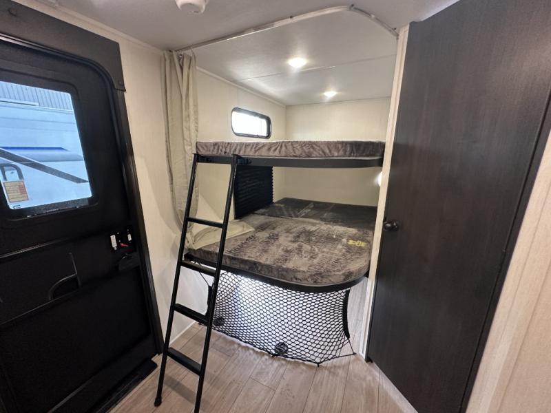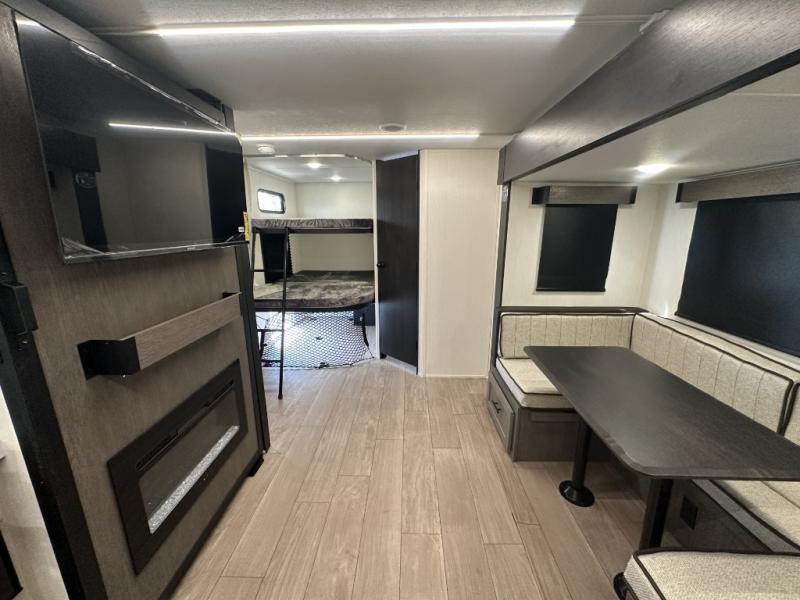 Make your dream of adventure a reality! This incredible travel trailer is perfect for creating lifelong memories with family and friends. The fun begins with the removable and stackable double-size bunk beds, ideal for kids or adults alike. The full bathroom provides convenience and comfort, making it easy to get ready for a day of exploration. The U-shaped dinette is a cozy spot for meals or relaxation while enjoying the amazing entertainment center. Plus, the kitchen area is equipped with a refrigerator, pantry storage, and microwave, making it easy to enjoy your favorite snacks and meals on the go. The 12V refrigerator keeps your food and drinks fresh, and the overhead cabinet provides additional storage for cookware and dishes.The front bedroom features a spacious queen bed, convenient nightstands, a stylish wardrobe, and overhead cabinets for storing your belongings and keeping everything organized.